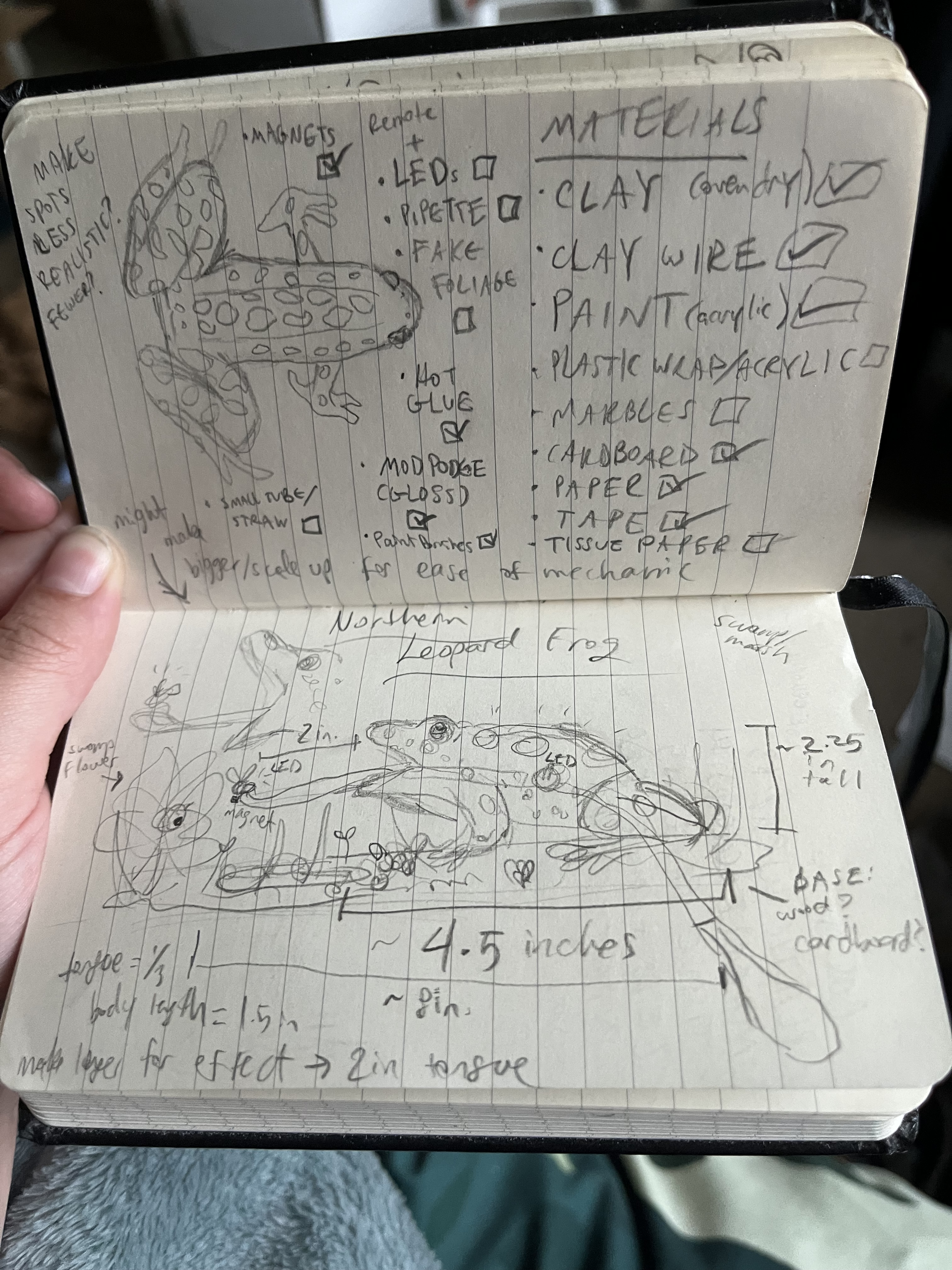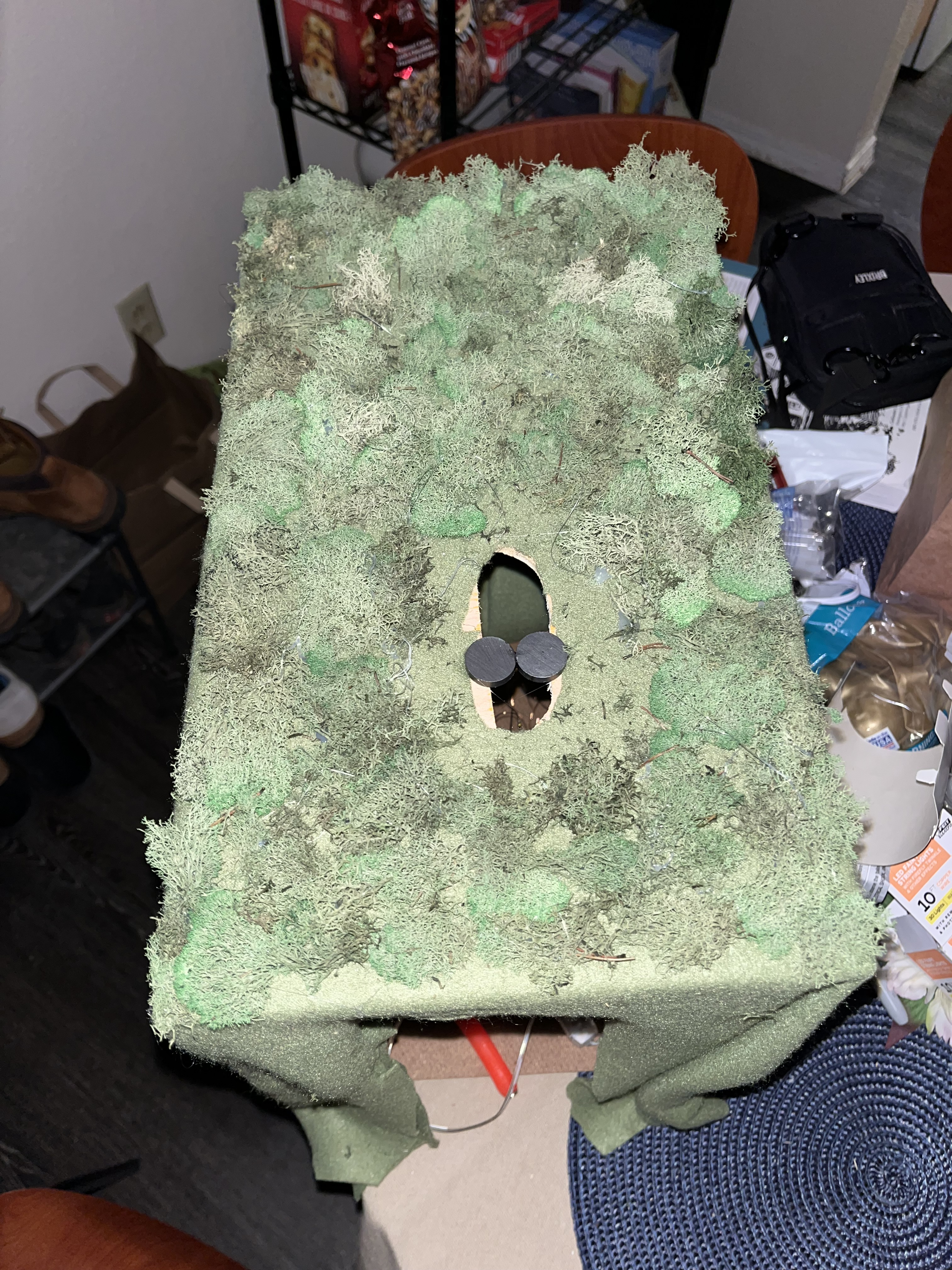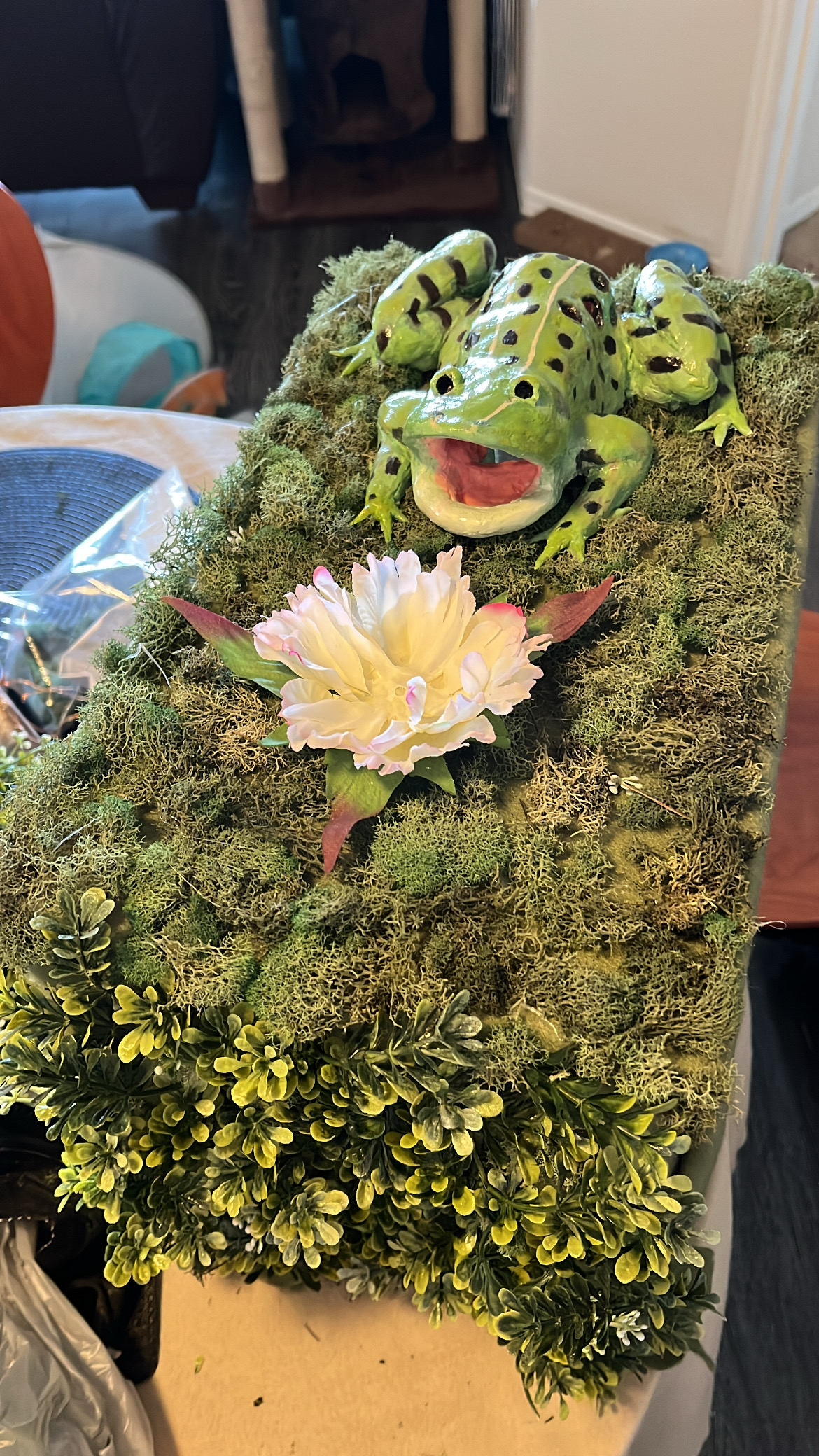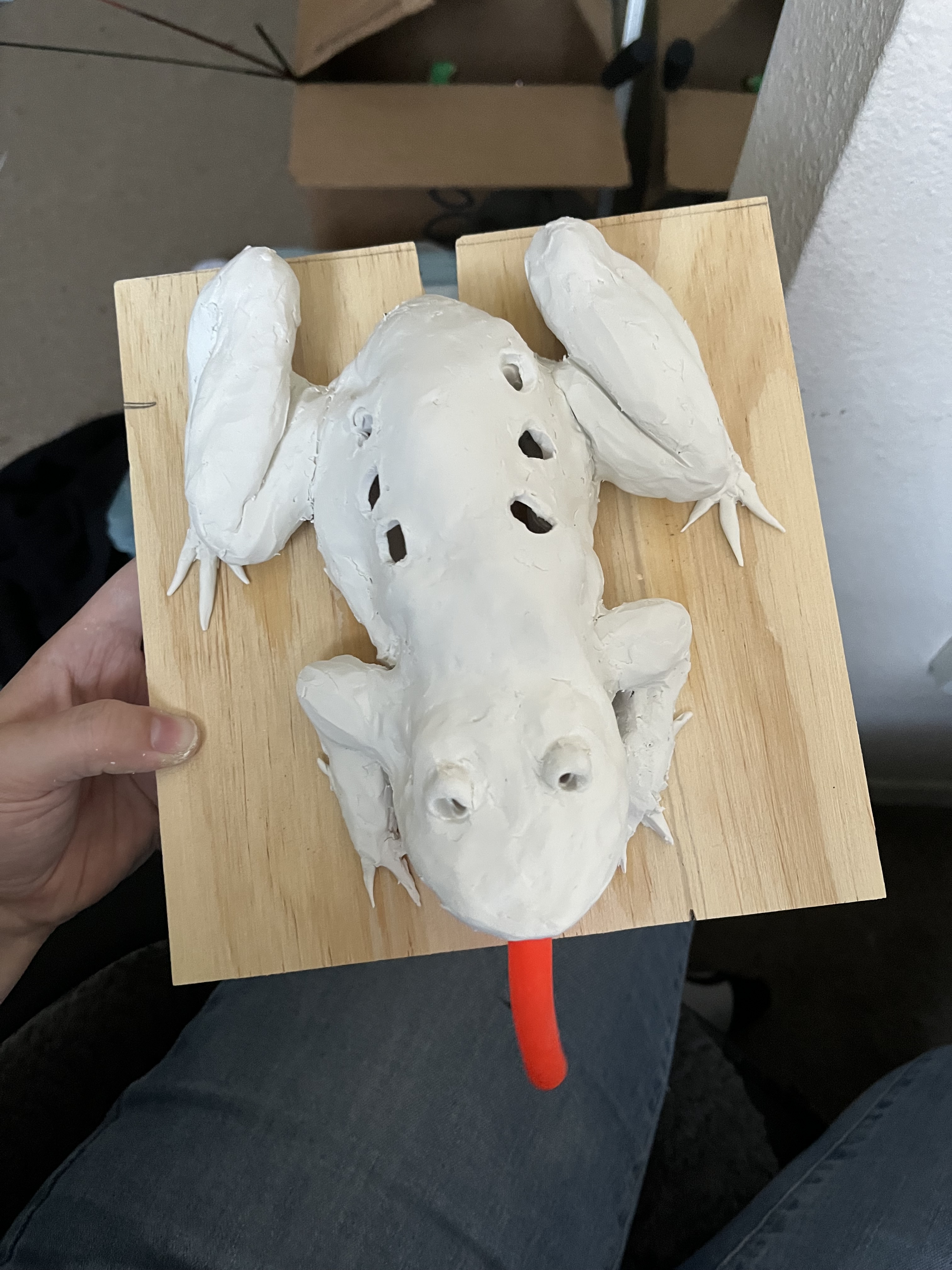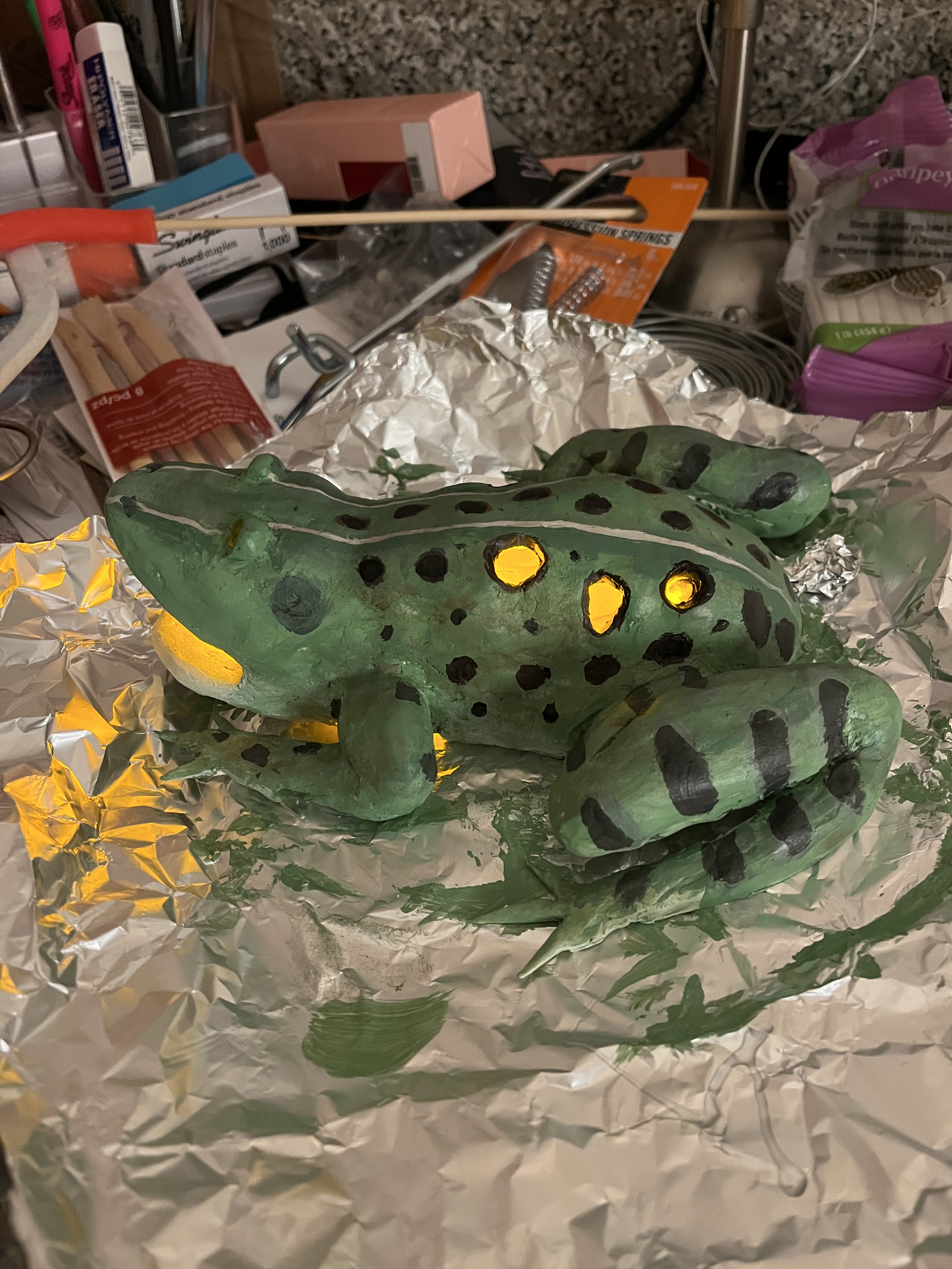 Our final project assignment was to build a prop that can do something, such as light up, make a sound, transform, move, create smoke, etc. I decided to build a frog out of wire and clay with an opening through its belly as well as some holes on top. The frog was painted with acrylic paint and coated with glossy Mod Podge and clear nail polish topper. It sat on top of a wooden structure with a hole cut out with a jigsaw to match the hole in the frog. I used a silicone “stretchy string” toy as the tongue with a skewer in it on one side and a magnet attached onto the tip. I bought small yellow LED lights that looked like fireflies. The magnet would grab the bug and pull it in with the skewer through the hole in the structure. From there, stronger magnets could catch the LED light, holding it in the belly and glowing through the holes of the frog. Black fabric was attached to the inside of the wood covering as much of the opening as possible so that the light wouldn’t show through the fabric. Green fabric was attached to the wood with a staple gun with a technique similar to upholstery. Fake moss, leaves, and a flower were glued onto the fabric. The LED bug sat on the flower, and with my hand hidden inside the box, I maneuvered the tongue to grab the bug and pull it inside.