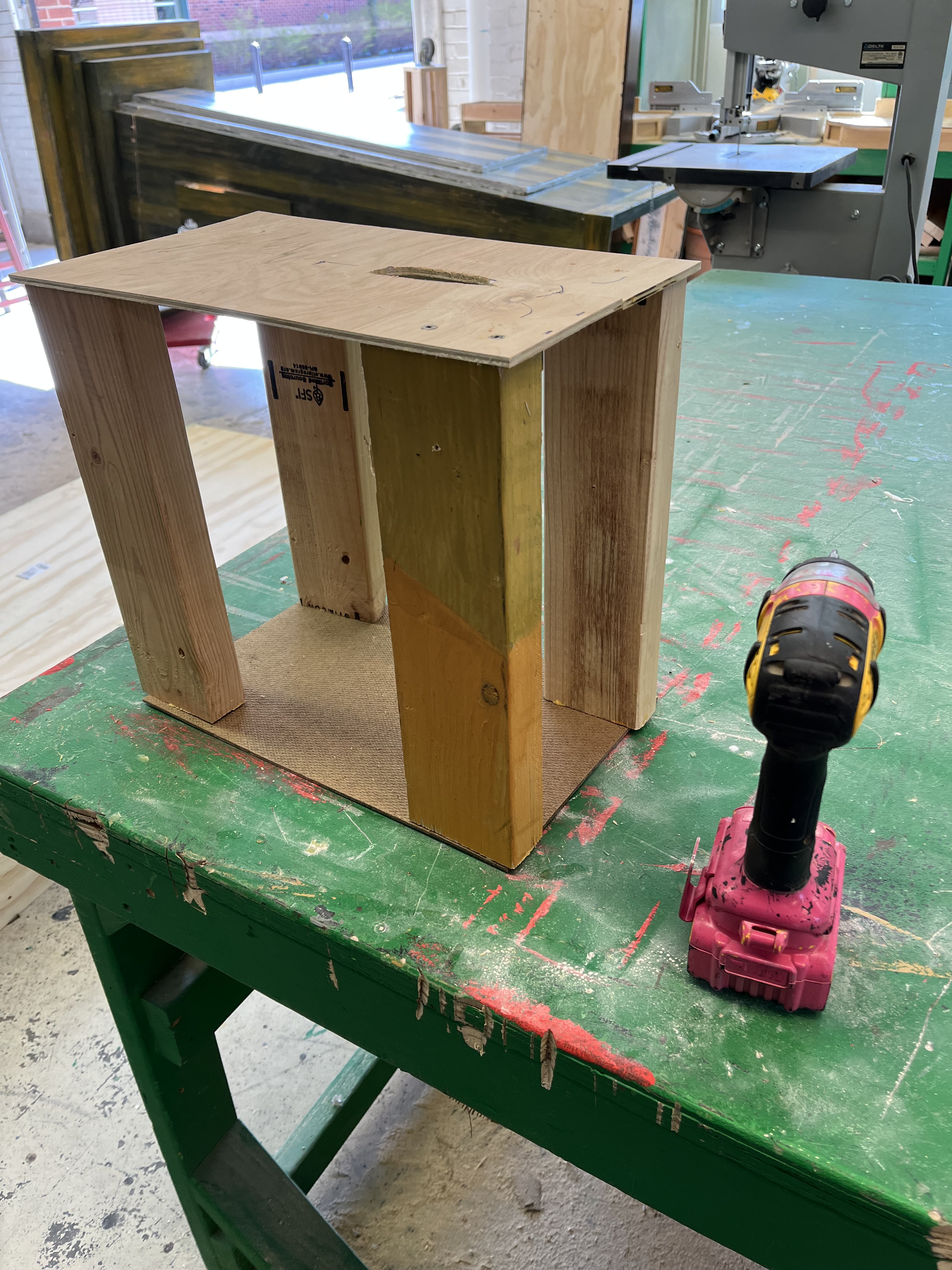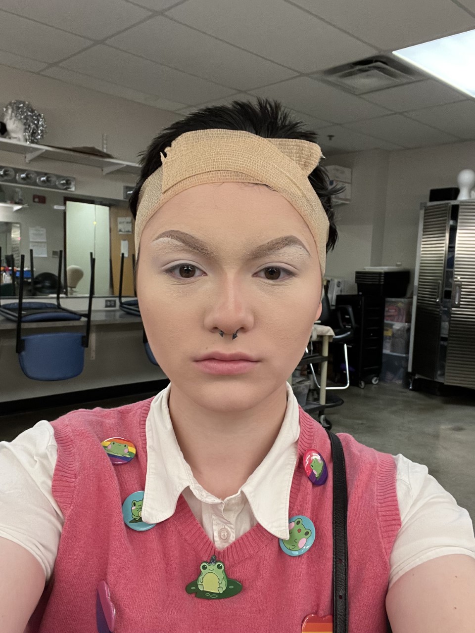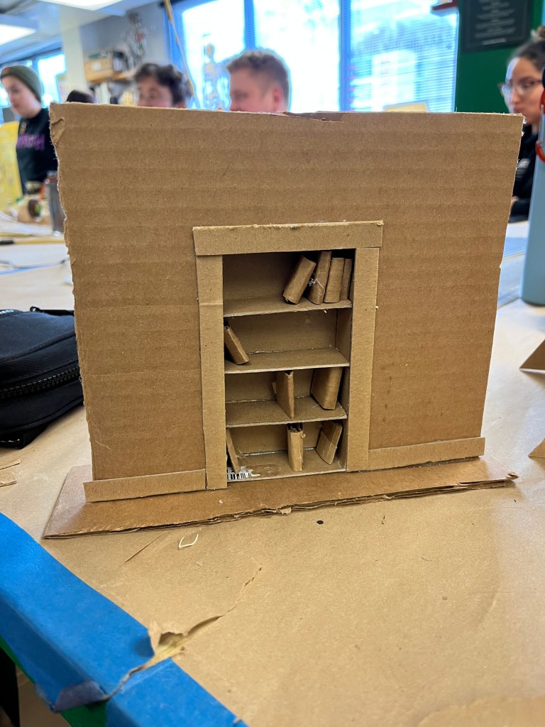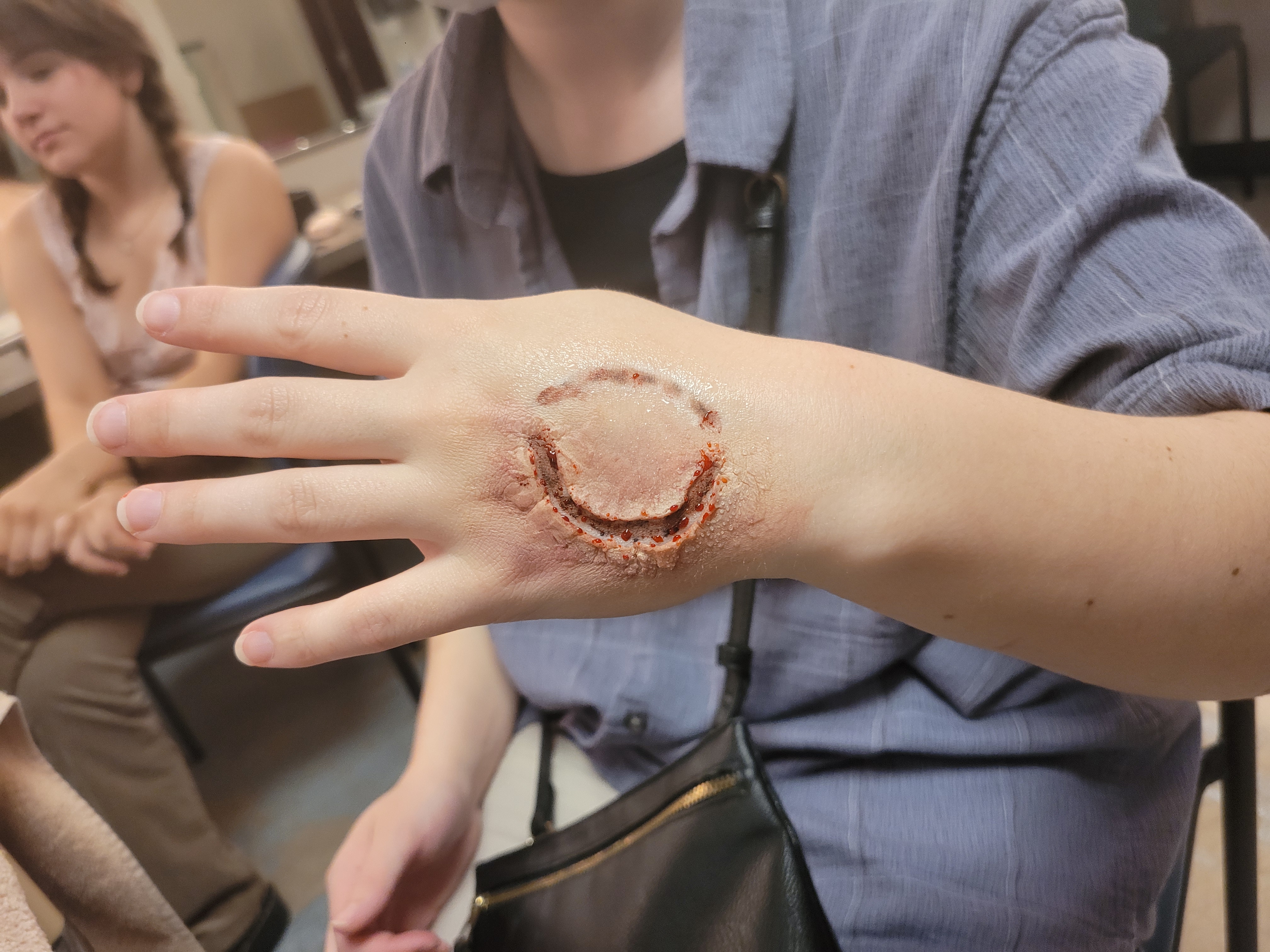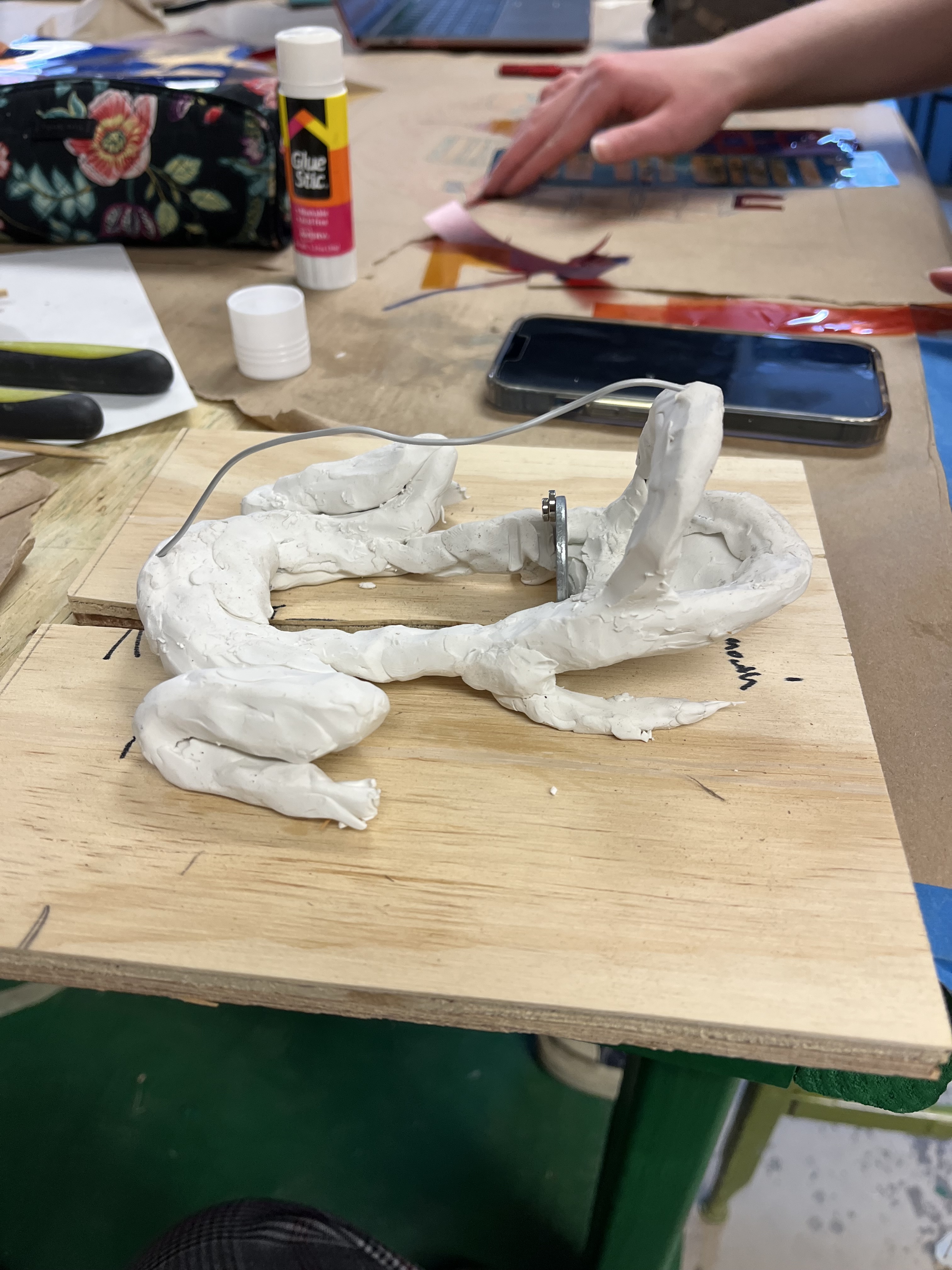 Our final project assignment was to build a prop that can do something, such as light up, make a sound, transform, move, create smoke, etc. I decided to build a frog out of wire and clay with an opening through its belly as well as some holes on top. The frog was painted with acrylic paint and coated with glossy Mod Podge and clear nail polish topper. It sat on top of a wooden structure with a hole cut out with a jigsaw to match the hole in the frog. I used a silicone “stretchy string” toy as the tongue with a skewer in it on one side and a magnet attached onto the tip. I bought small yellow LED lights that looked like fireflies. The magnet would grab the bug and pull it in with the skewer through the hole in the structure. From there, stronger magnets could catch the LED light, holding it in the belly and glowing through the holes of the frog. Black fabric was attached to the inside of the wood covering as much of the opening as possible so that the light wouldn’t show through the fabric. Green fabric was attached to the wood with a staple gun with a technique similar to upholstery. Fake moss, leaves, and a flower were glued onto the fabric. The LED bug sat on the flower, and with my hand hidden inside the box, I maneuvered the tongue to grab the bug and pull it inside.