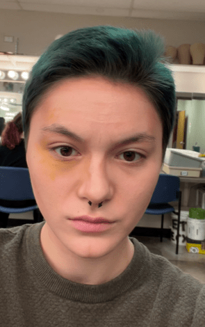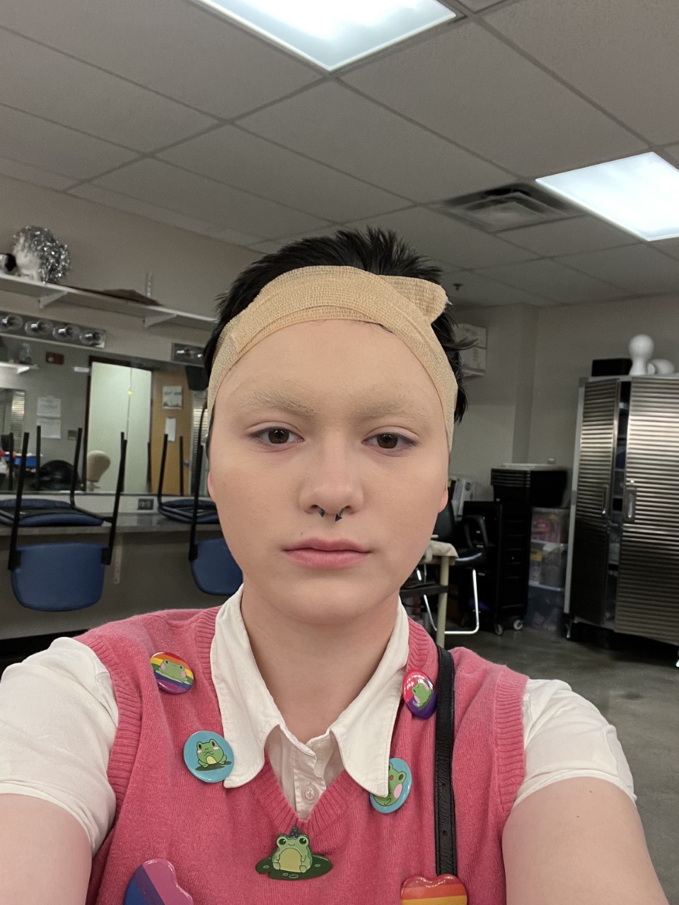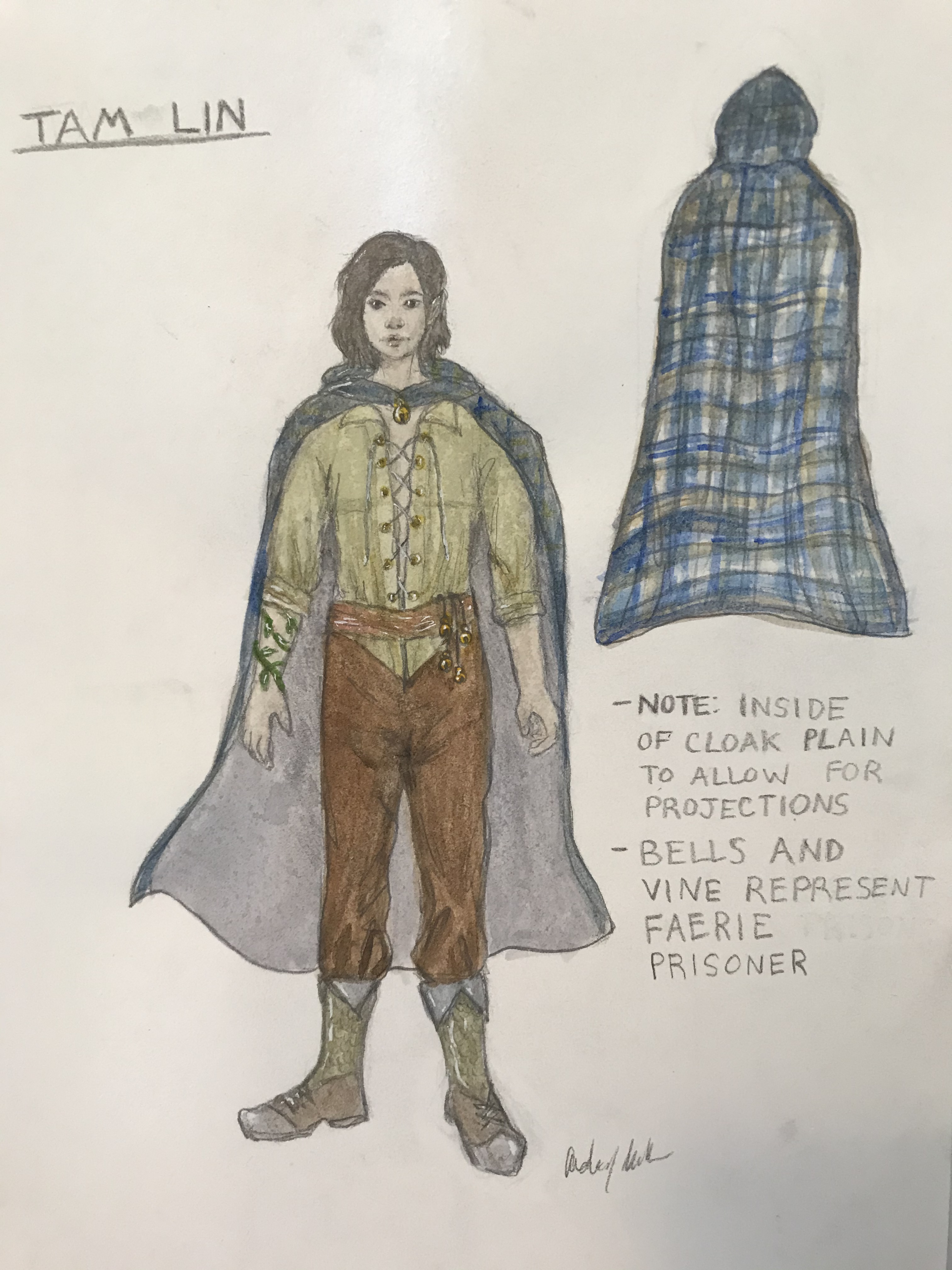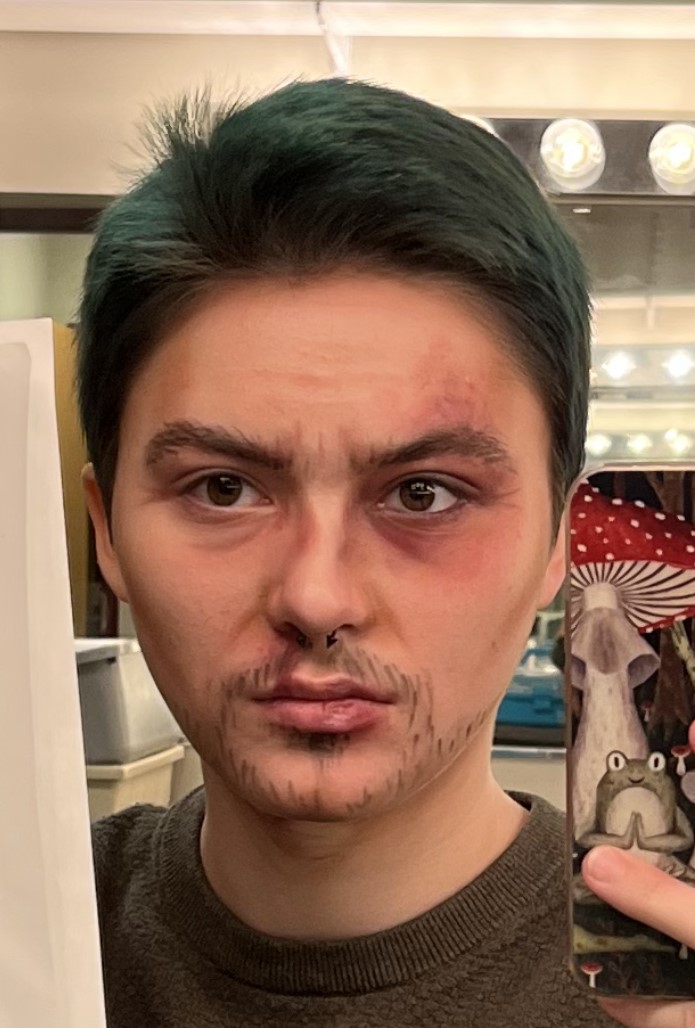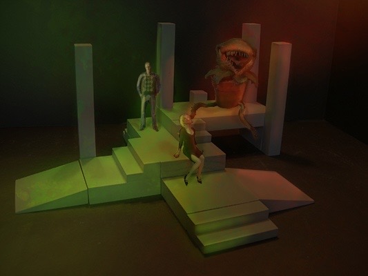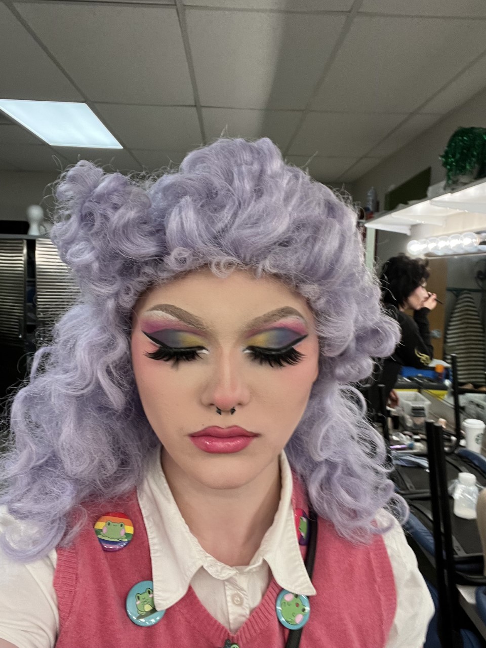 Our final project assignment was to build a prop that can do something, such as light up, make a sound, transform, move, create smoke, etc. I decided to build a frog out of wire and clay with an opening through its belly as well as some holes on top. The frog was painted with acrylic paint and coated with glossy Mod Podge and clear nail polish topper. It sat on top of a wooden structure with a hole cut out with a jigsaw to match the hole in the frog. I used a silicone “stretchy string” toy as the tongue with a skewer in it on one side and a magnet attached onto the tip. I bought small yellow LED lights that looked like fireflies. The magnet would grab the bug and pull it in with the skewer through the hole in the structure. From there, stronger magnets could catch the LED light, holding it in the belly and glowing through the holes of the frog. Black fabric was attached to the inside of the wood covering as much of the opening as possible so that the light wouldn’t show through the fabric. Green fabric was attached to the wood with a staple gun with a technique similar to upholstery. Fake moss, leaves, and a flower were glued onto the fabric. The LED bug sat on the flower, and with my hand hidden inside the box, I maneuvered the tongue to grab the bug and pull it inside.