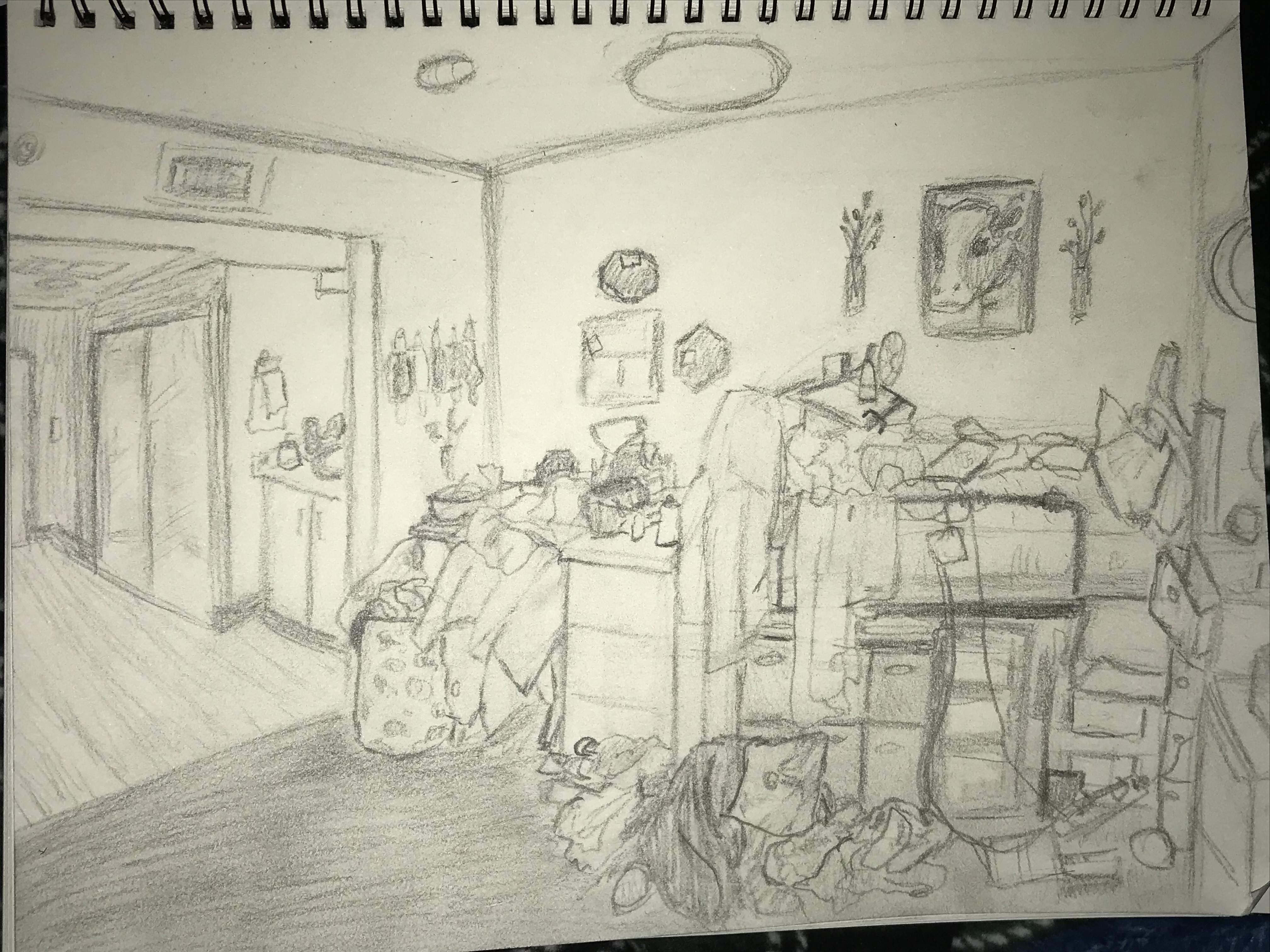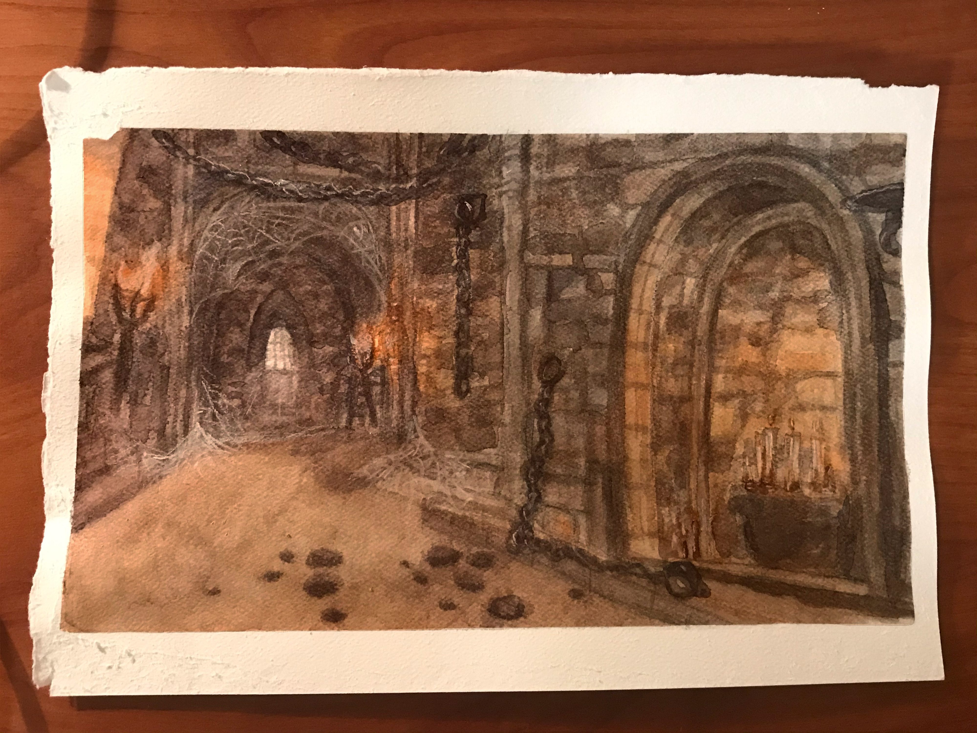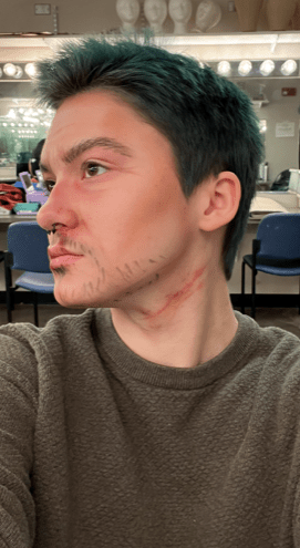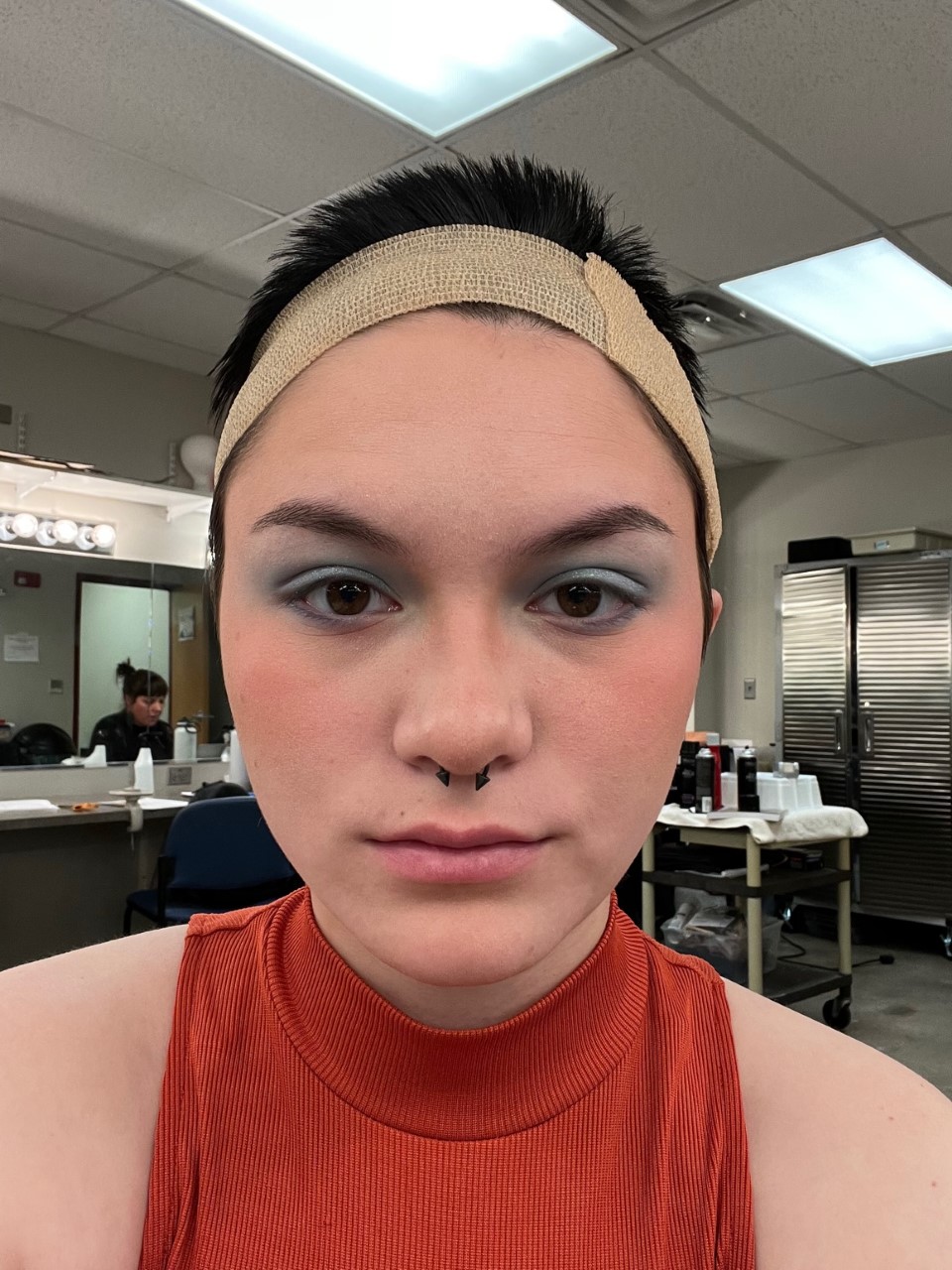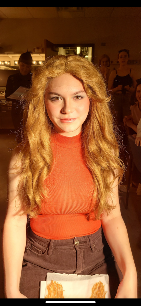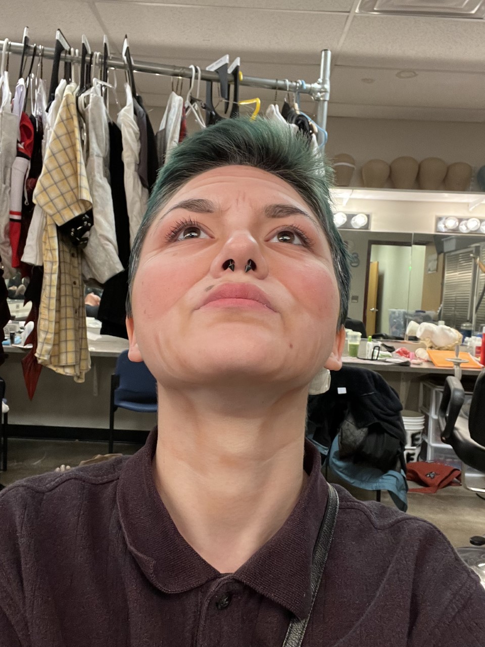 Our final project assignment was to build a prop that can do something, such as light up, make a sound, transform, move, create smoke, etc. I decided to build a frog out of wire and clay with an opening through its belly as well as some holes on top. The frog was painted with acrylic paint and coated with glossy Mod Podge and clear nail polish topper. It sat on top of a wooden structure with a hole cut out with a jigsaw to match the hole in the frog. I used a silicone “stretchy string” toy as the tongue with a skewer in it on one side and a magnet attached onto the tip. I bought small yellow LED lights that looked like fireflies. The magnet would grab the bug and pull it in with the skewer through the hole in the structure. From there, stronger magnets could catch the LED light, holding it in the belly and glowing through the holes of the frog. Black fabric was attached to the inside of the wood covering as much of the opening as possible so that the light wouldn’t show through the fabric. Green fabric was attached to the wood with a staple gun with a technique similar to upholstery. Fake moss, leaves, and a flower were glued onto the fabric. The LED bug sat on the flower, and with my hand hidden inside the box, I maneuvered the tongue to grab the bug and pull it inside.