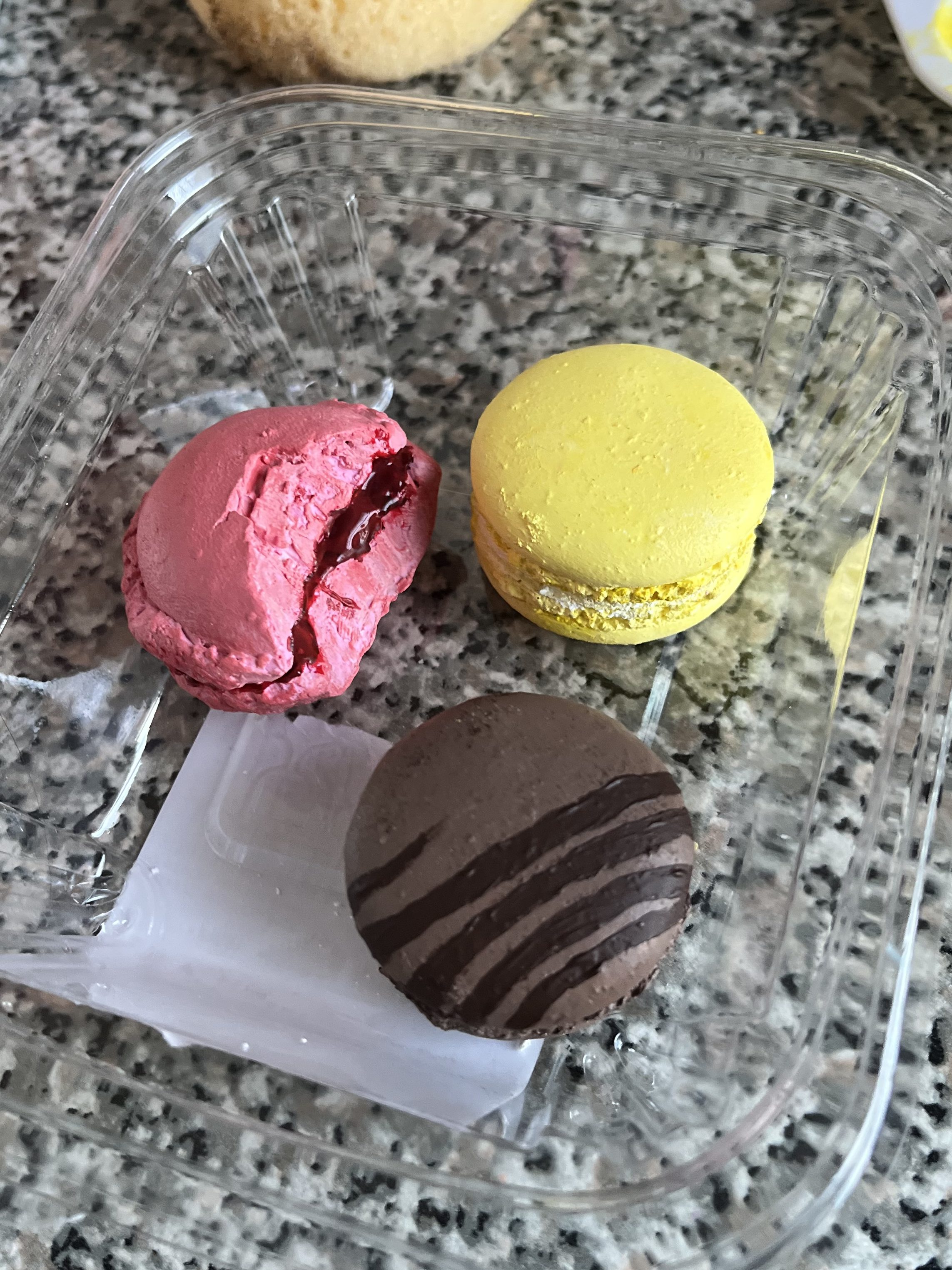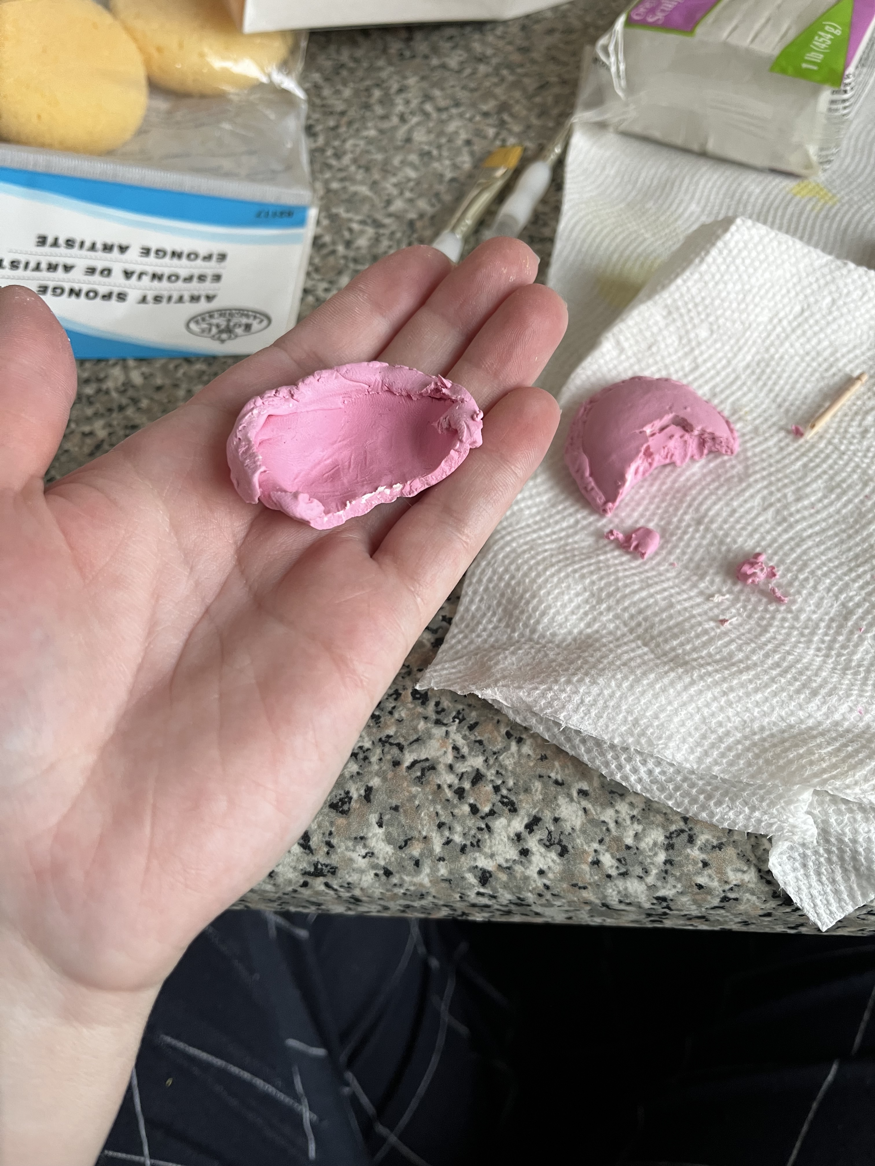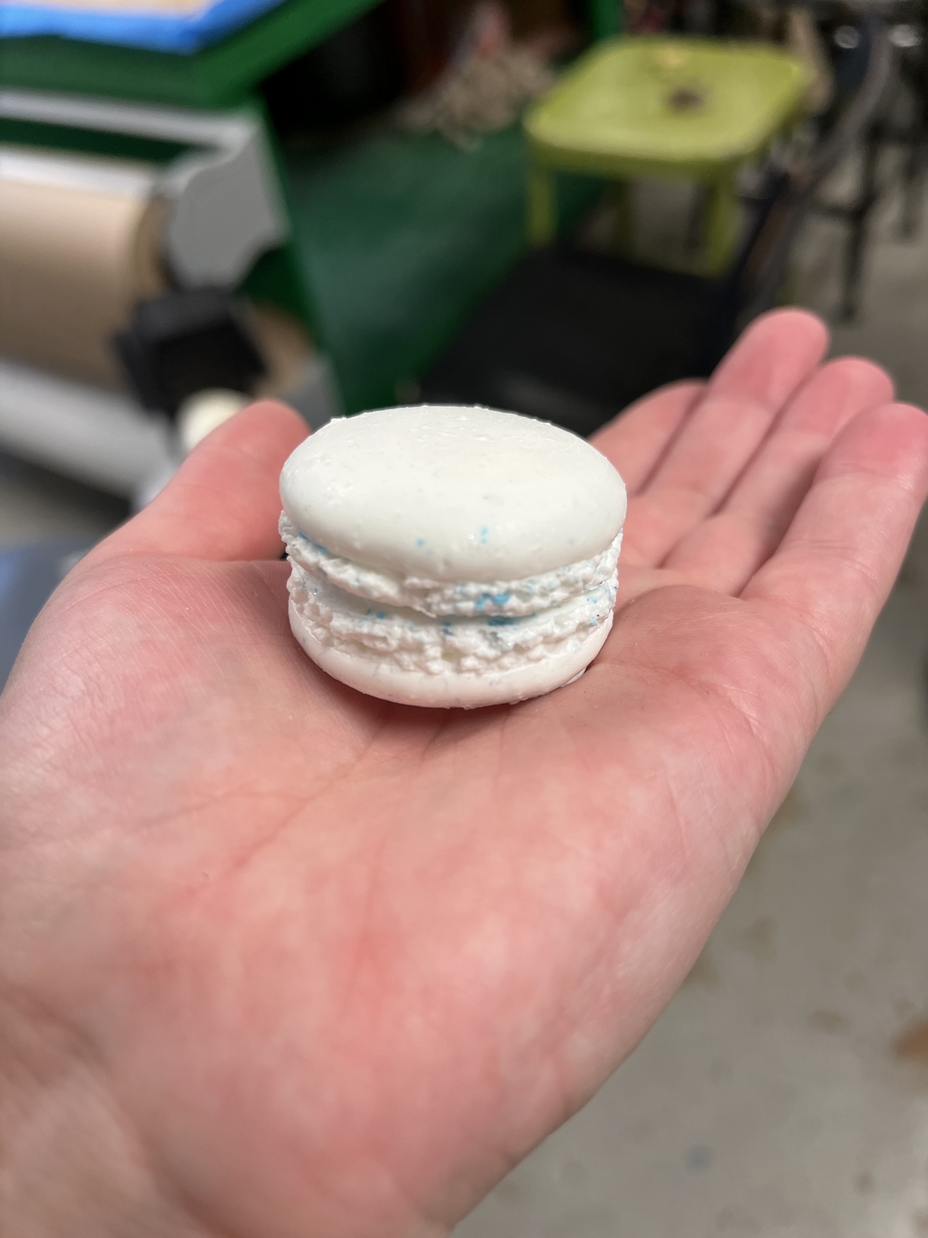 Our assignment was to create fake food. I chose macarons. To make the first two, I casted and molded a real macaron with SmoothOn products. I painted these with acrylic paint to make them look like lemon and chocolate macarons. For the third macaron, I used oven-bake clay, pink eyeshadow, acrylic paint, and glue. I formed a cast out of half of a macaron and baked that, then I put baking soda inside that to keep the soft clay from sticking. I mixed pink eyeshadow into the soft clay and pressed it into the mold. Before I baked the halves separately, I used an X-Acto knife to score the clay in a bite mark shape. I used a toothpick to create the texture of the macaron feet. I then assembled the halves and made a raspberry filling out of paint, eyeshadow, and craft glue.