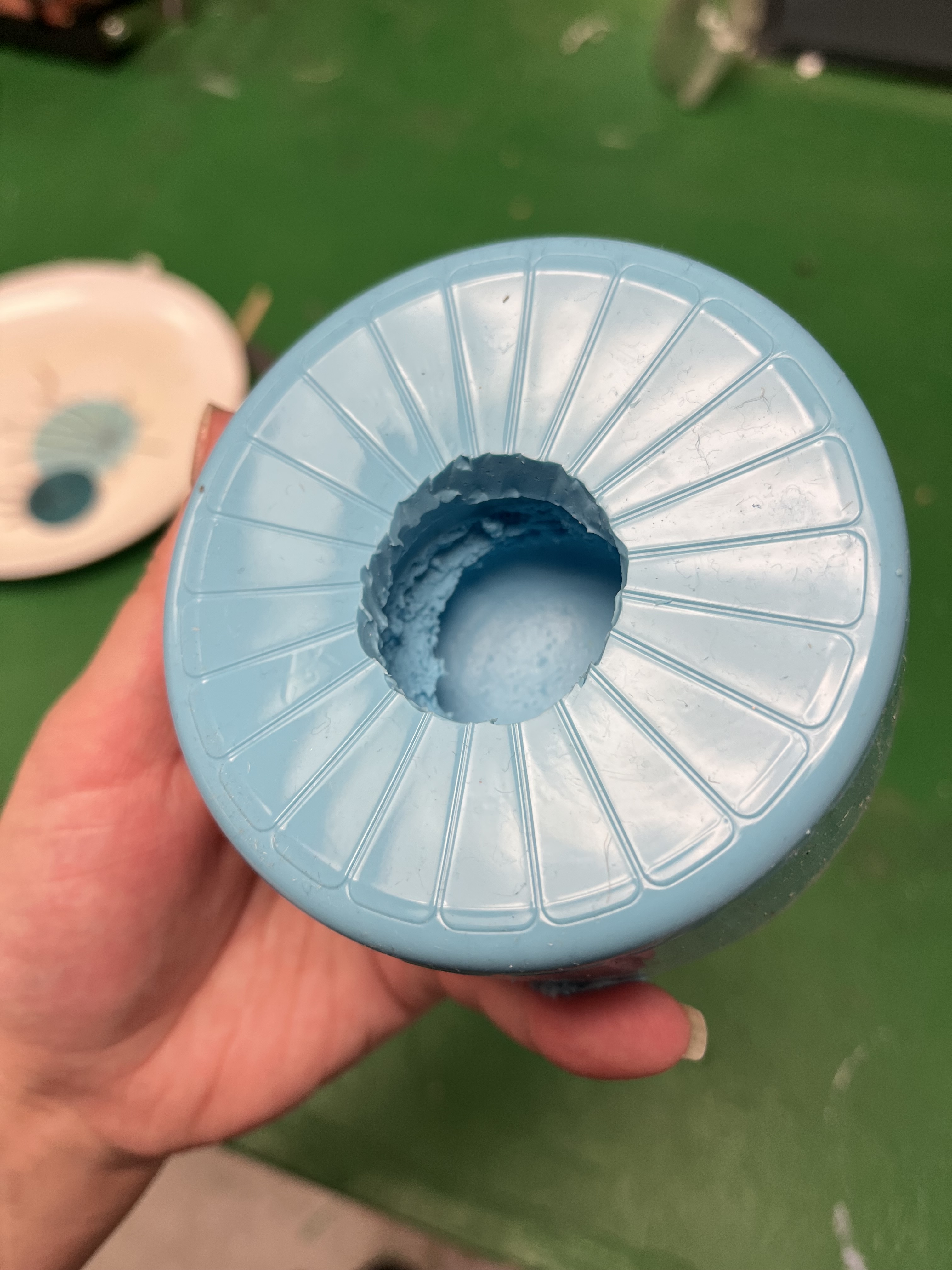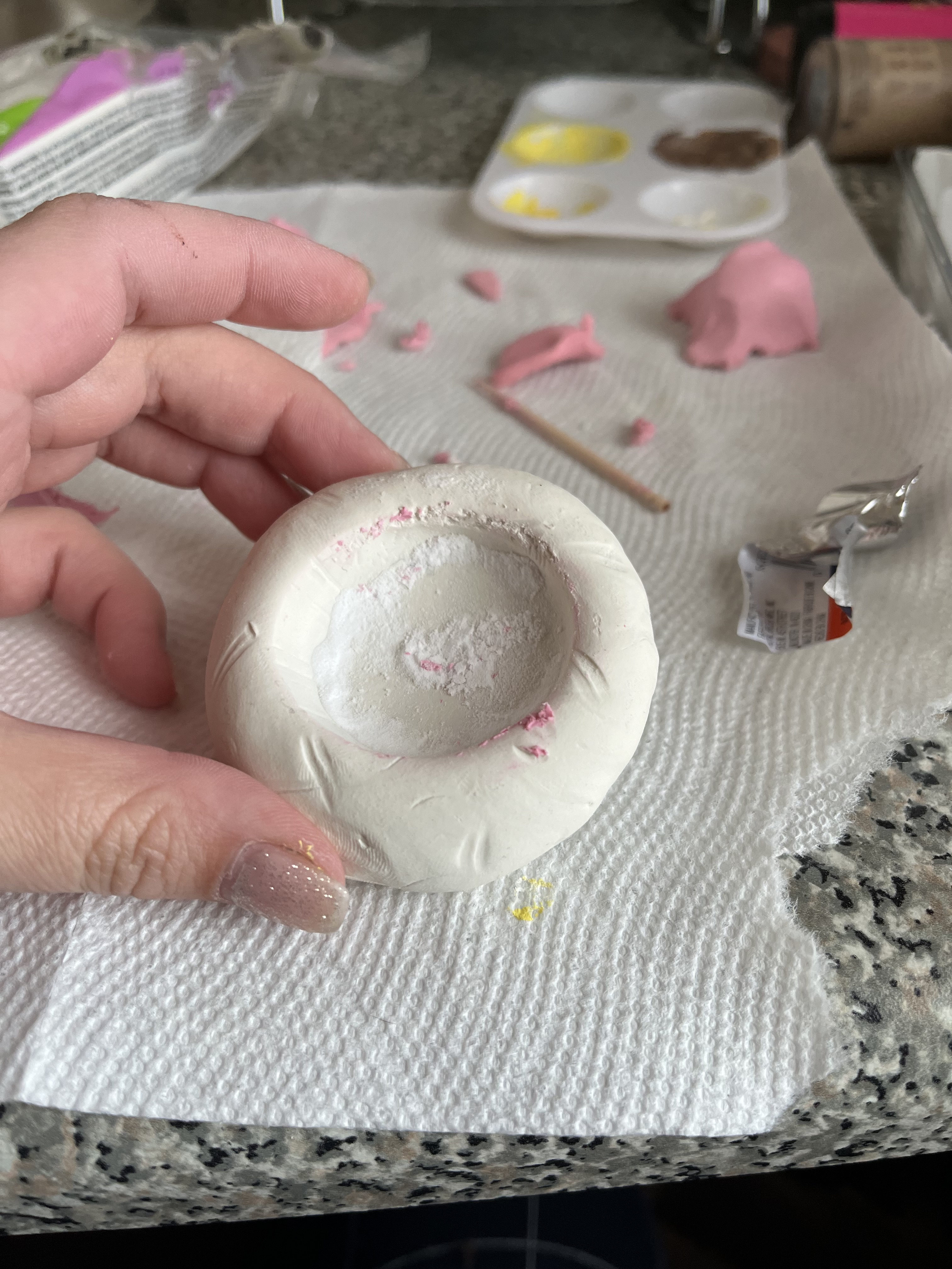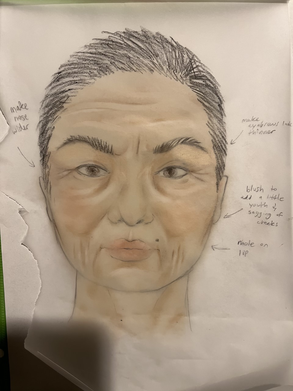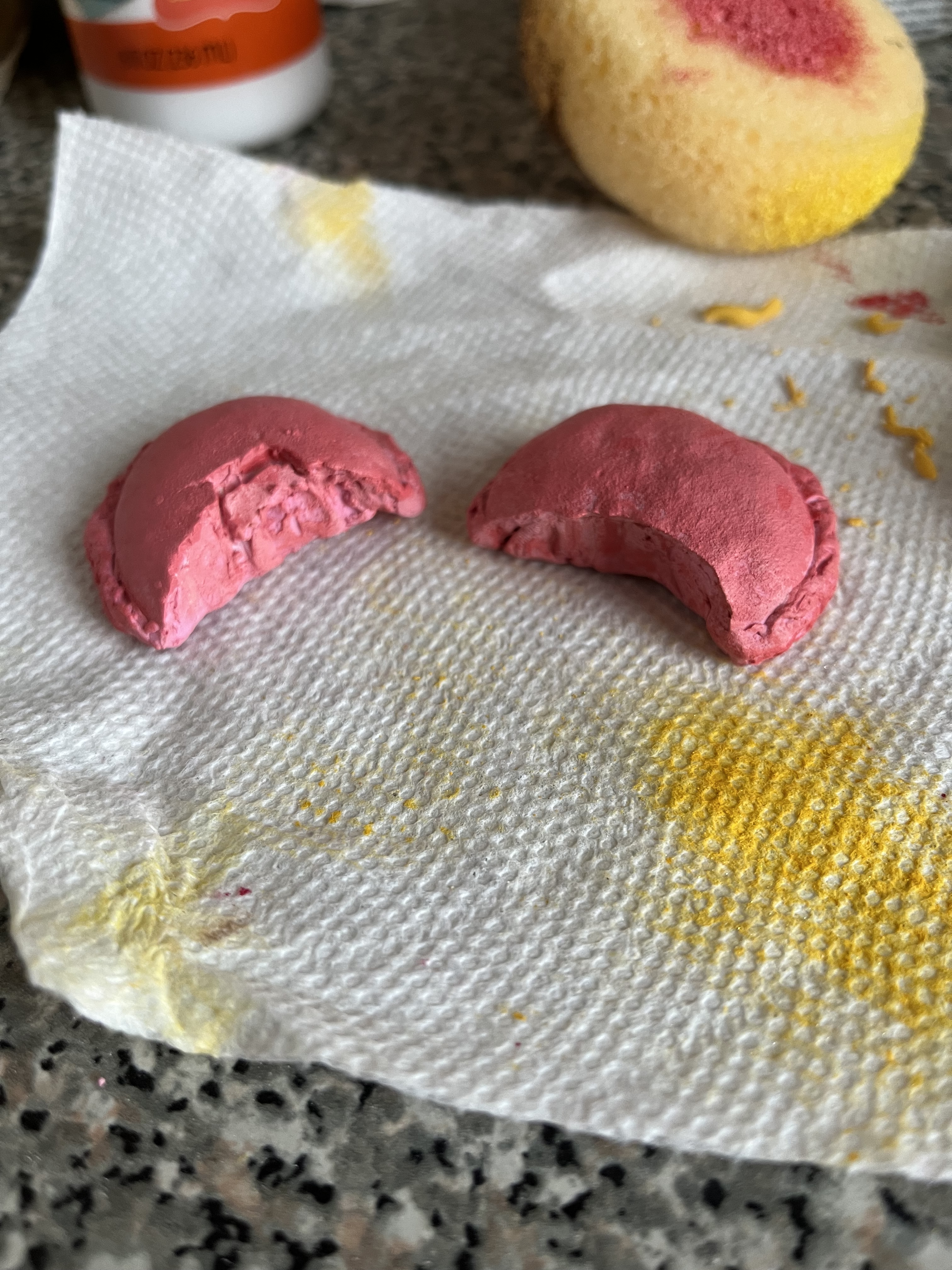 Our assignment was to create fake food. I chose macarons. To make the first two, I casted and molded a real macaron with SmoothOn products. I painted these with acrylic paint to make them look like lemon and chocolate macarons. For the third macaron, I used oven-bake clay, pink eyeshadow, acrylic paint, and glue. I formed a cast out of half of a macaron and baked that, then I put baking soda inside that to keep the soft clay from sticking. I mixed pink eyeshadow into the soft clay and pressed it into the mold. Before I baked the halves separately, I used an X-Acto knife to score the clay in a bite mark shape. I used a toothpick to create the texture of the macaron feet. I then assembled the halves and made a raspberry filling out of paint, eyeshadow, and craft glue.