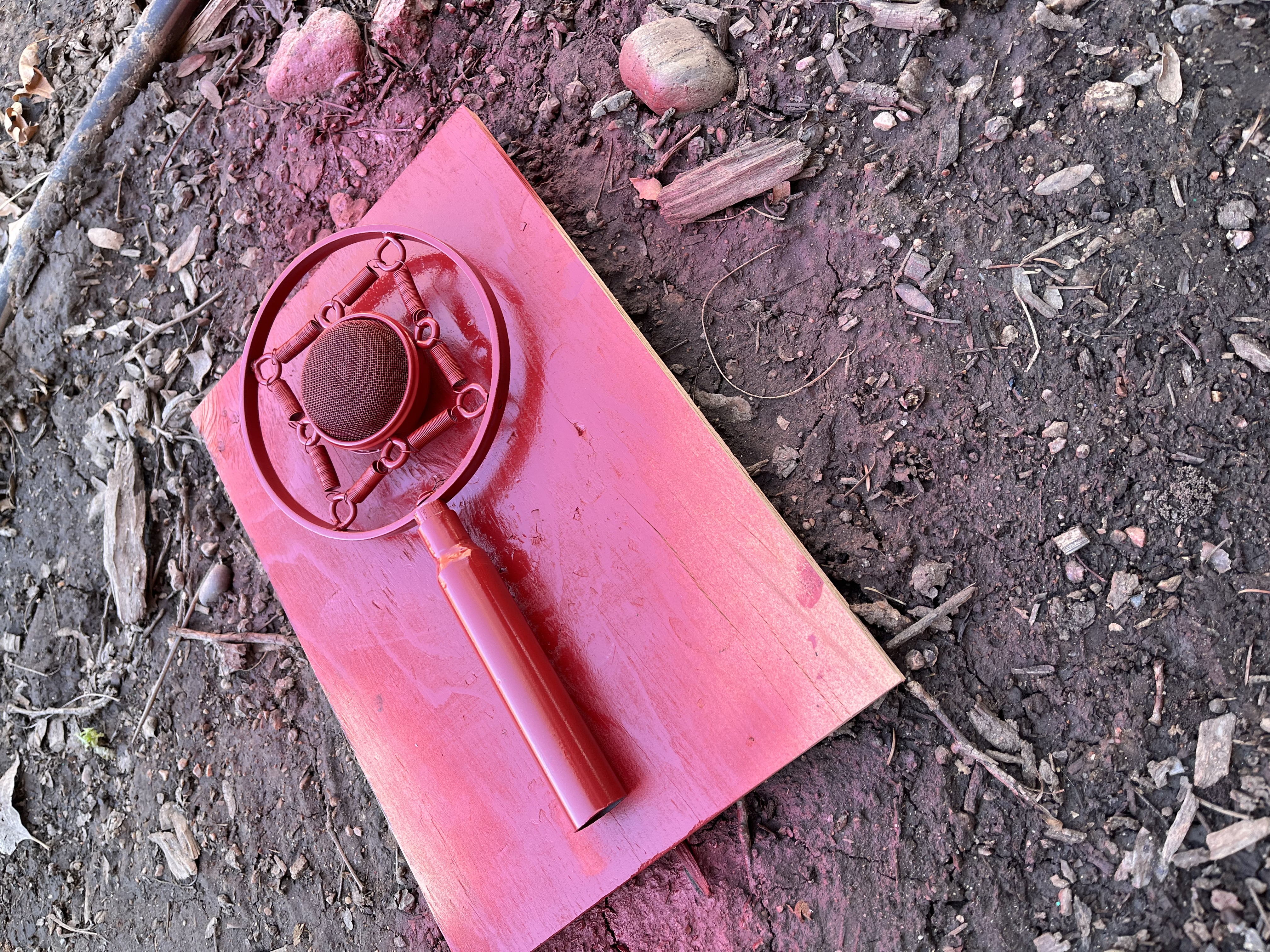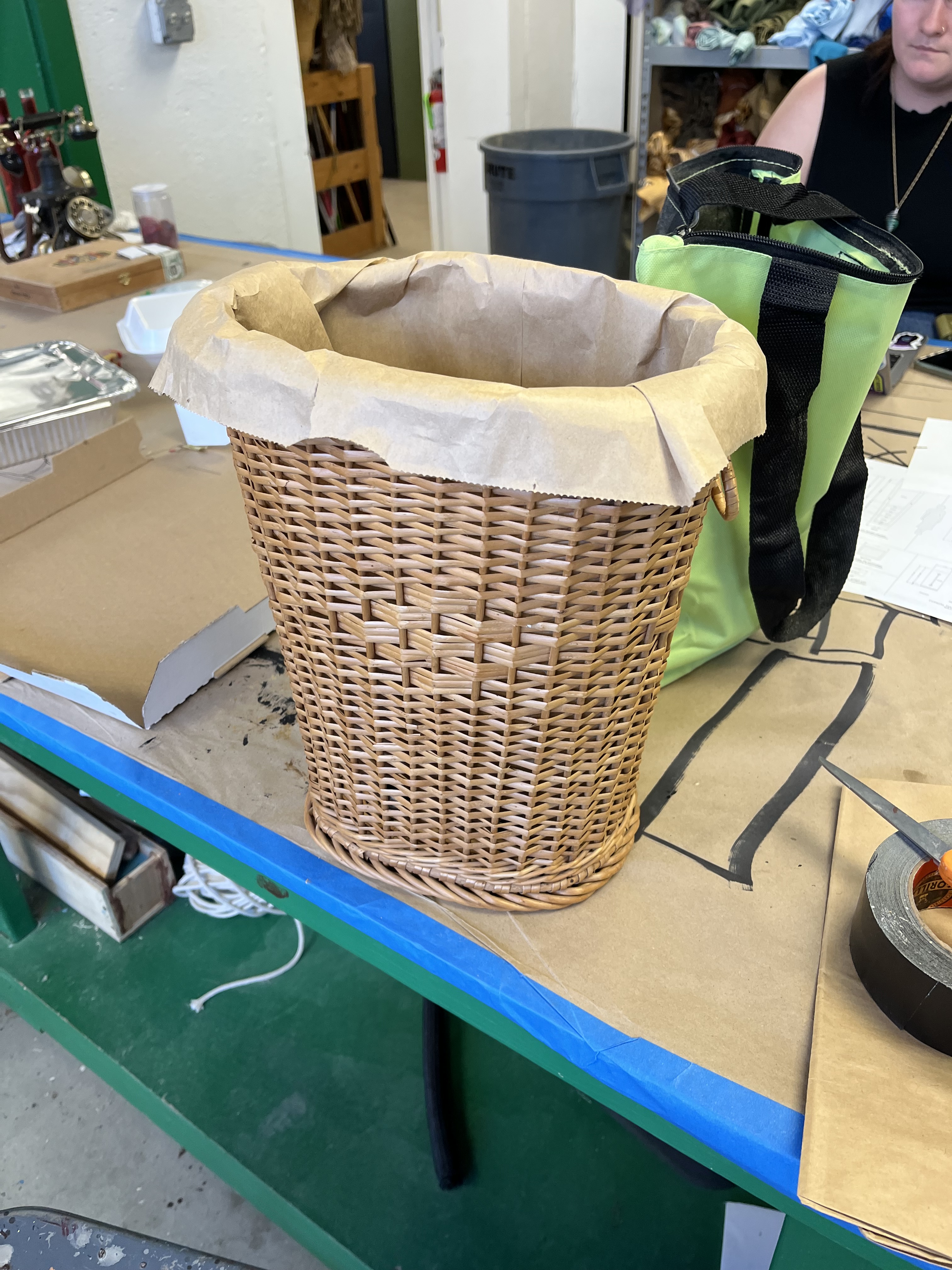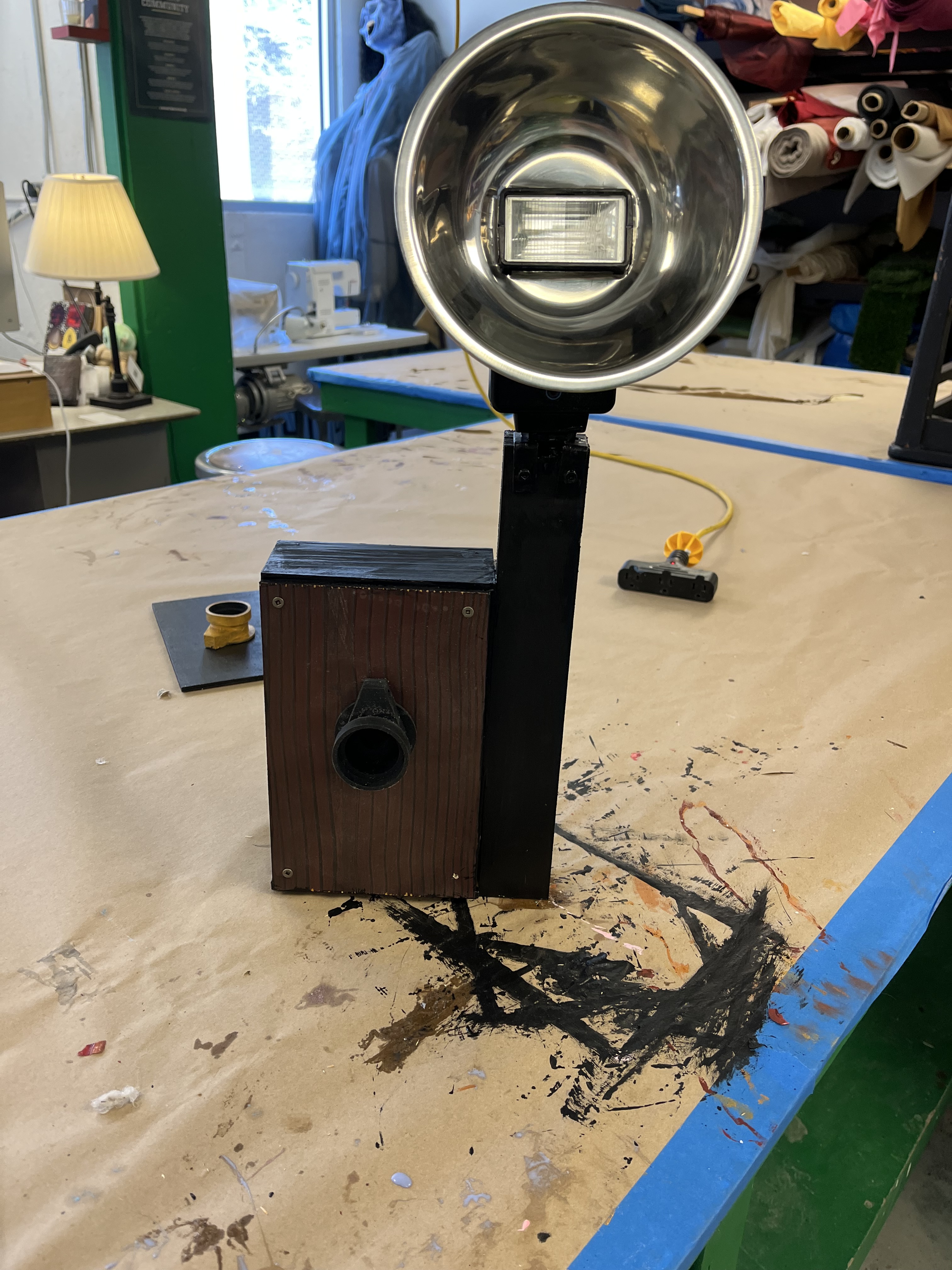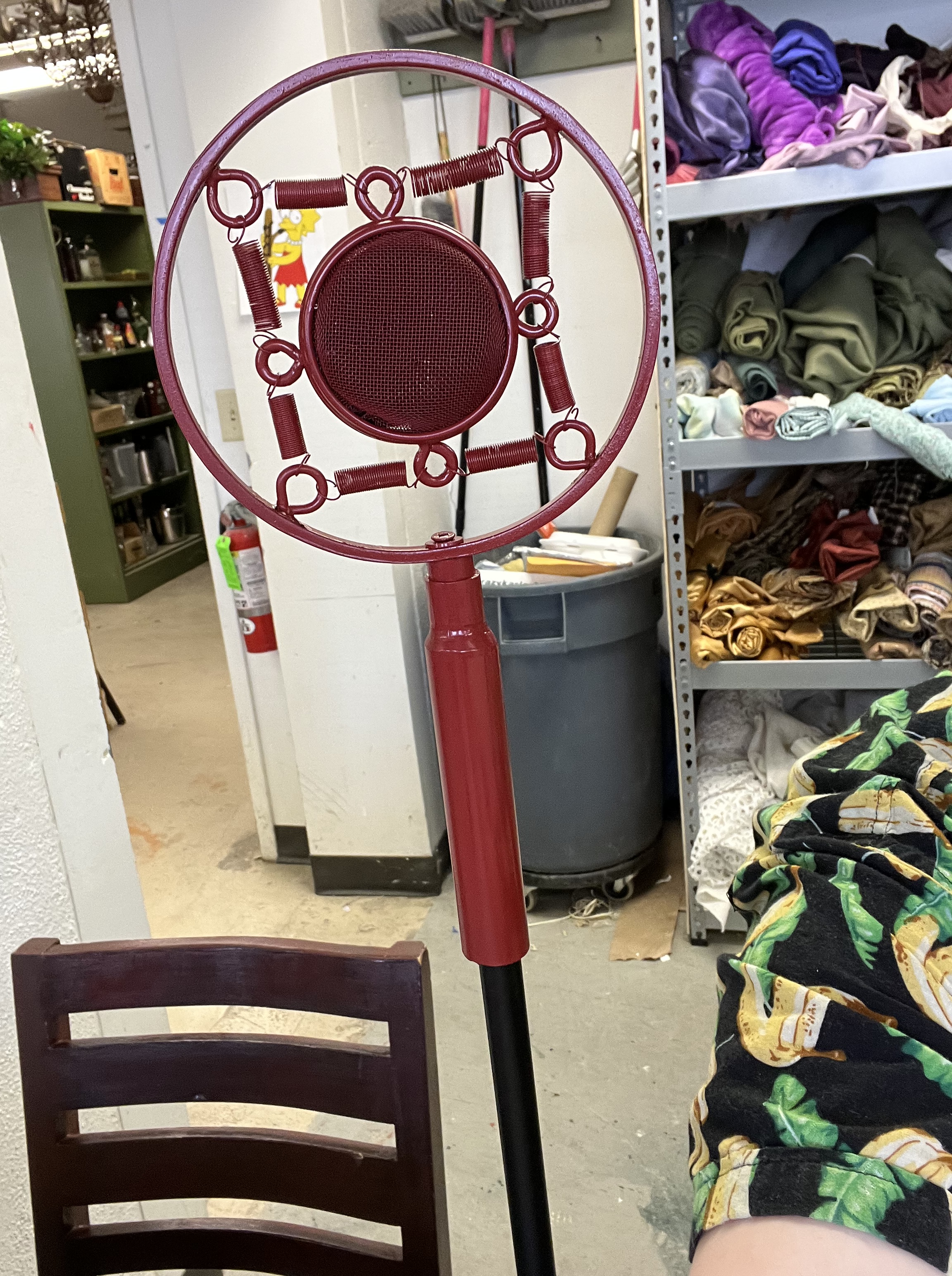 Many of our props needed to be painted red, black, or gold. To paint the tables, which were designed and 3-D printed by the scenic team (Roger Hanna, Thomas Ray, Doster Chastain), I used black paint followed by thin gray paint to add highlights. The cameras were painted black with gold lenses. There isn’t a process photo, but I did cut and staple neck straps onto the cameras. The trash cans needed to look disgusting, so I put Shellac onto the paper lining. I spray painted the microphone and attached it to the stand with hot glue.