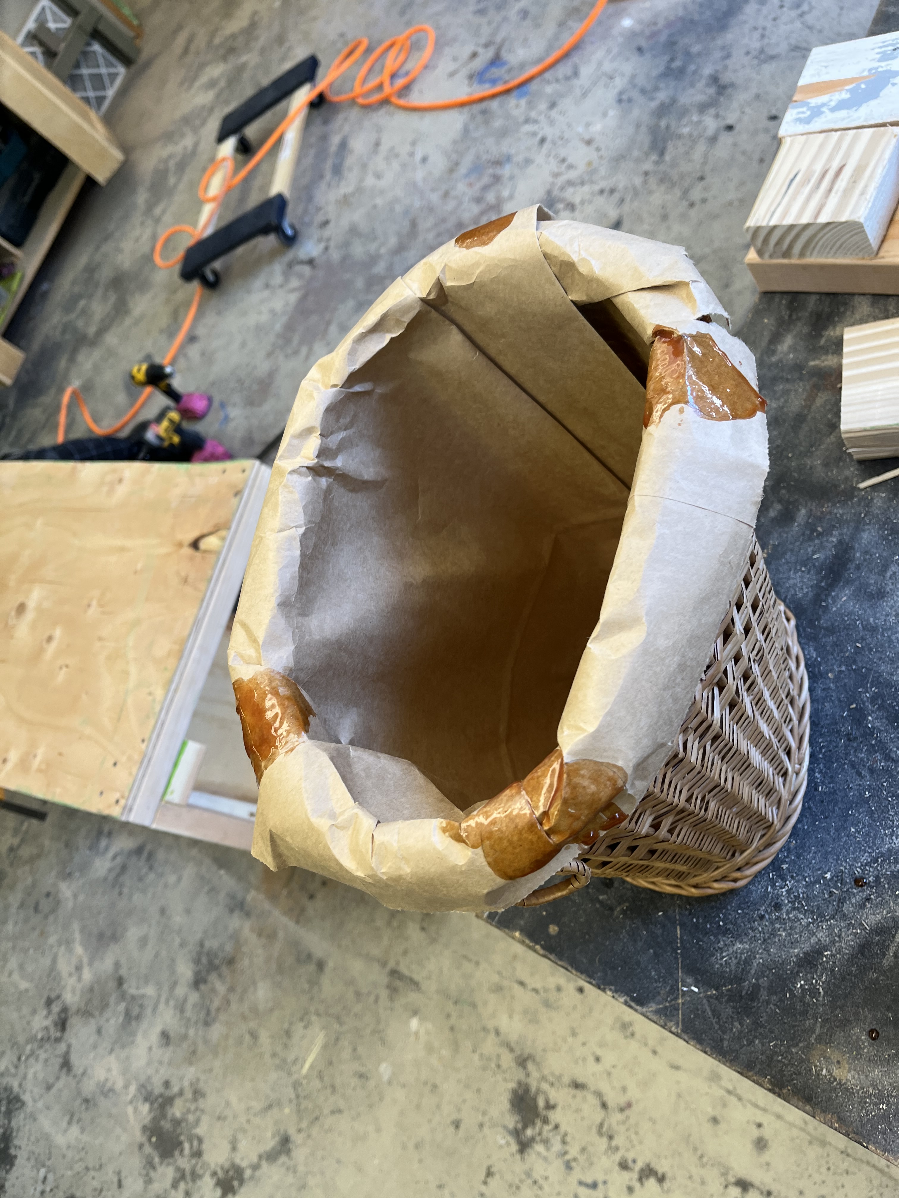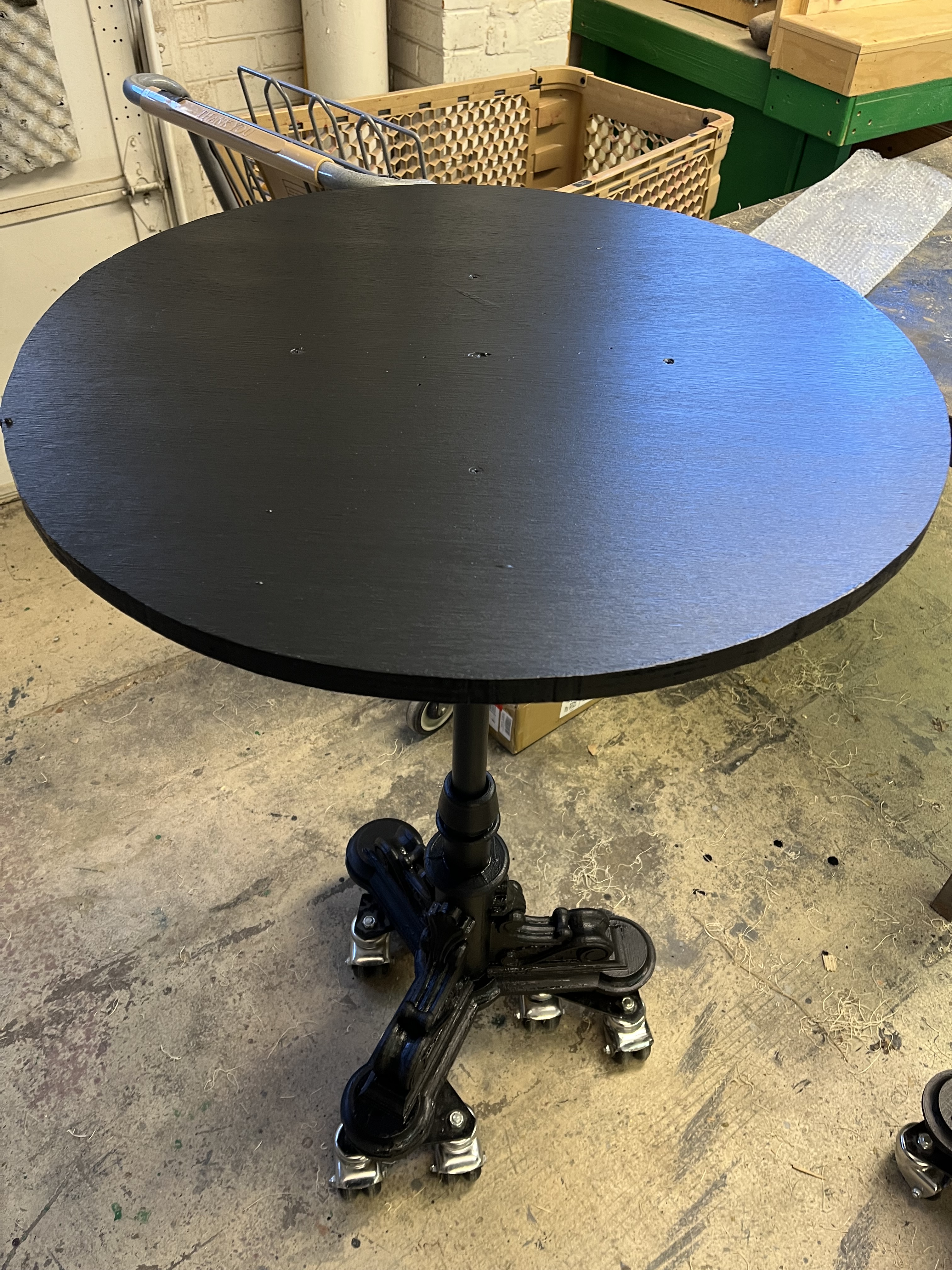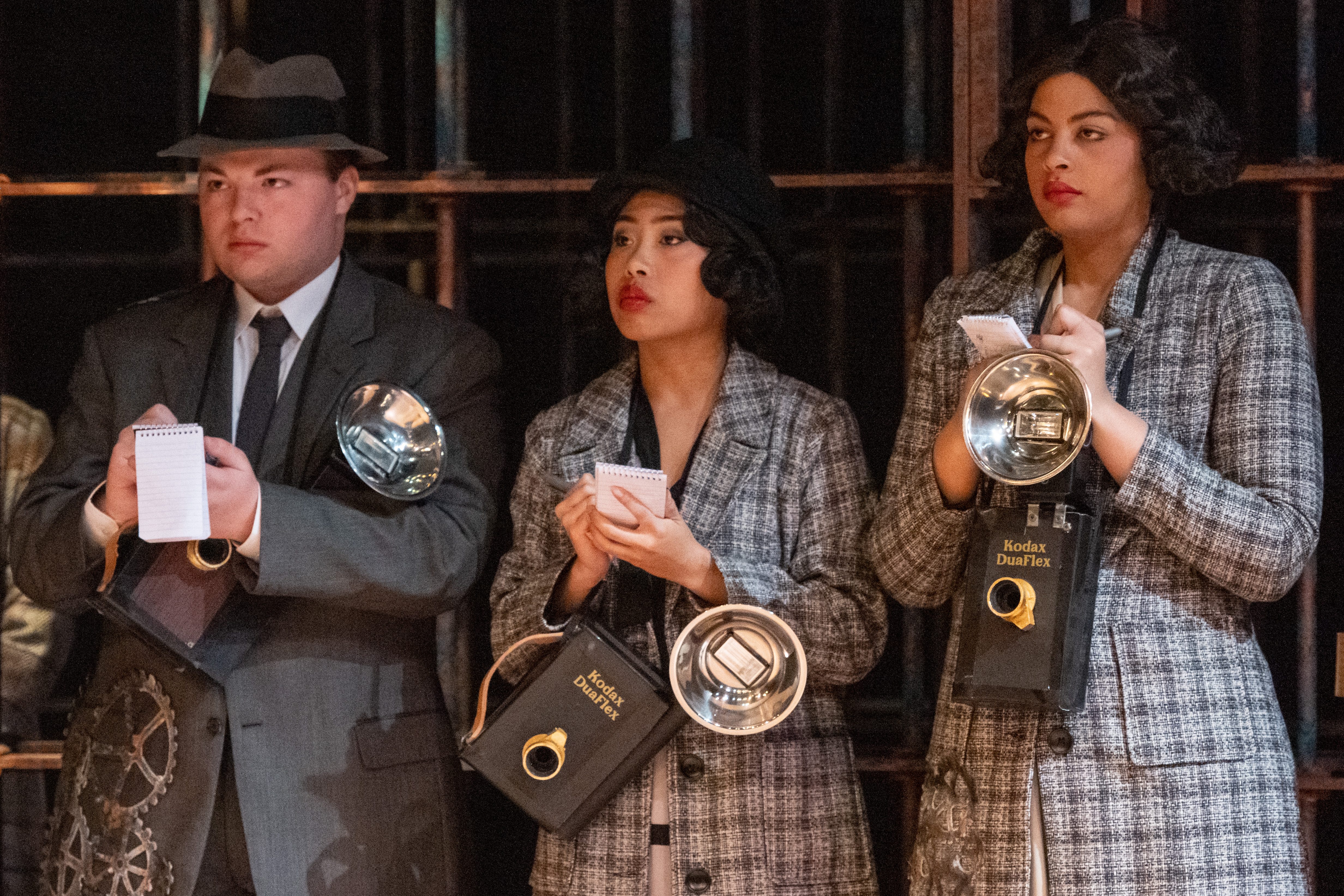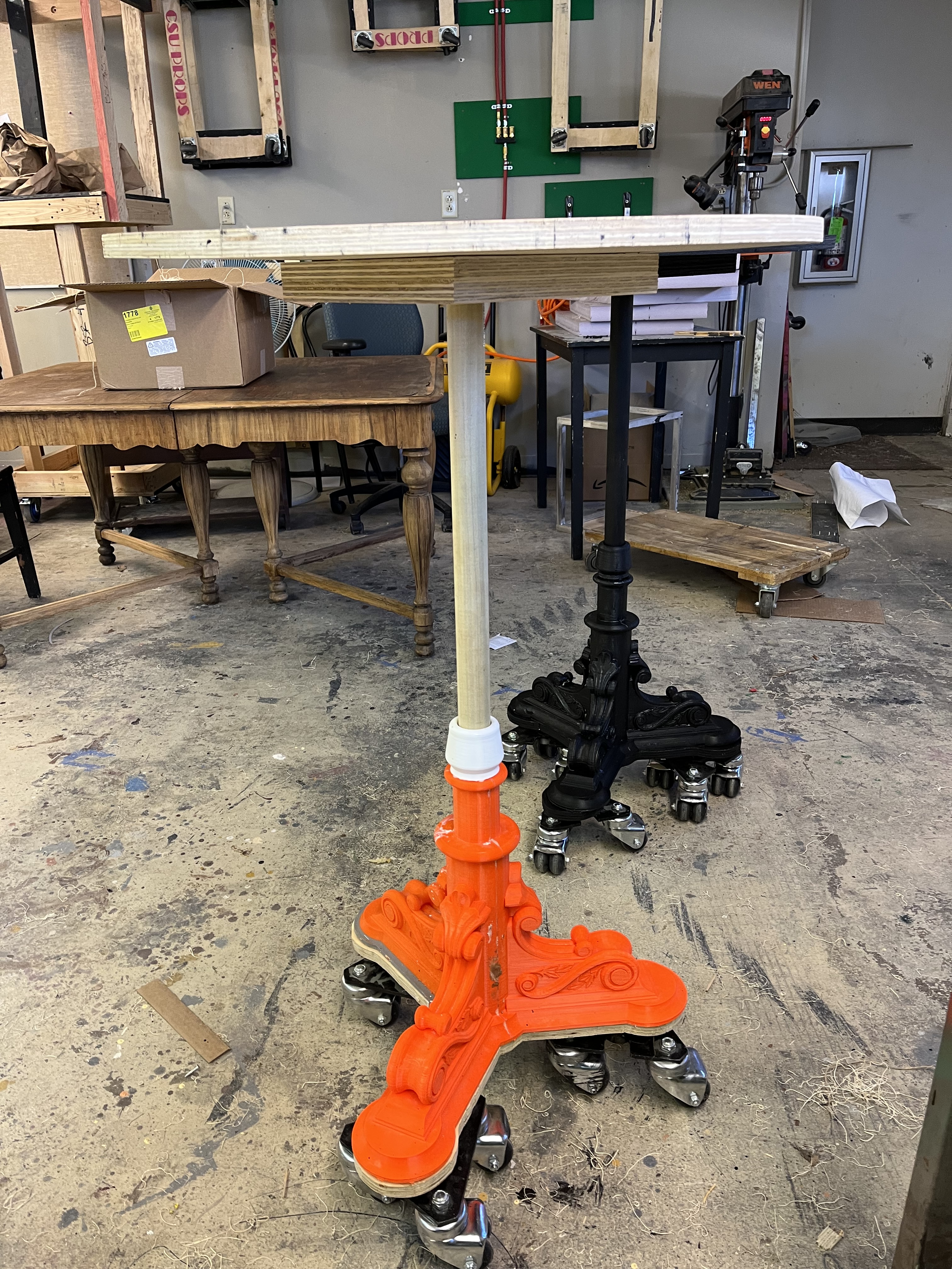 Many of our props needed to be painted red, black, or gold. To paint the tables, which were designed and 3-D printed by the scenic team (Roger Hanna, Thomas Ray, Doster Chastain), I used black paint followed by thin gray paint to add highlights. The cameras were painted black with gold lenses. There isn’t a process photo, but I did cut and staple neck straps onto the cameras. The trash cans needed to look disgusting, so I put Shellac onto the paper lining. I spray painted the microphone and attached it to the stand with hot glue.