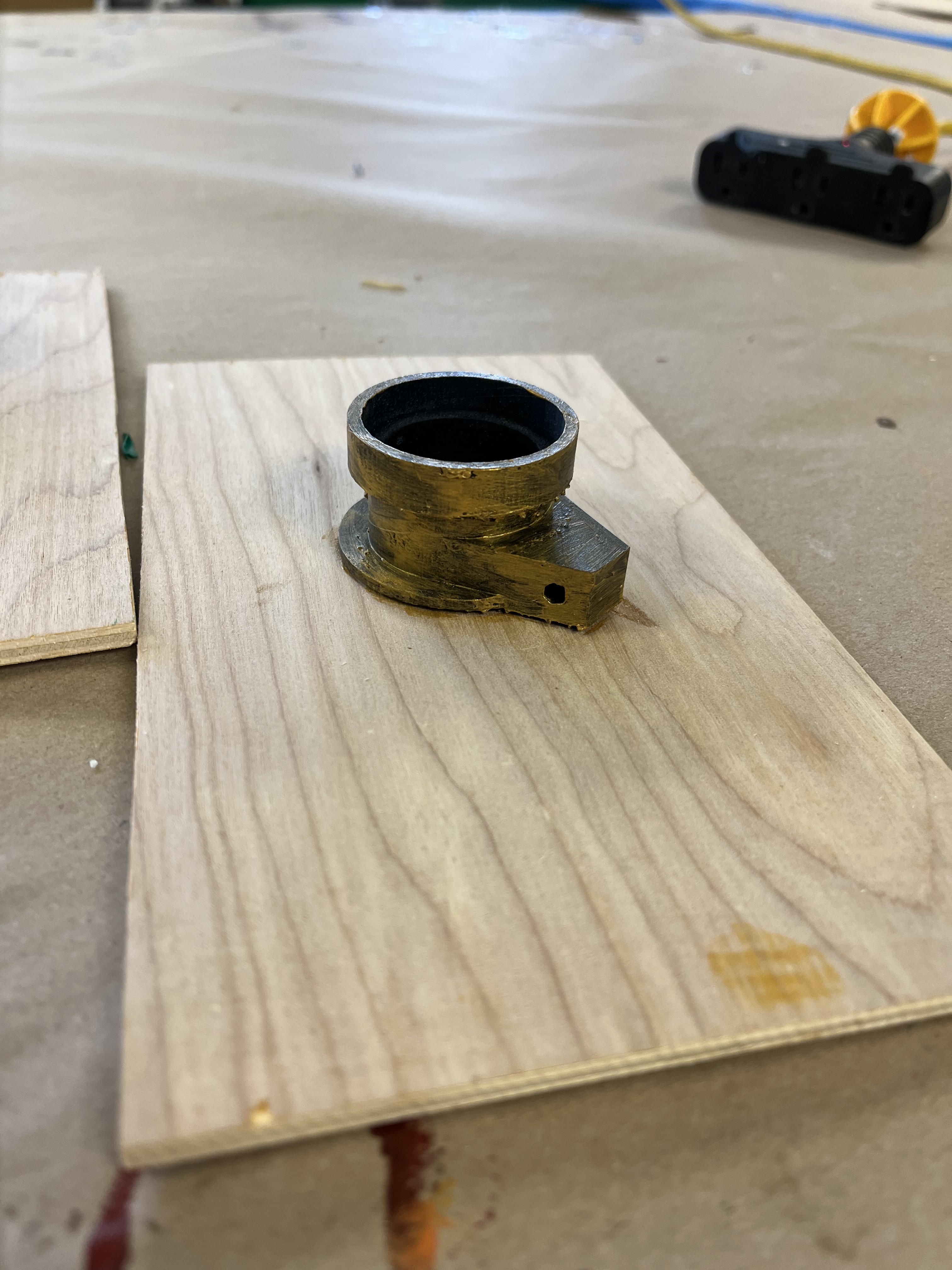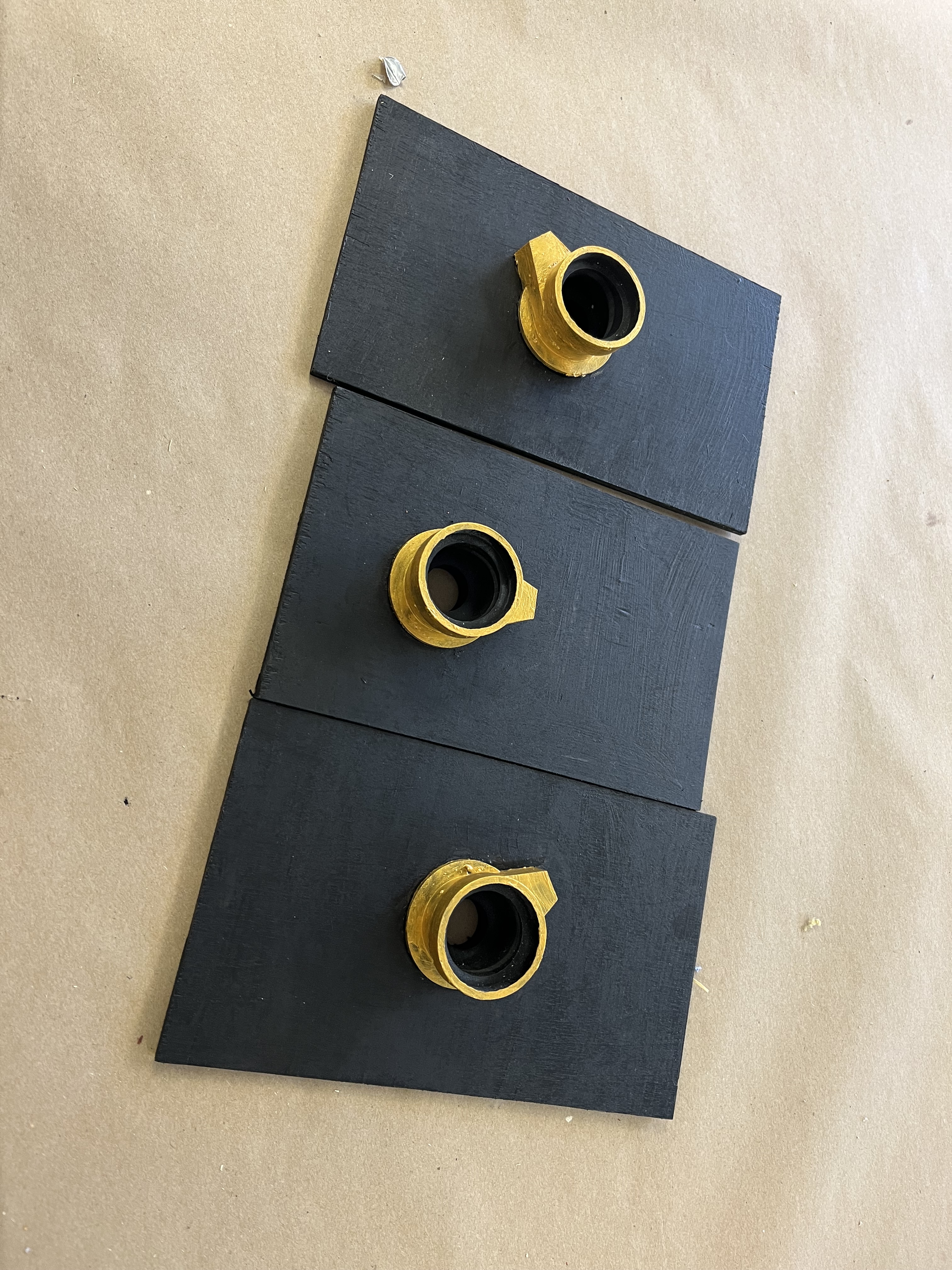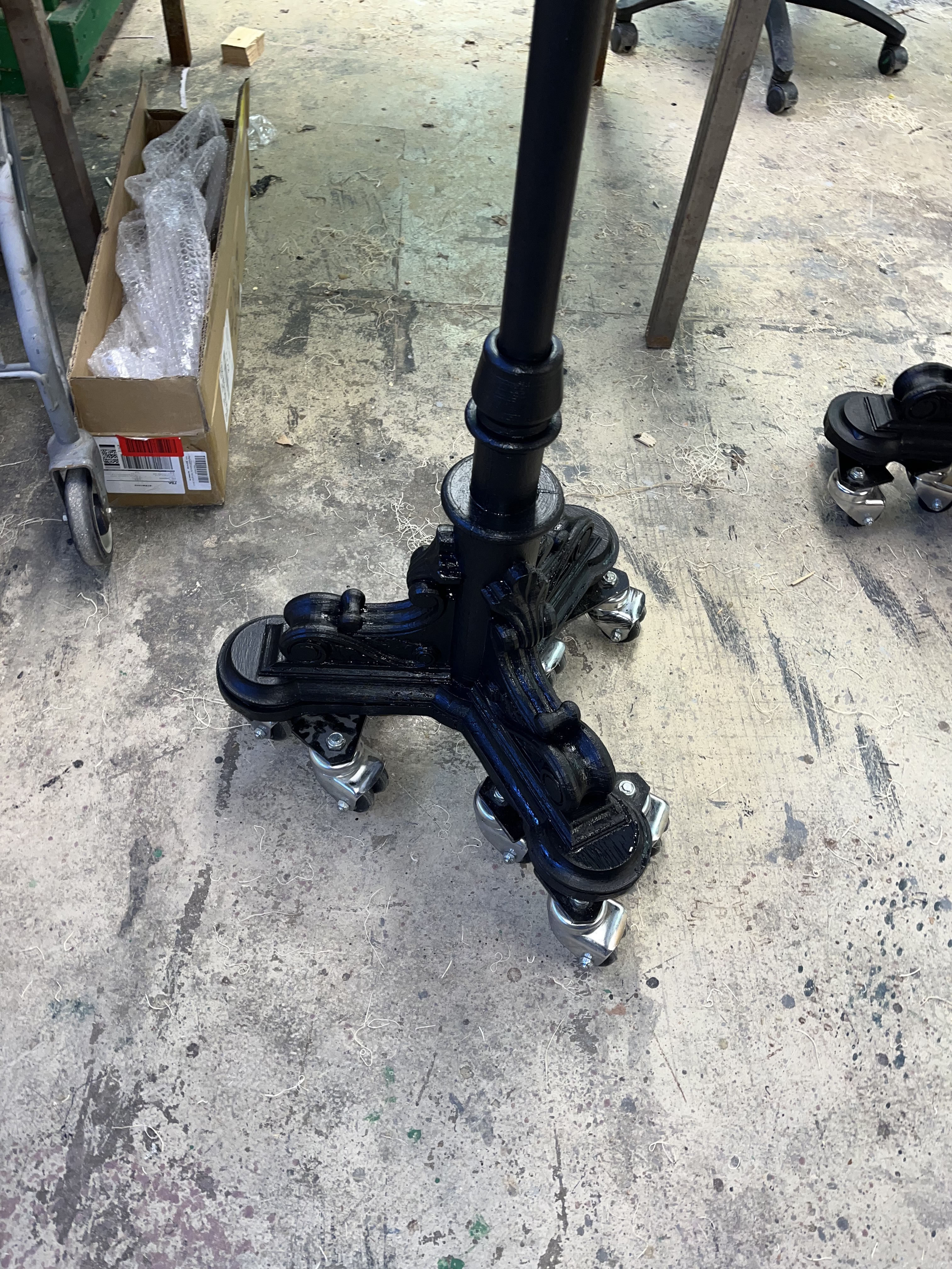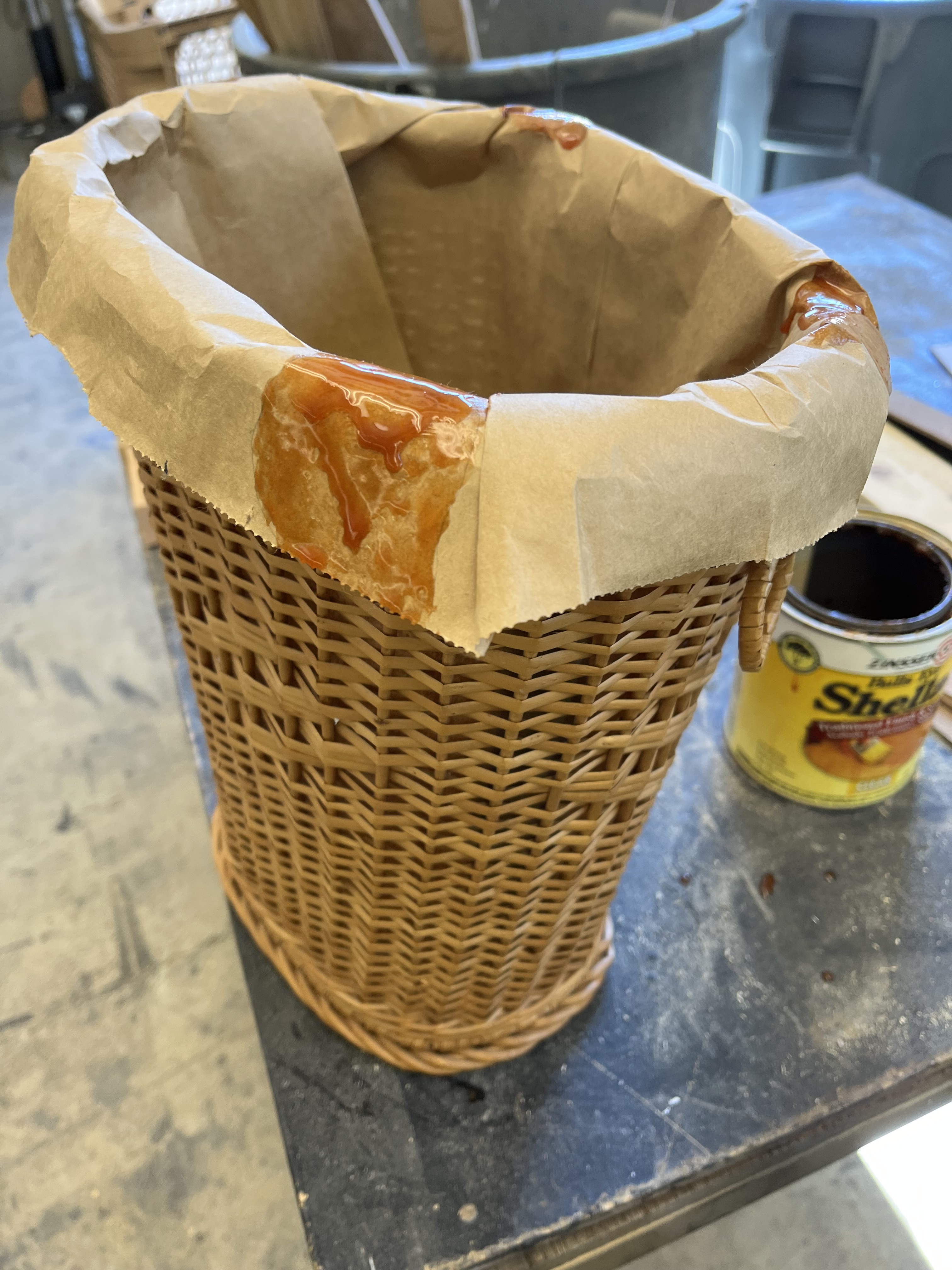 Many of our props needed to be painted red, black, or gold. To paint the tables, which were designed and 3-D printed by the scenic team (Roger Hanna, Thomas Ray, Doster Chastain), I used black paint followed by thin gray paint to add highlights. The cameras were painted black with gold lenses. There isn’t a process photo, but I did cut and staple neck straps onto the cameras. The trash cans needed to look disgusting, so I put Shellac onto the paper lining. I spray painted the microphone and attached it to the stand with hot glue.