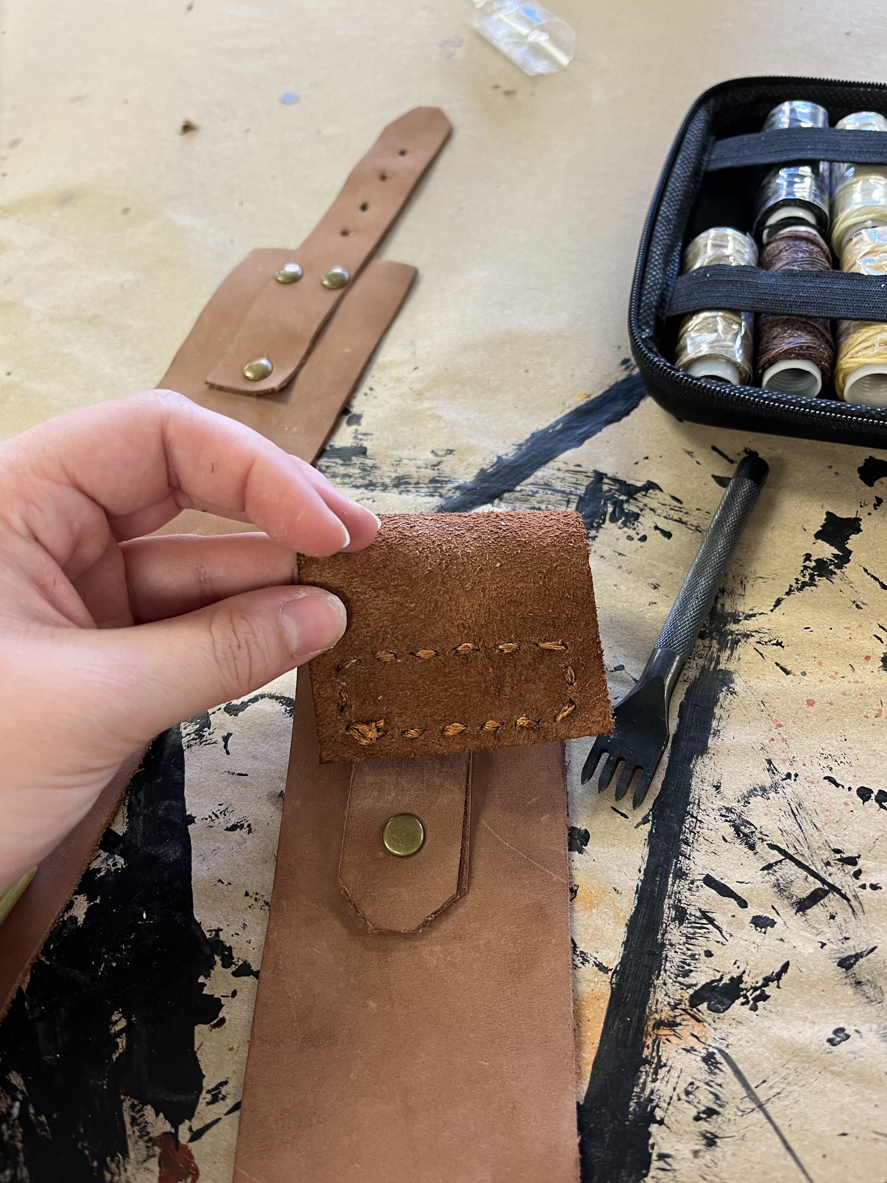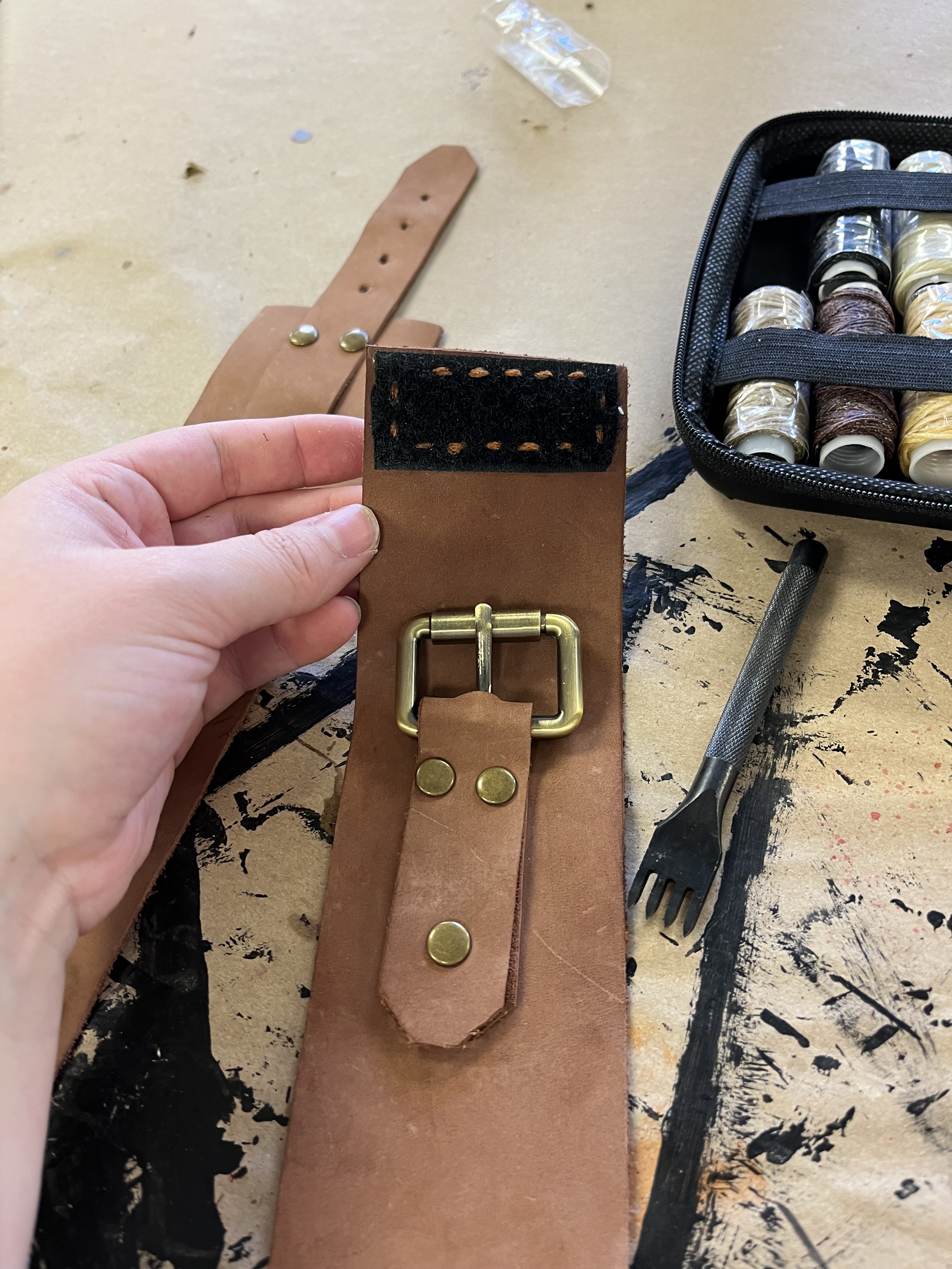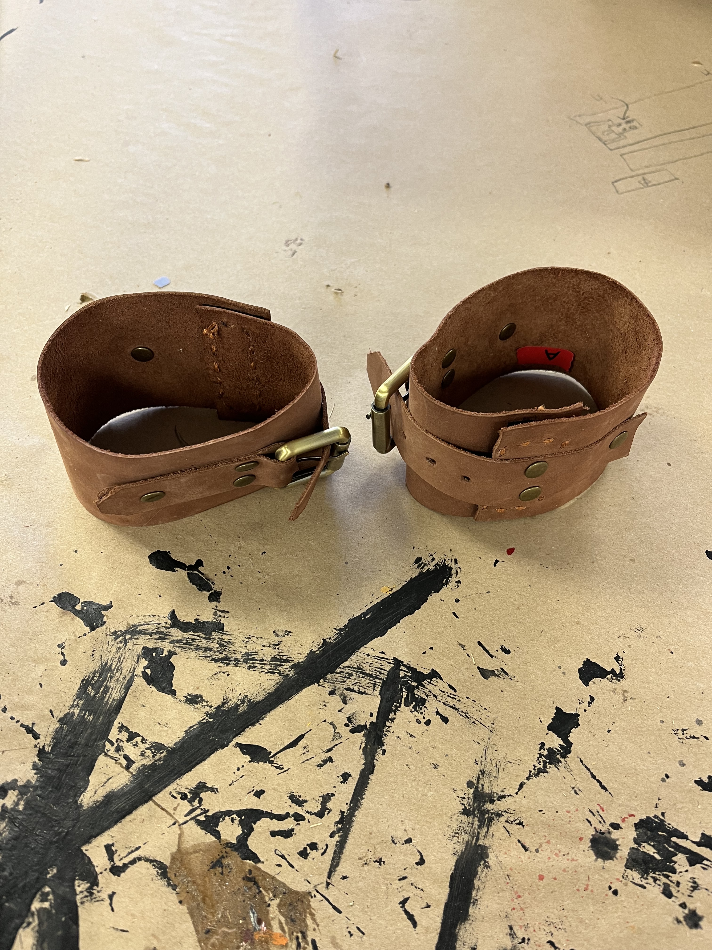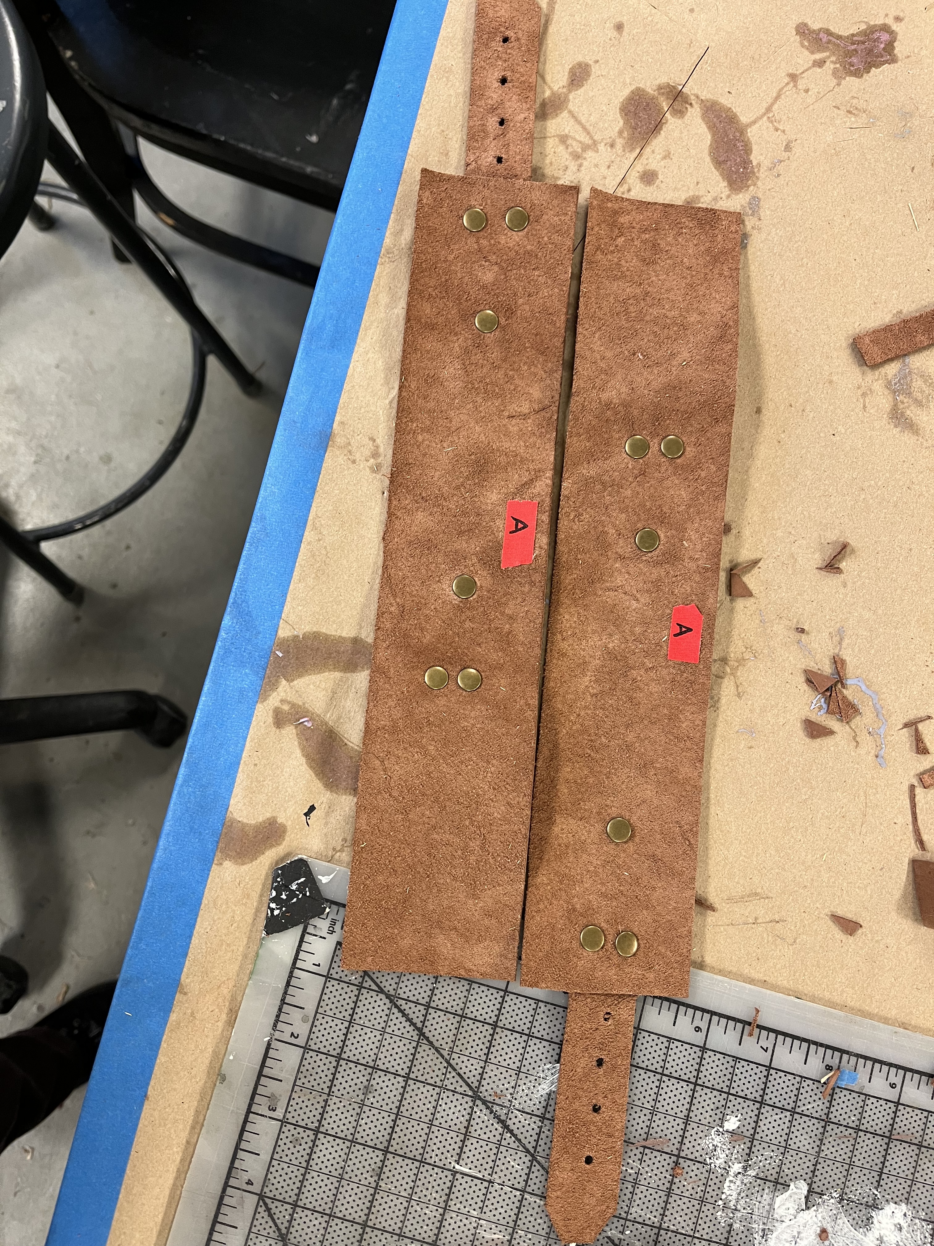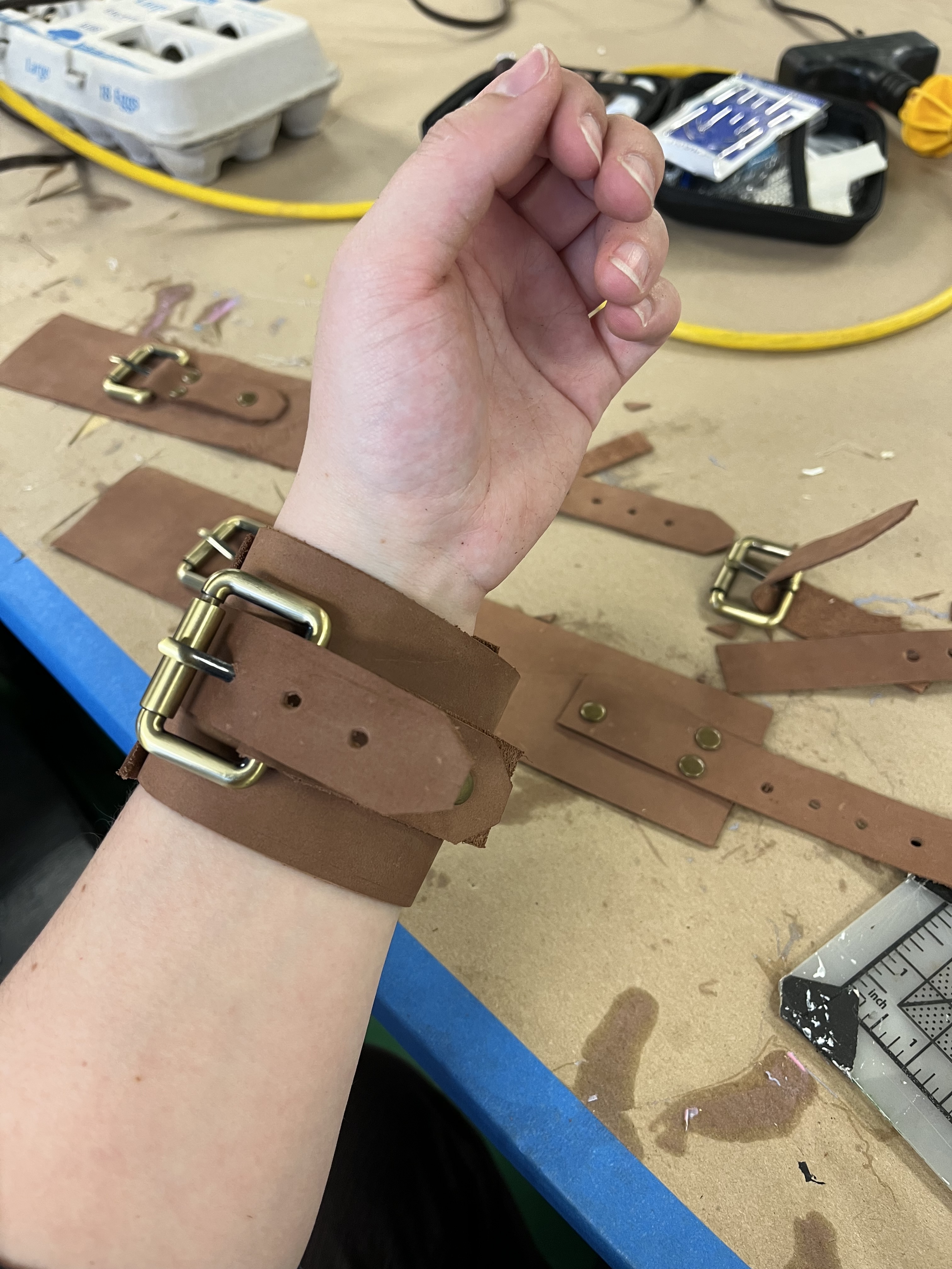 To make the wrist and ankle restraints for the electric chair, I followed a design by Jay Duckworth. I cut them out of leather and used rivets to attach the pieces. I also sewed Velcro onto the ankle restraints to help the actors close them more quickly.