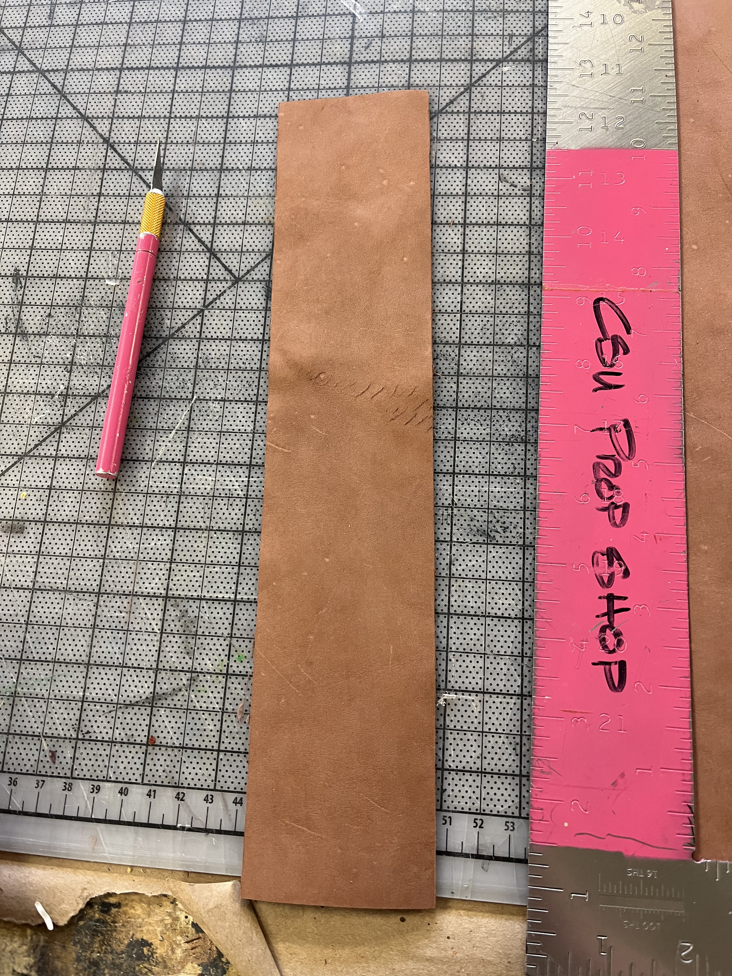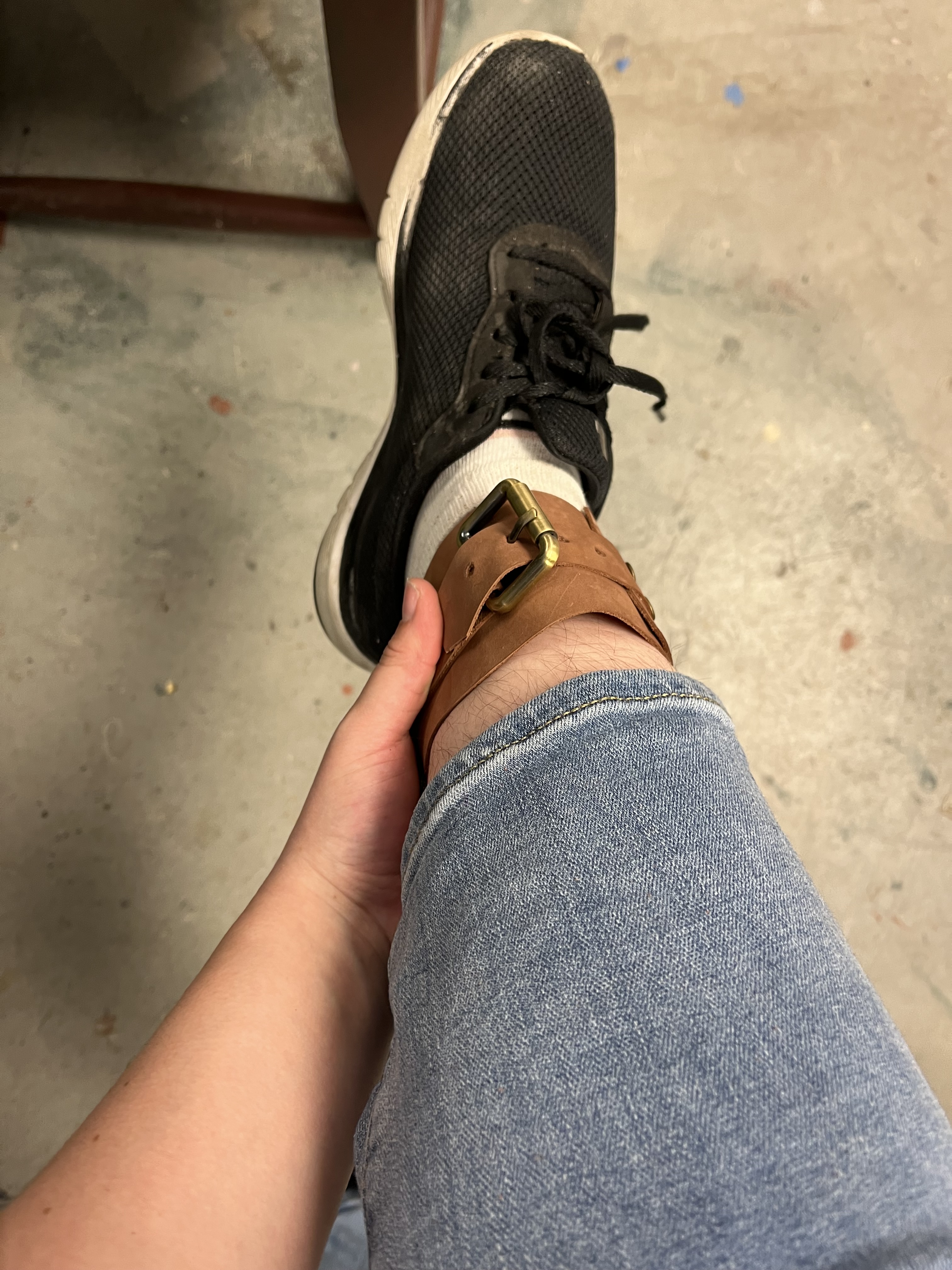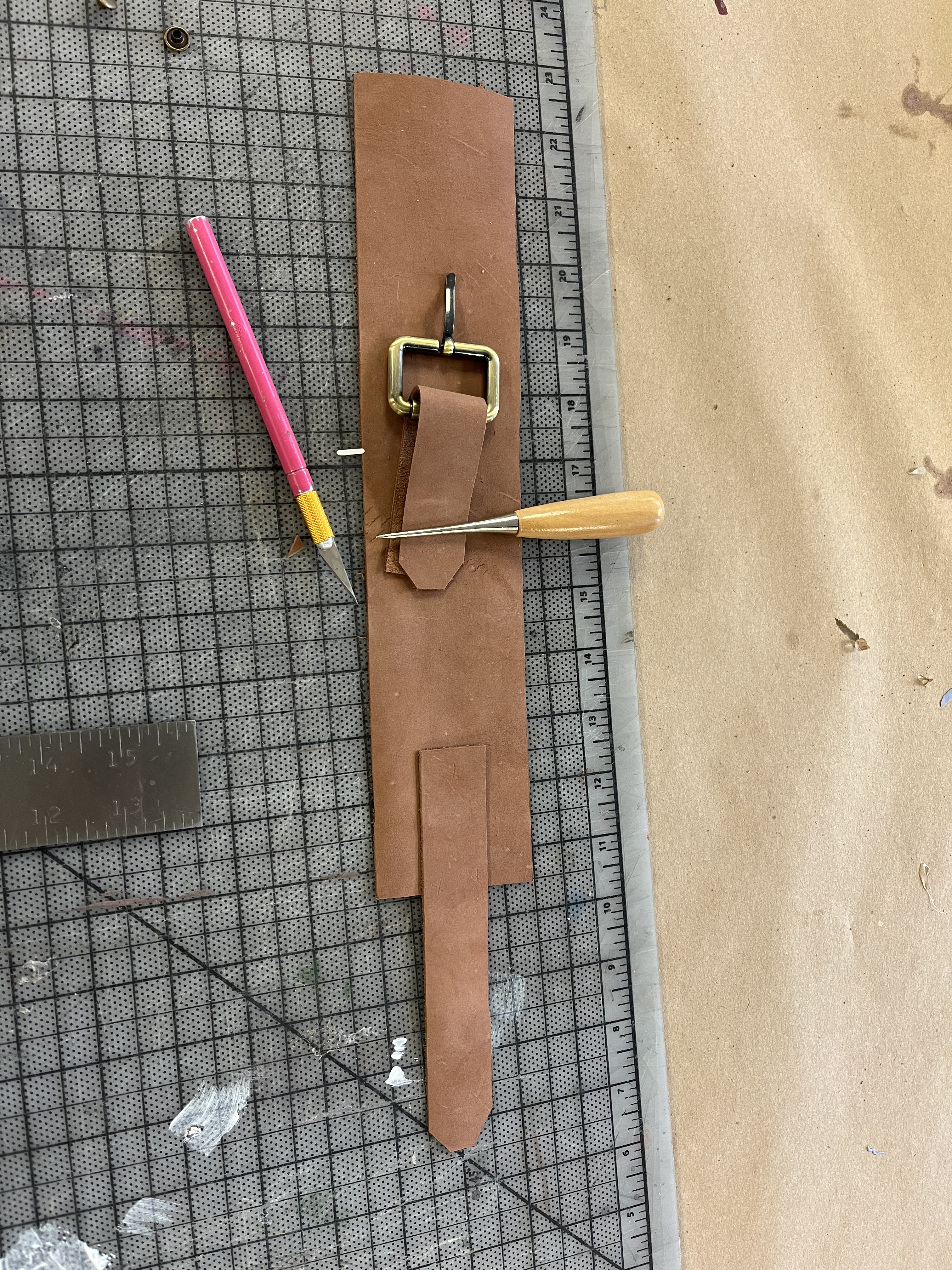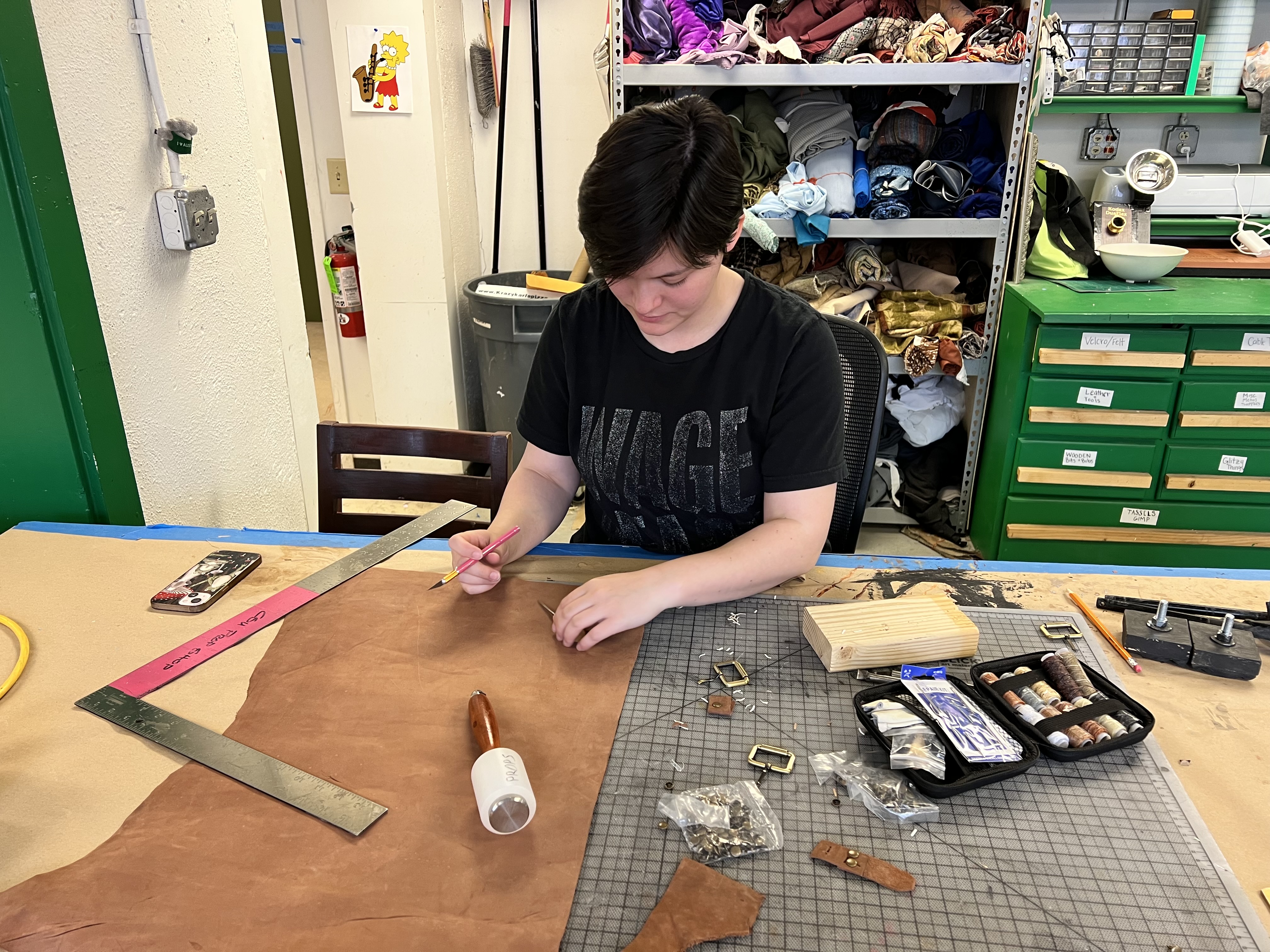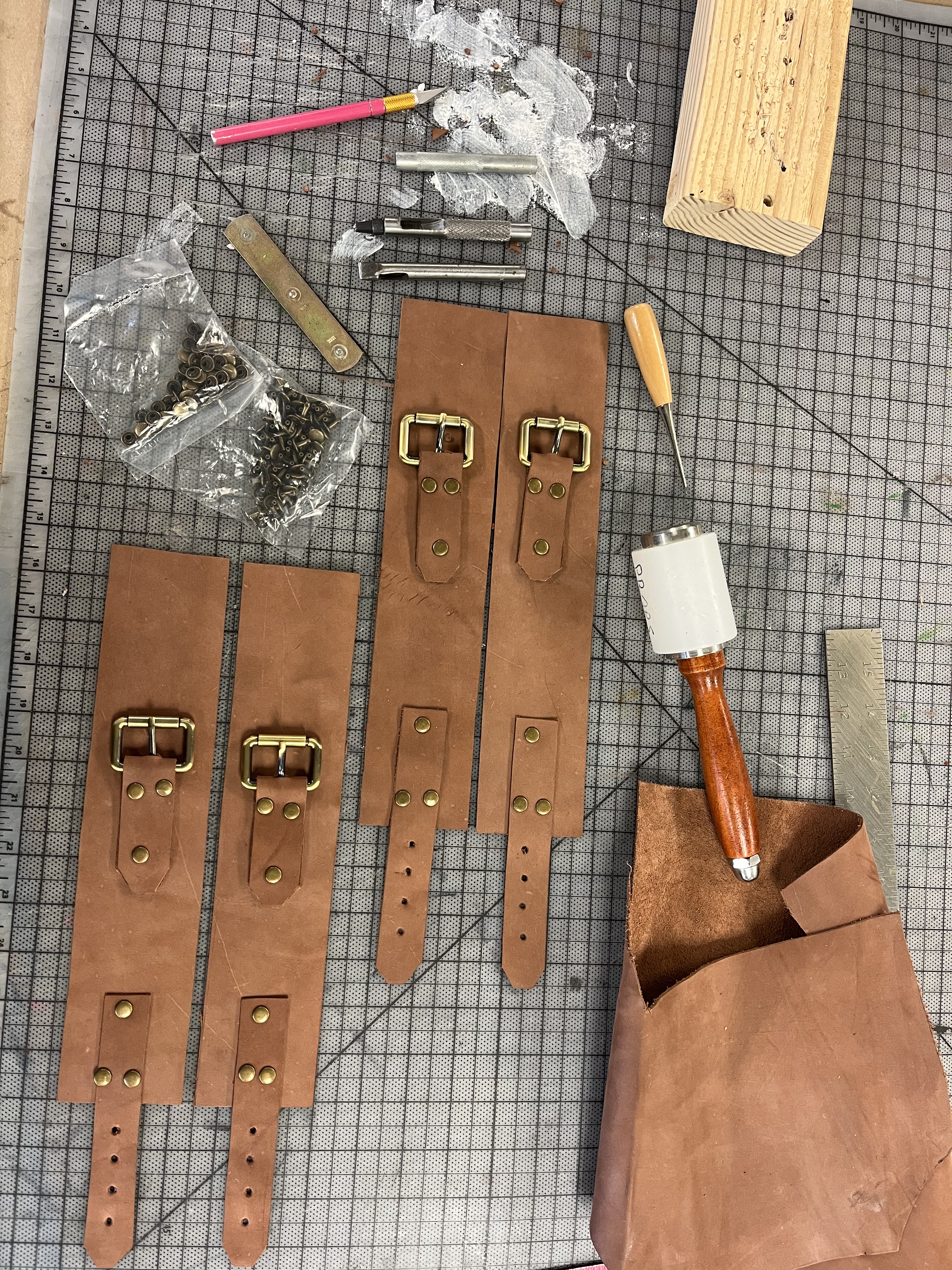 To make the wrist and ankle restraints for the electric chair, I followed a design by Jay Duckworth. I cut them out of leather and used rivets to attach the pieces. I also sewed Velcro onto the ankle restraints to help the actors close them more quickly.