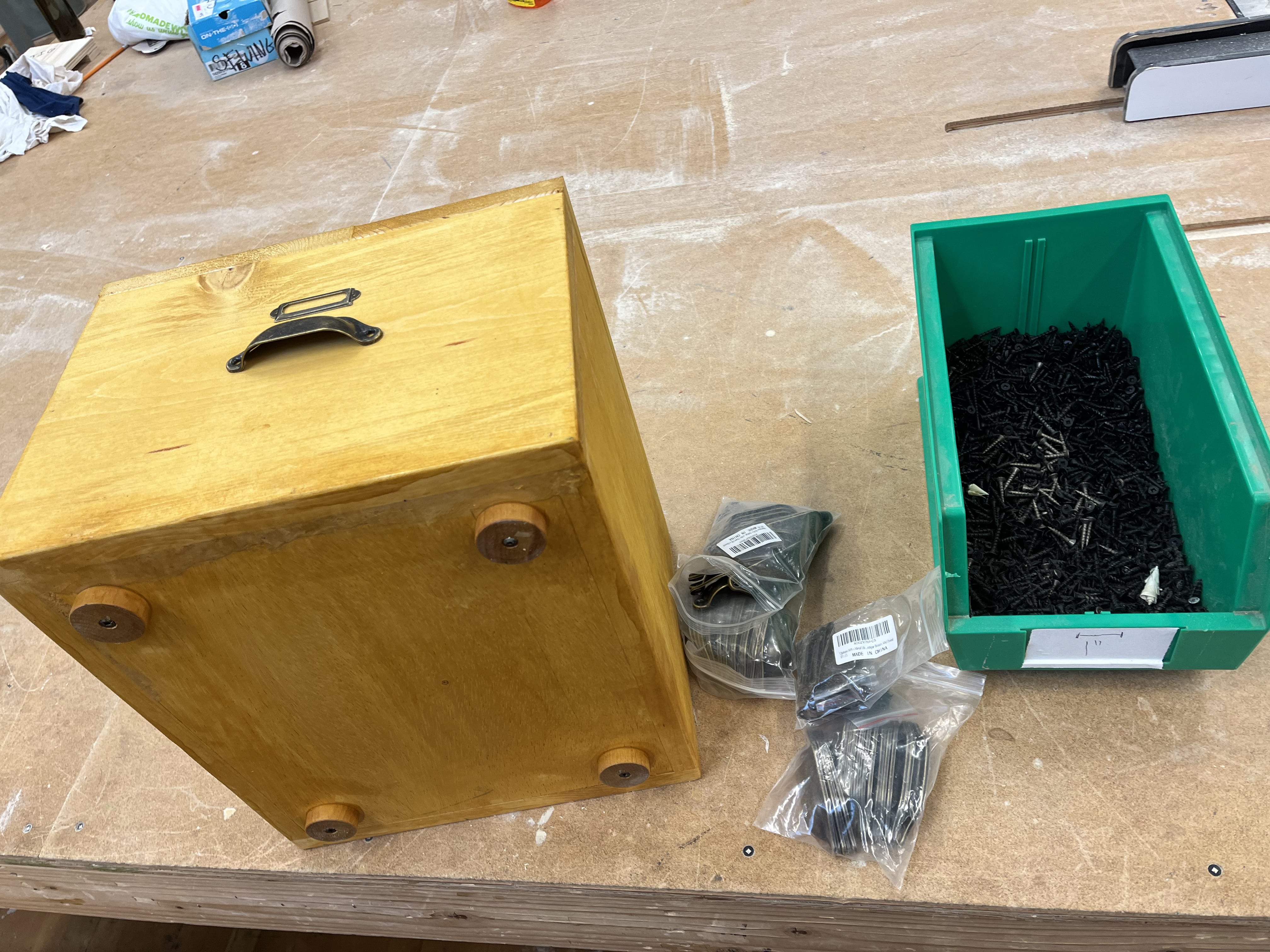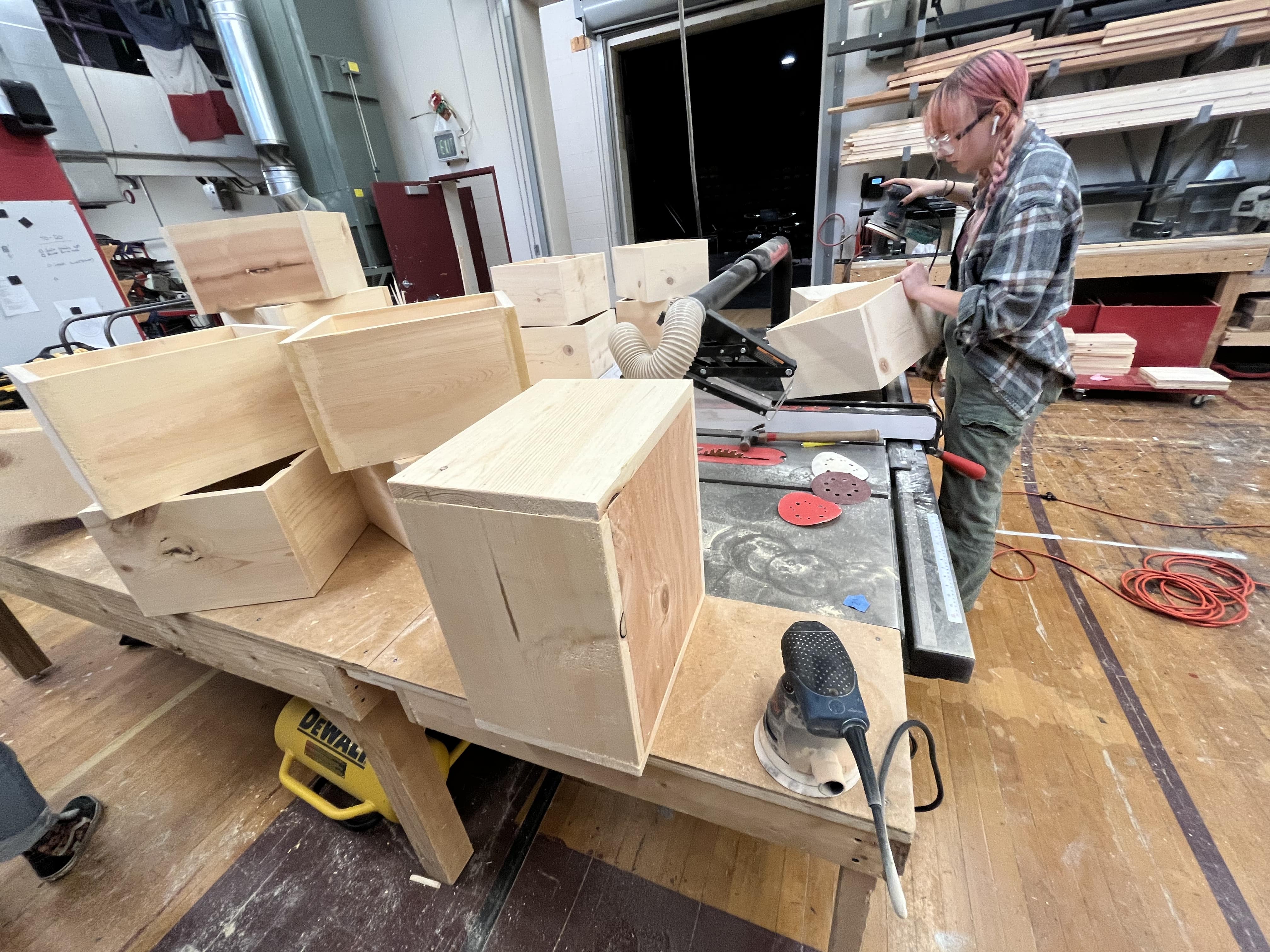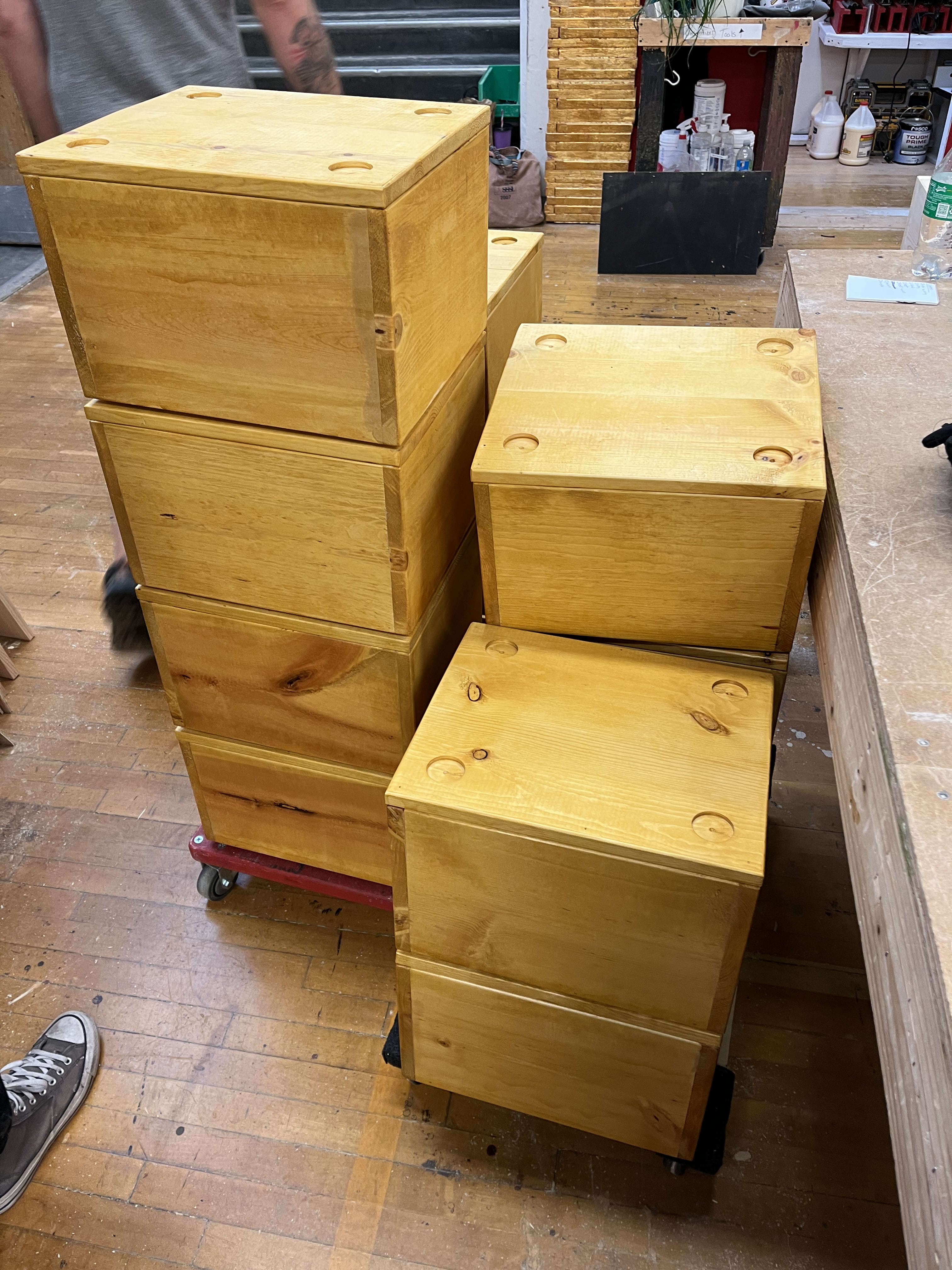 Working with the scene shop, we built 21 crates that made up most of the set in our production. We sanded and routed the crates, then coated them with a layer of Shellac for the color. We added feet and caps to nest the crates on top of each other. I researched the handle and label holders, then I attached them to the boxes. We labeled each crate with a number. We glued most of them shut, and the rest had slots inside that were filled with star plates.