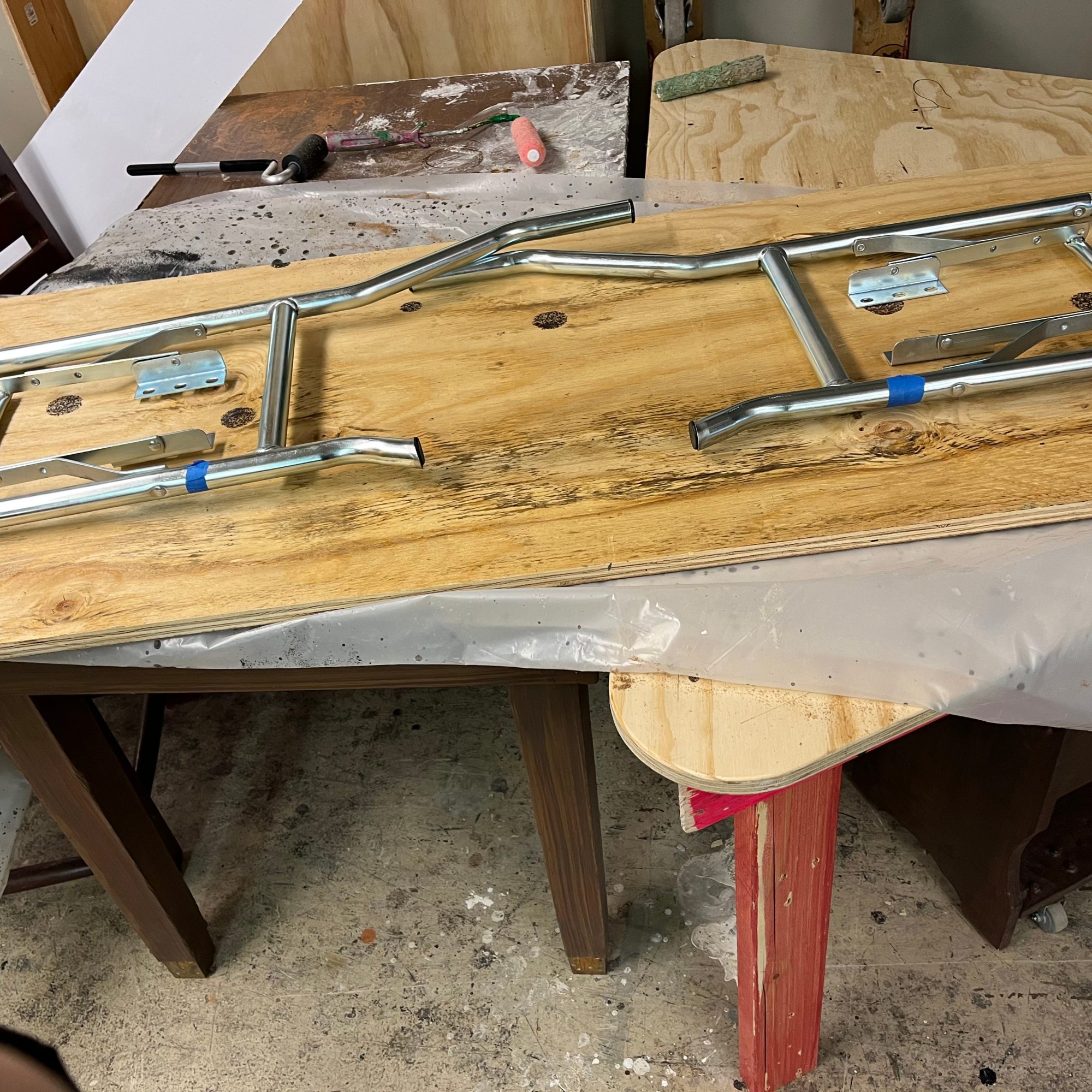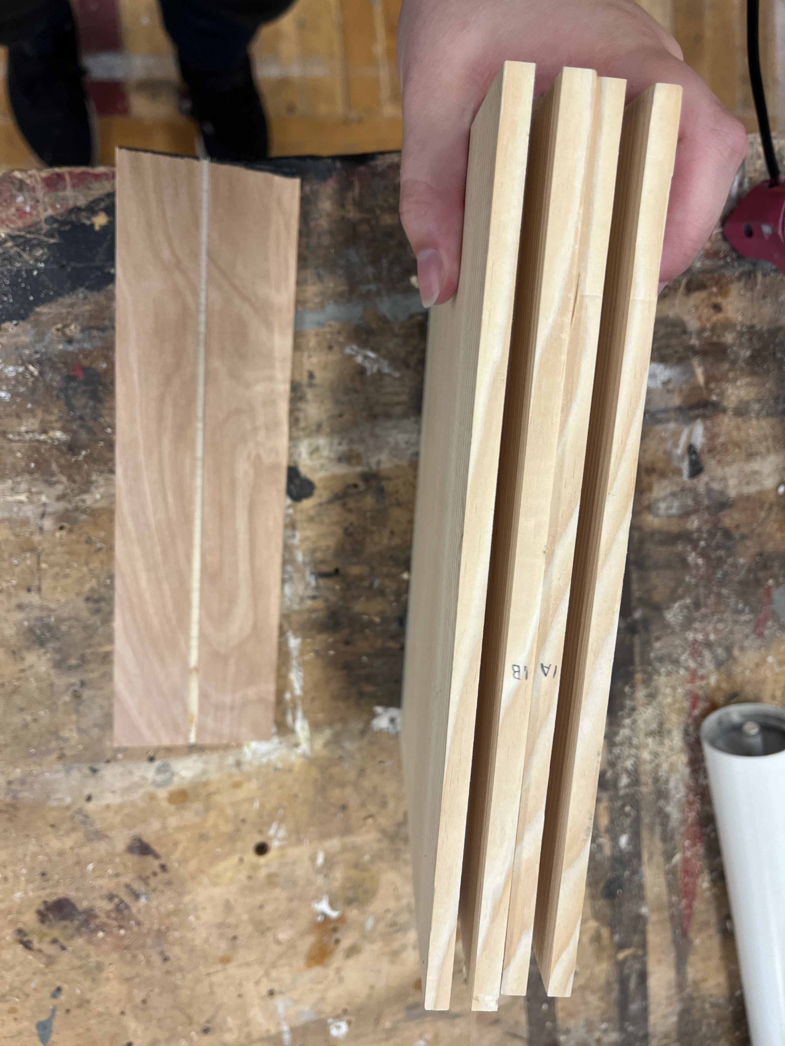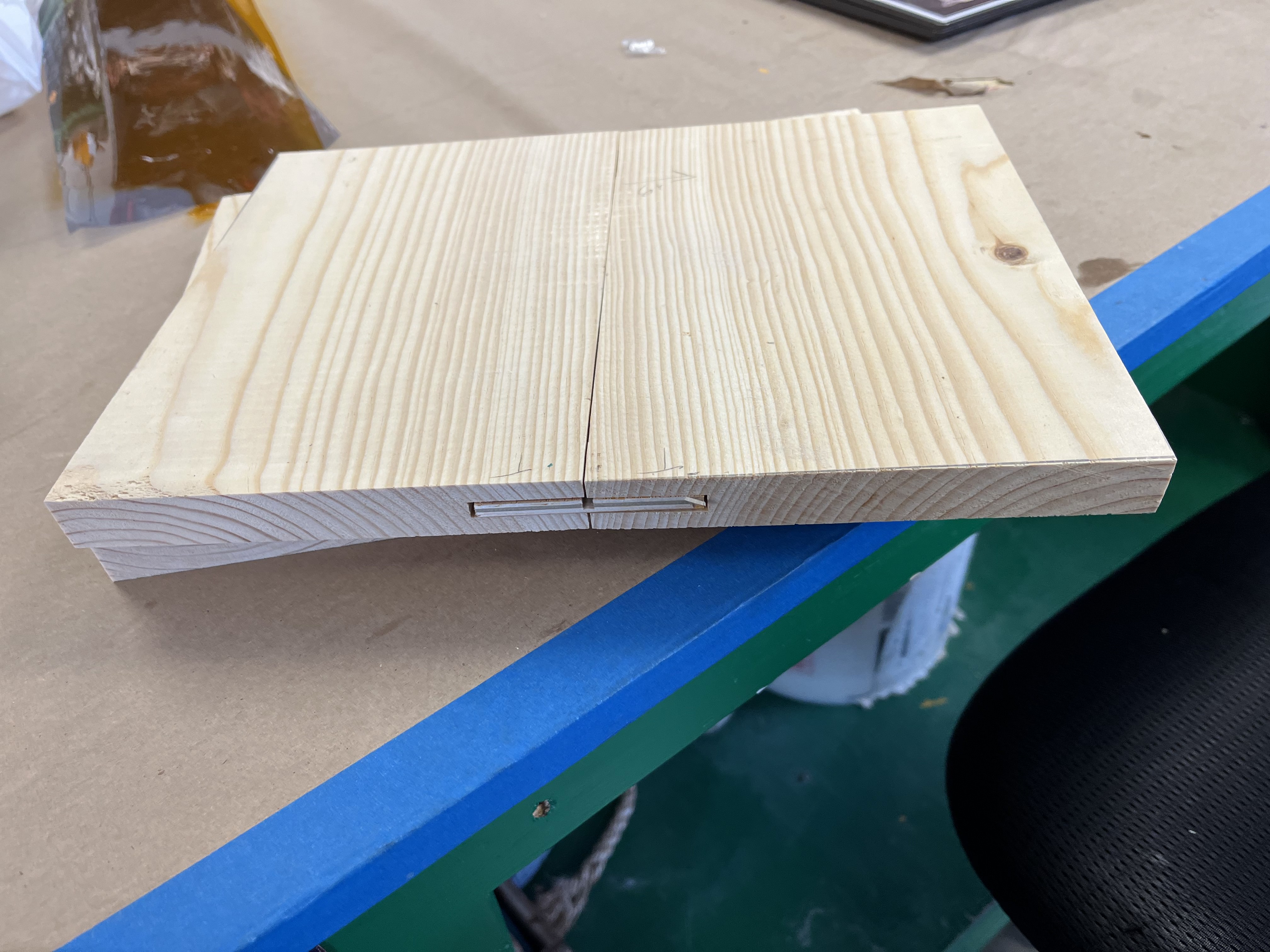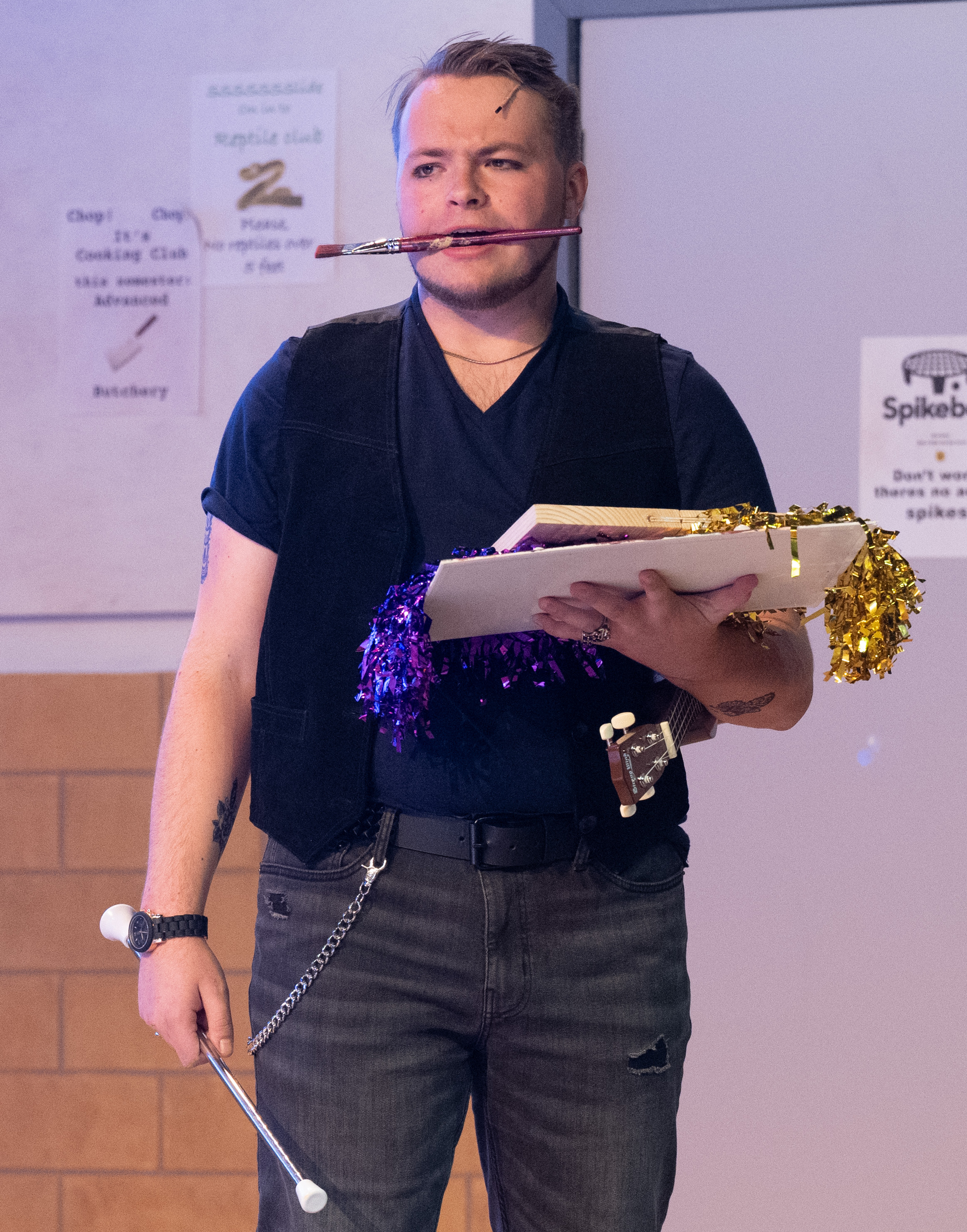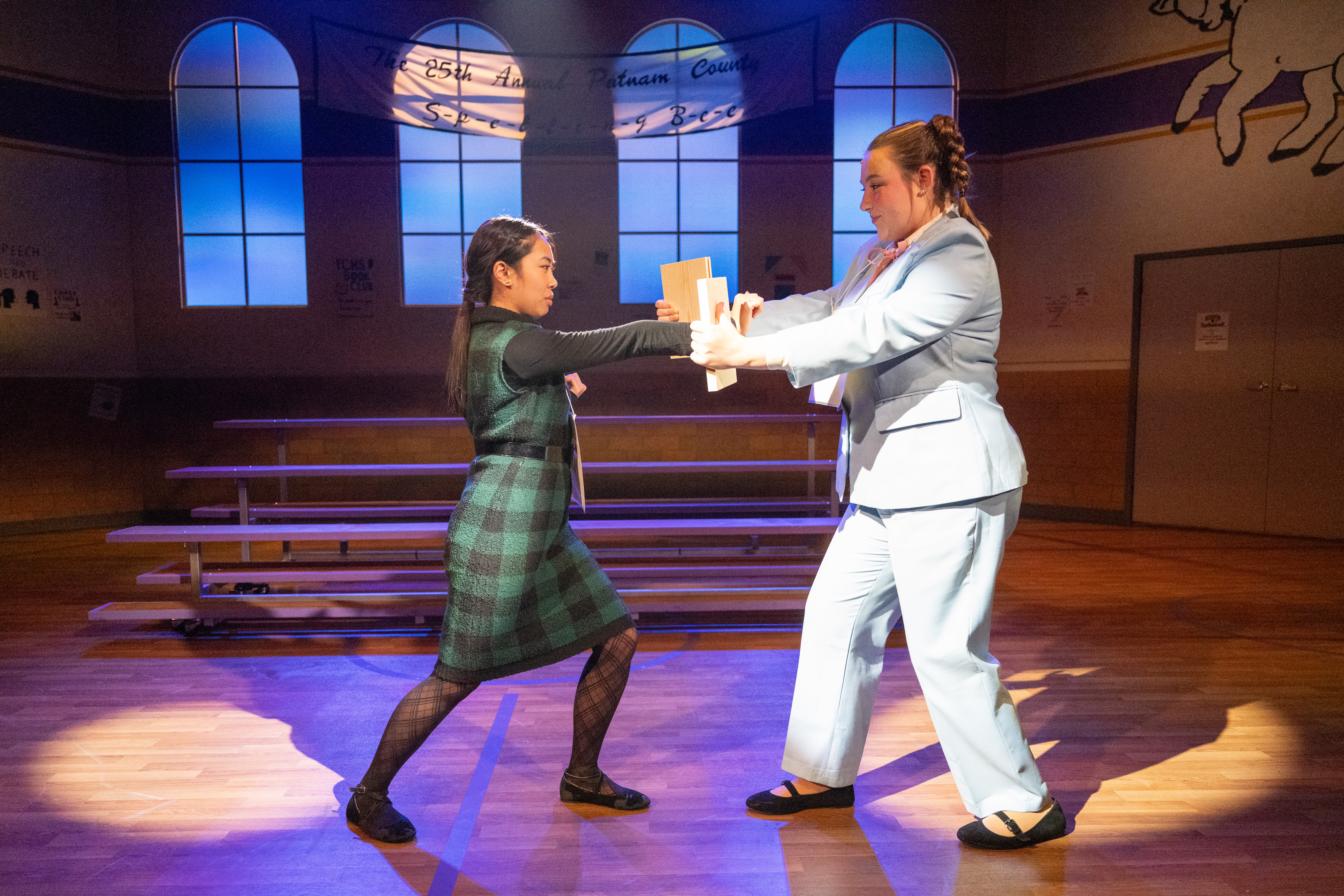 Under Melissa Centgraf’s supervision, we cut a piece of solid wood in half and put a thin, scored insert in the middle so that the break would make a nice sound without being difficult to break. The insert was attached with hot glue at the corners so that it could be removed each night. Initially, we made two reusable boards and multiple inserts for each rehearsal/performance, but we ended up making more boards as backup since the center of the boards sometimes broke along with or instead of the insert. The actress playing Marcy hit the board in the center, marked with a light X, with a palm strike, and the actress playing Logainne bent the boards inward to ensure the board broke.