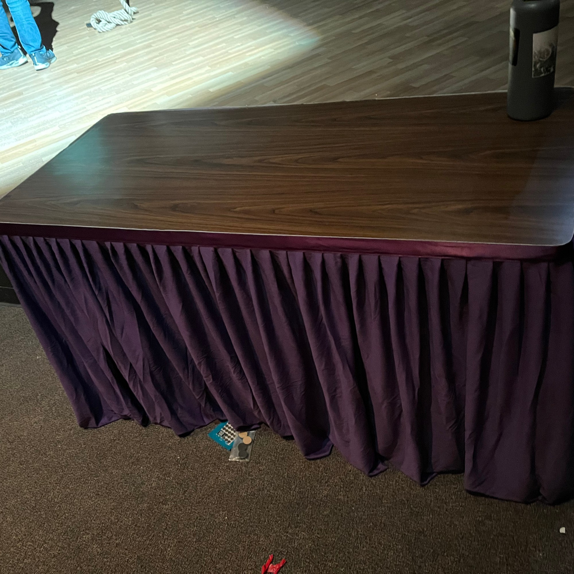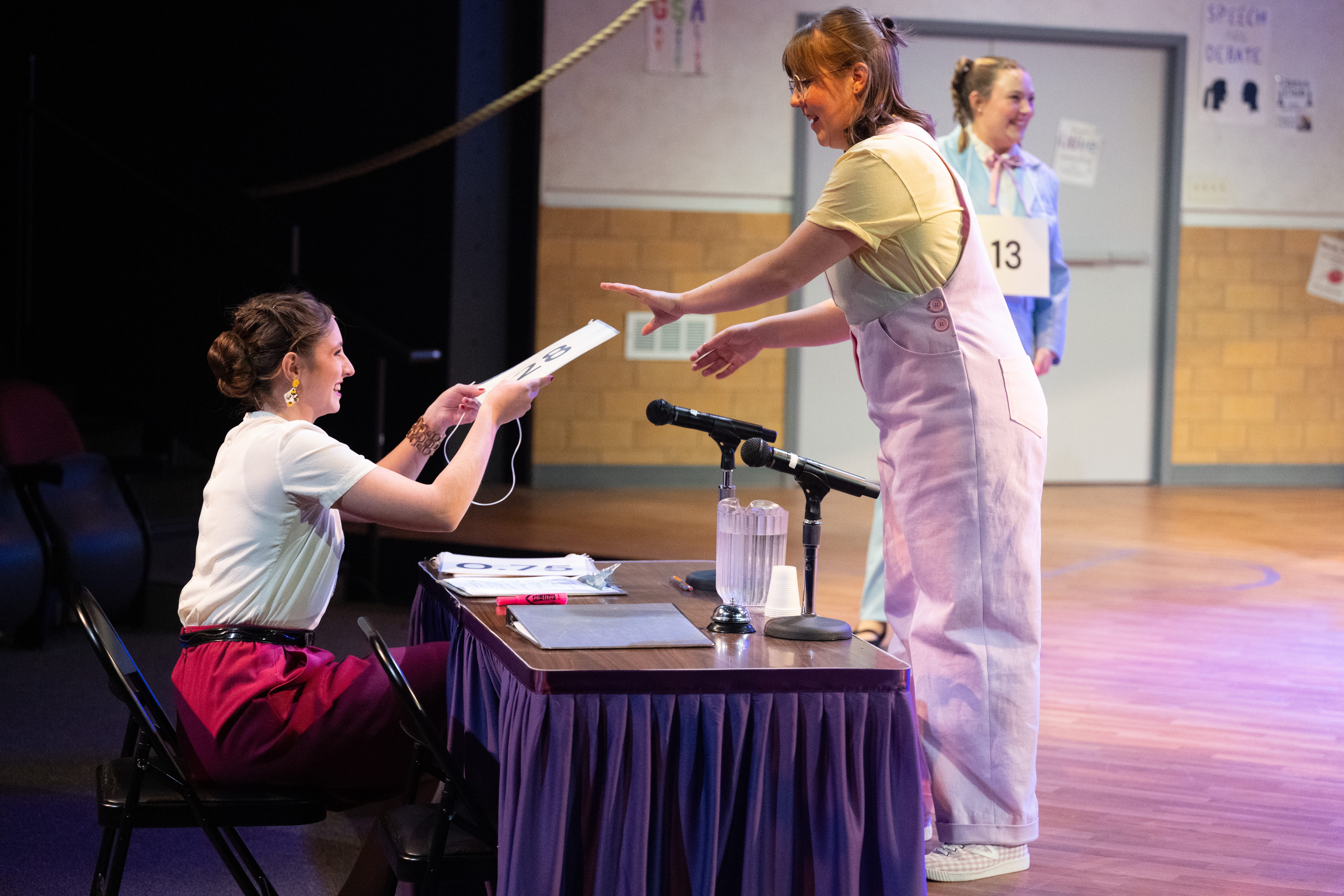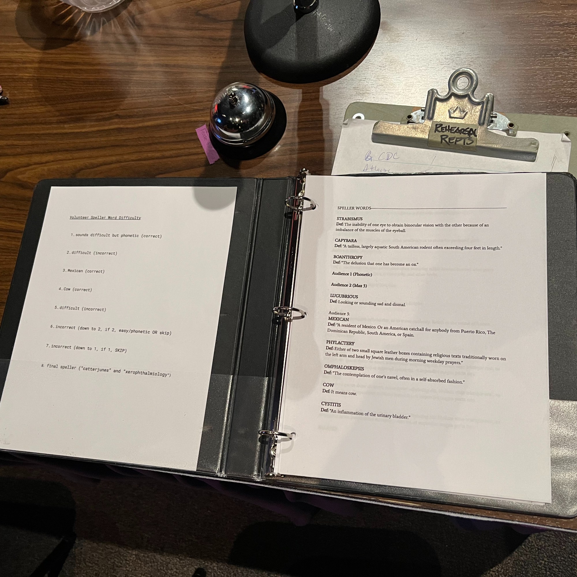 To build Rona and Panch’s table, we cut a piece of wood, I routed the edges, we adhered laminate on top, we cut half of the legs off so that it could sit half on/off the stage, we attached the legs, put a table cloth around the edges with velcro, then Libby Williams cut and hemmed the fabric. From there, we added 2 microphones from Sound. Rona had a clipboard with contestant biographies, and Panch had a binder with spelling words. They had a pitcher of water and small plastic cups. And of course, we had a practical bell for incorrect spellings.
