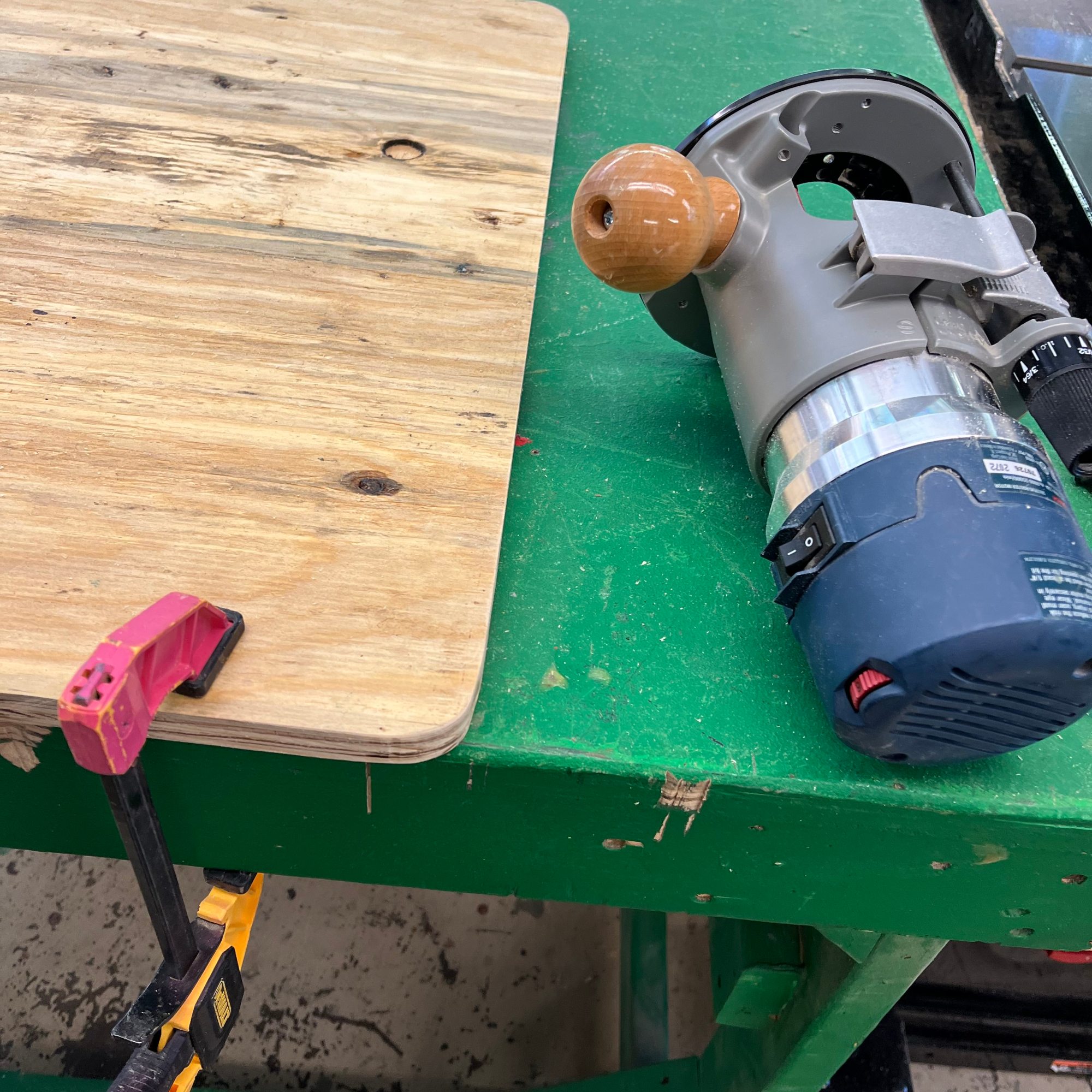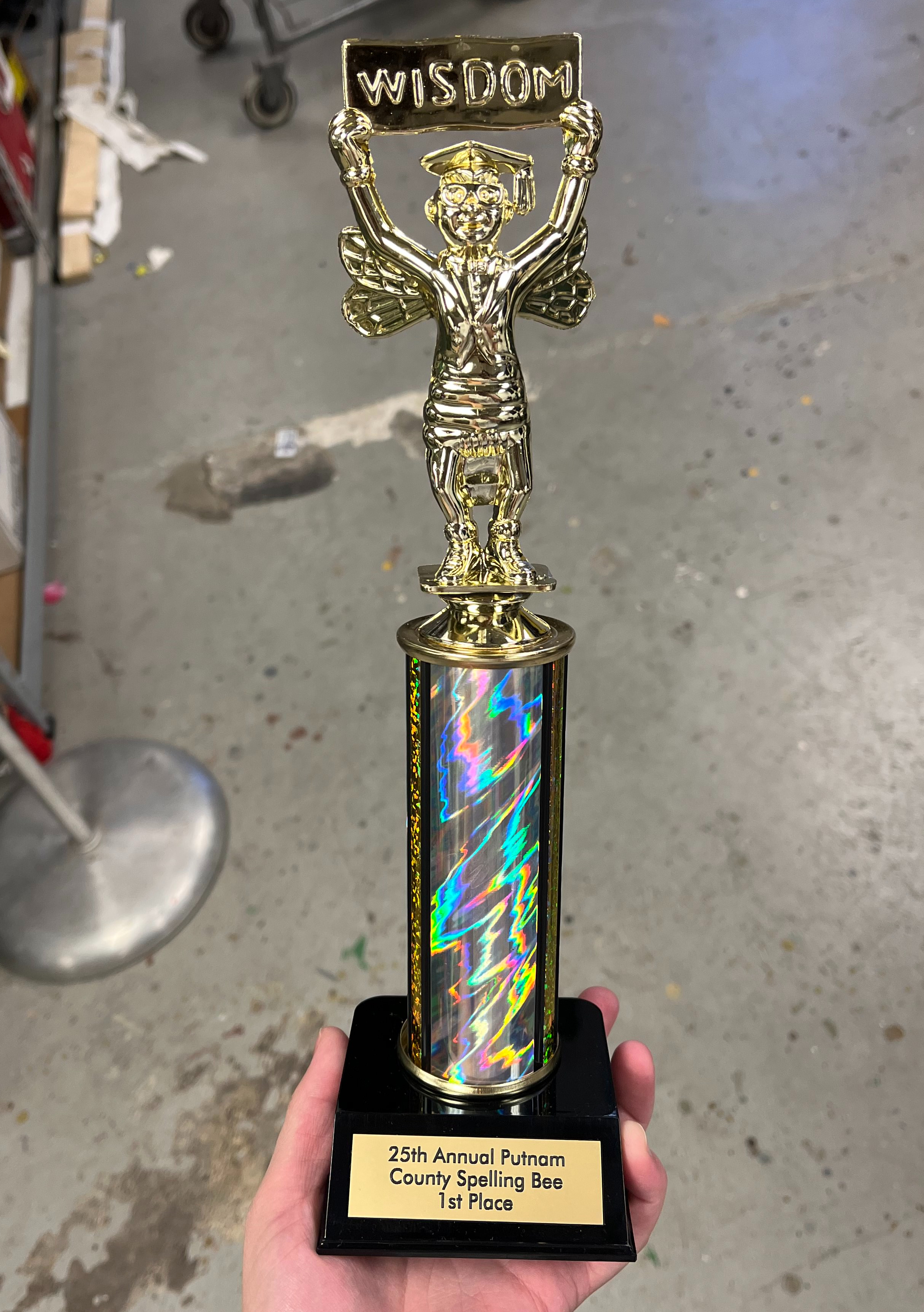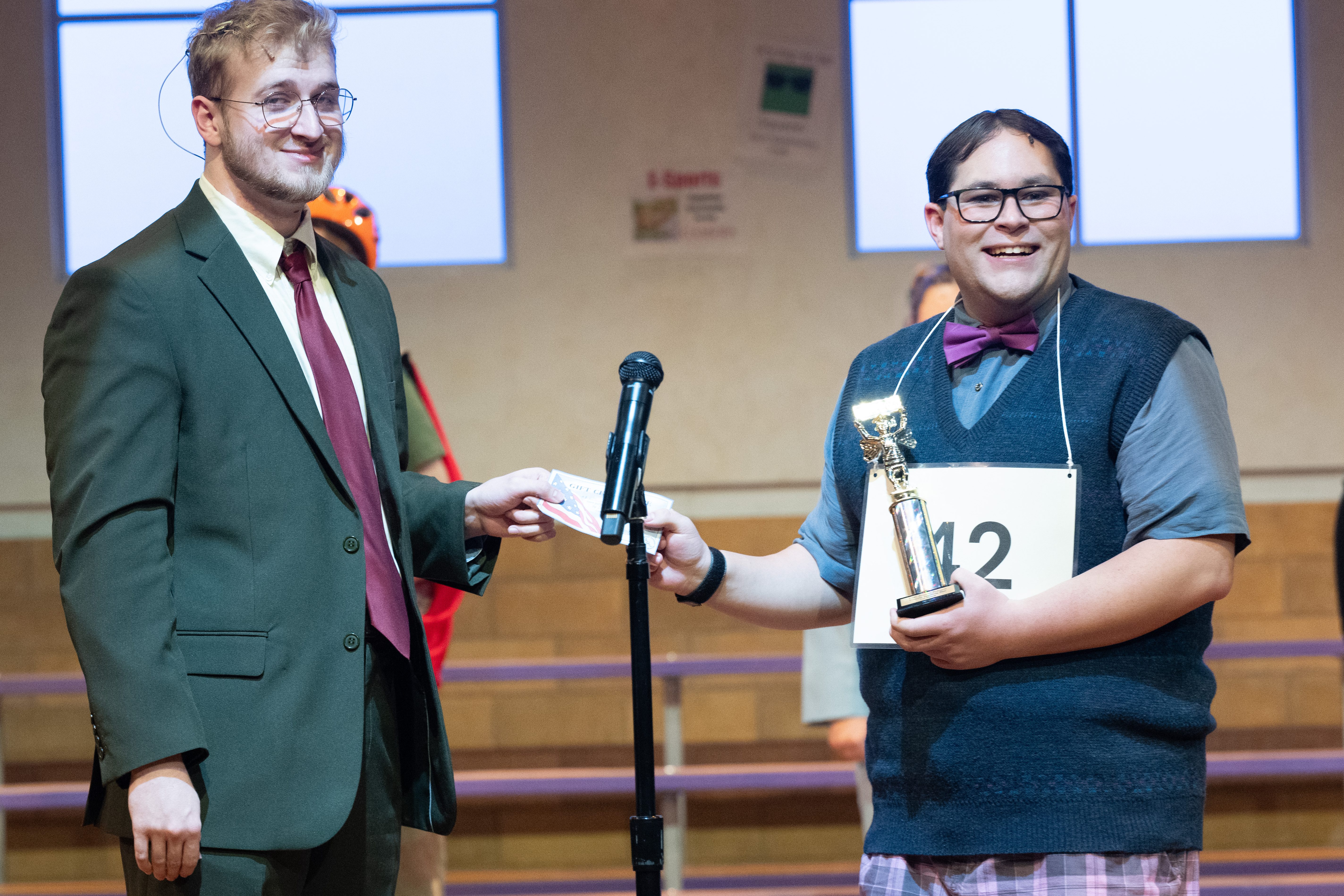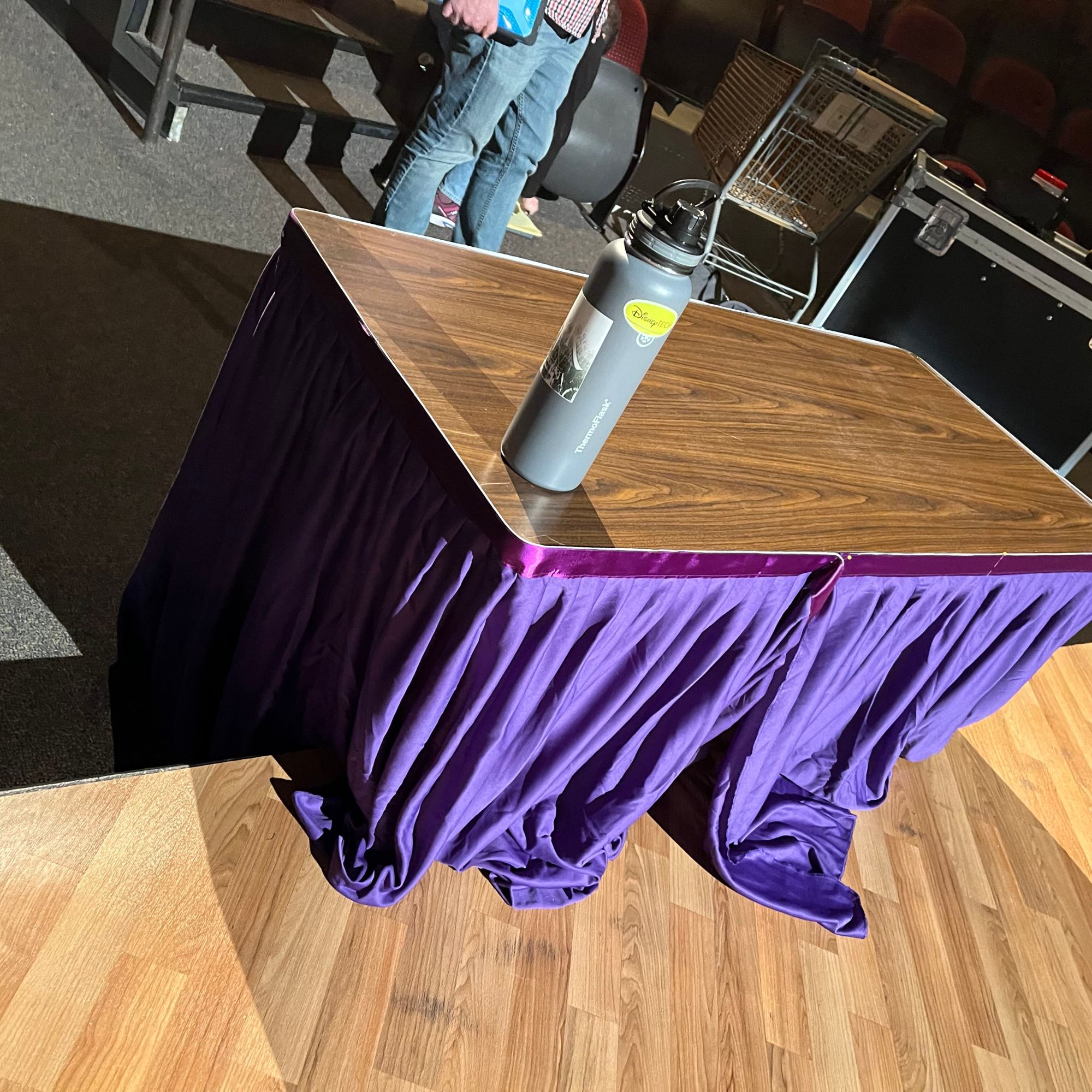 To build Rona and Panch’s table, we cut a piece of wood, I routed the edges, we adhered laminate on top, we cut half of the legs off so that it could sit half on/off the stage, we attached the legs, put a table cloth around the edges with velcro, then Libby Williams cut and hemmed the fabric. From there, we added 2 microphones from Sound. Rona had a clipboard with contestant biographies, and Panch had a binder with spelling words. They had a pitcher of water and small plastic cups. And of course, we had a practical bell for incorrect spellings.