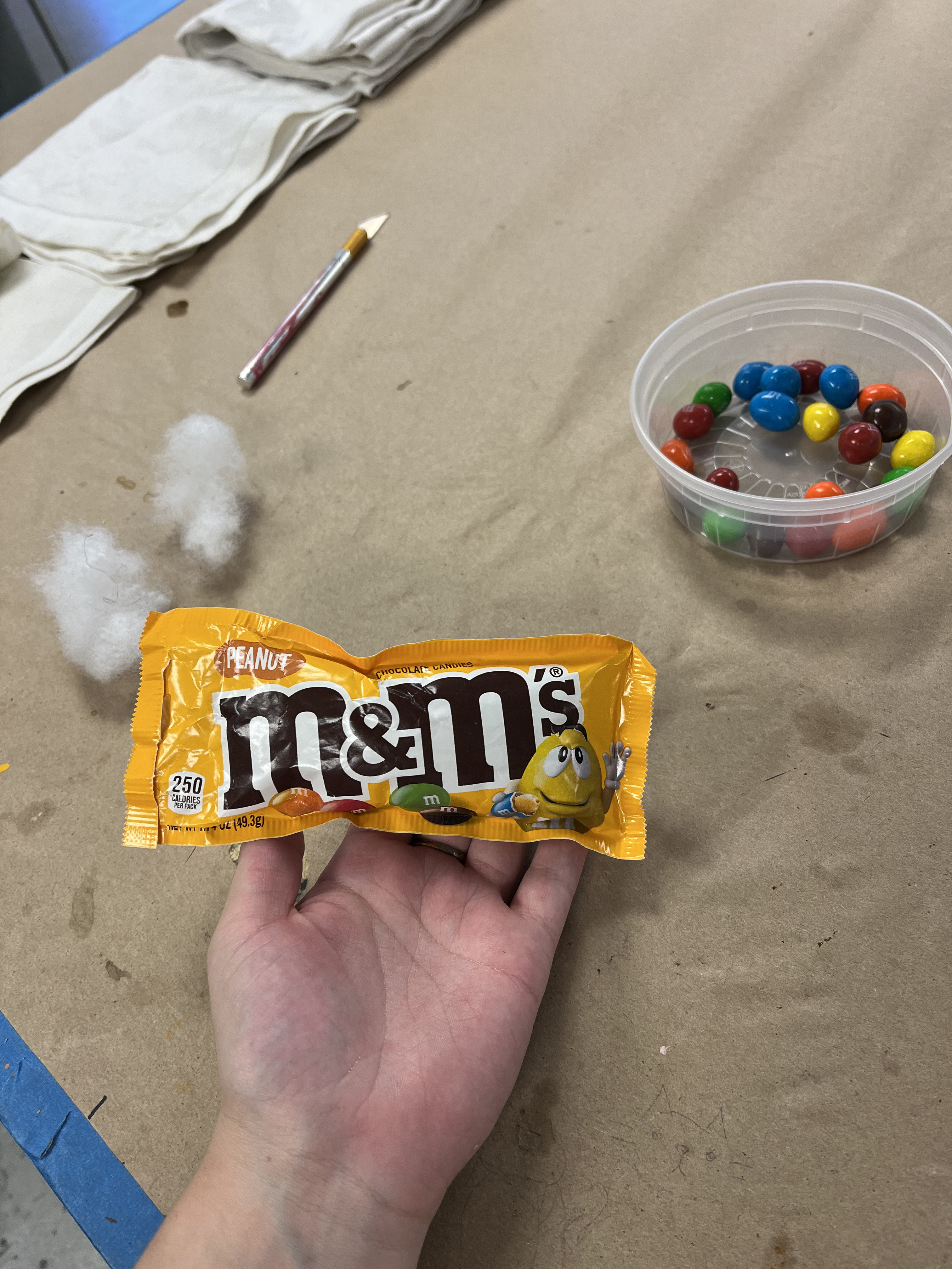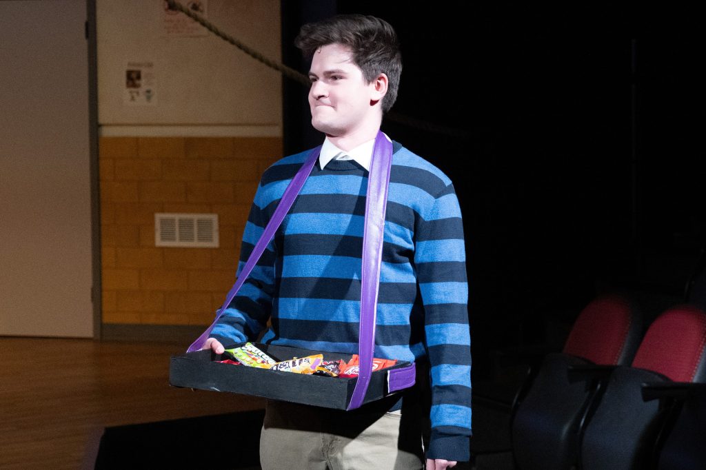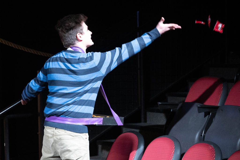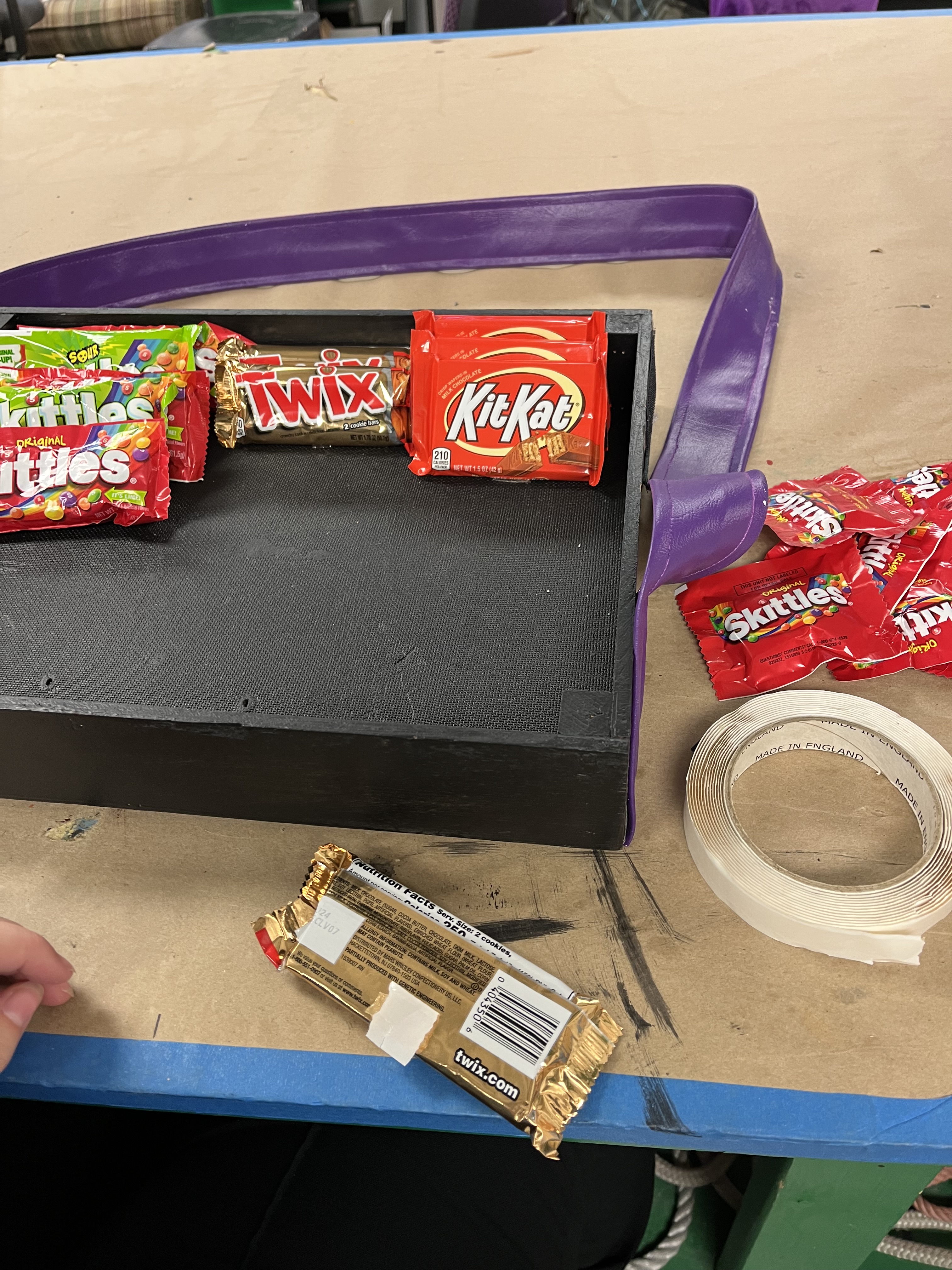 For Chip’s concession tray, we used a previous prop for the tray itself, then cut and measured straps for the neck and waist. We used purple fabric spray so that it would match the school’s colors (based off of the real Fort Collins High School!), and we put Velcro on the box/waist strap so that the actor could adjust to his comfort level. I used rubber adhesive on some candies and stuck them inside the tray so that the only candies he could throw were Skittles and Starbursts. For the Peanut M&Ms, we emptied out a bag and filled it with Poly-fil and a couple hex nuts for weight, then sealed it shut with clear tape.