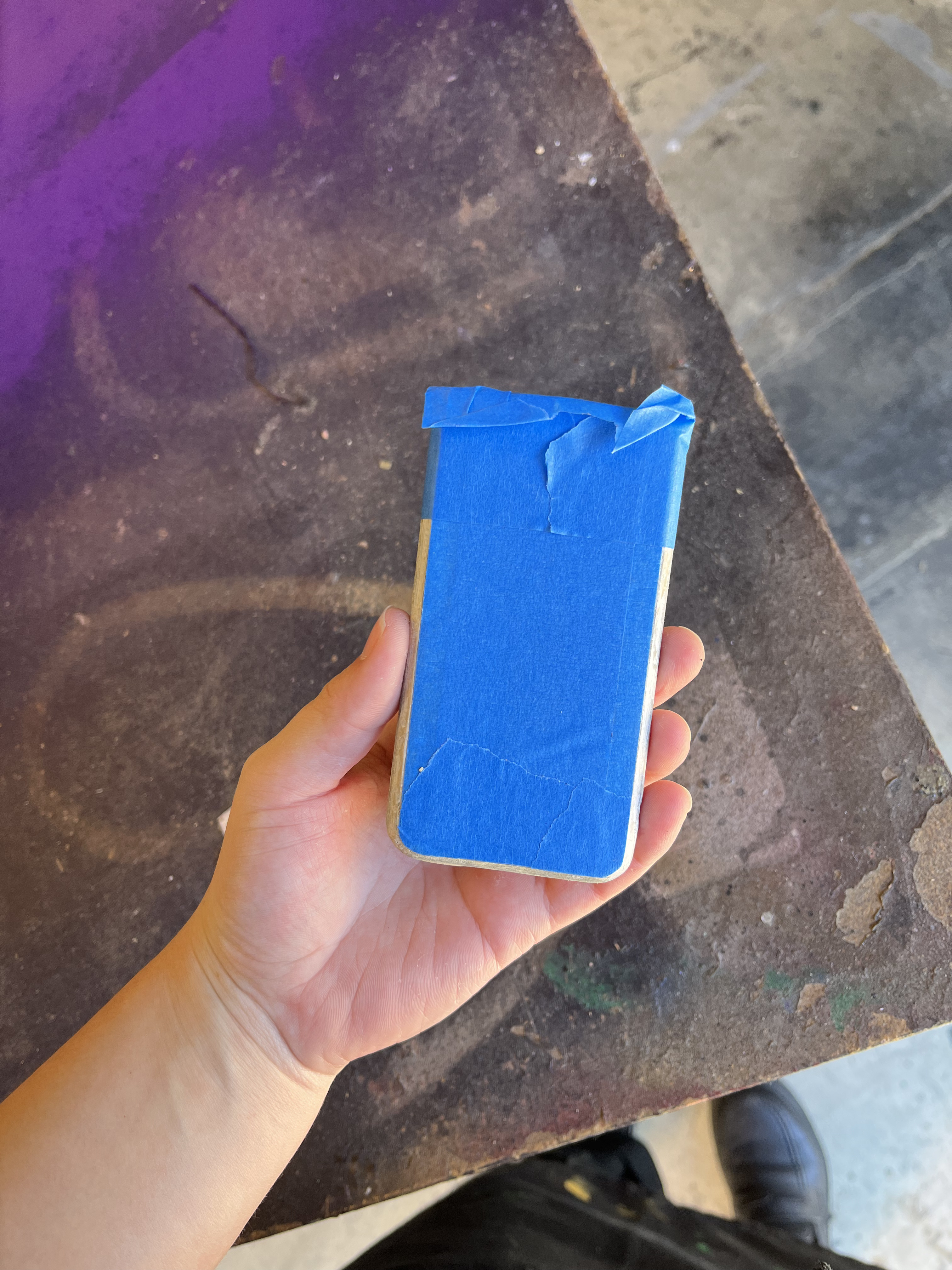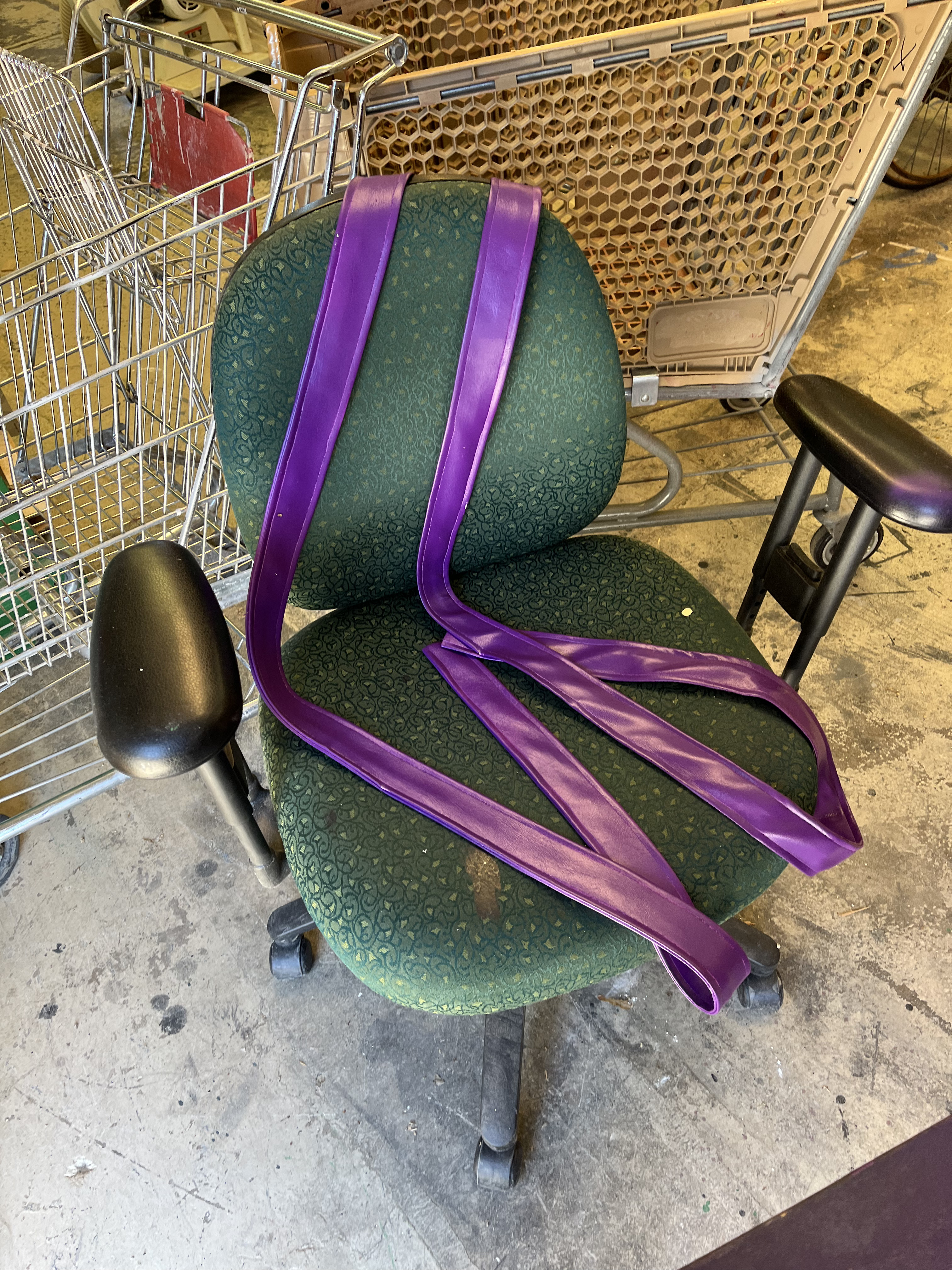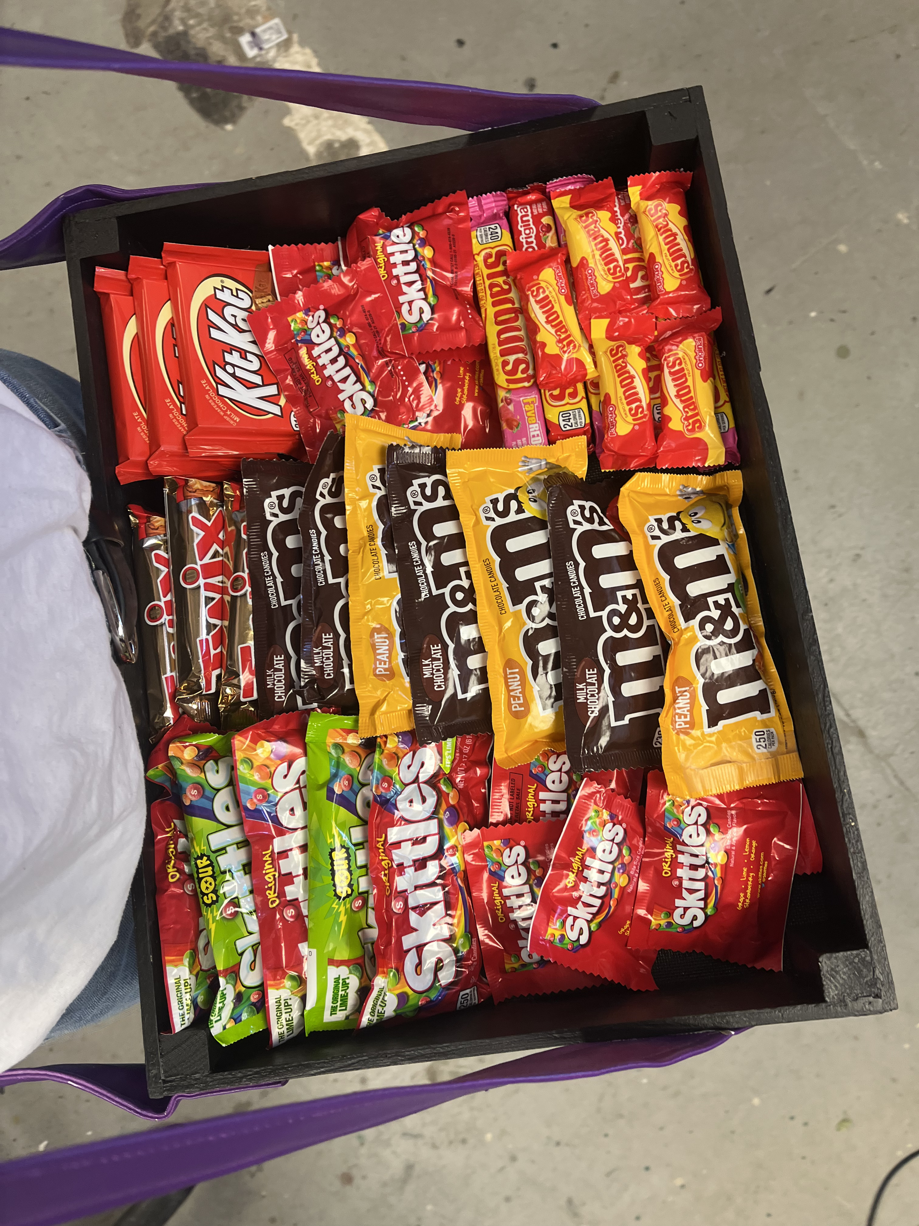 For Chip’s concession tray, we used a previous prop for the tray itself, then cut and measured straps for the neck and waist. We used purple fabric spray so that it would match the school’s colors (based off of the real Fort Collins High School!), and we put Velcro on the box/waist strap so that the actor could adjust to his comfort level. I used rubber adhesive on some candies and stuck them inside the tray so that the only candies he could throw were Skittles and Starbursts. For the Peanut M&Ms, we emptied out a bag and filled it with Poly-fil and a couple hex nuts for weight, then sealed it shut with clear tape.
