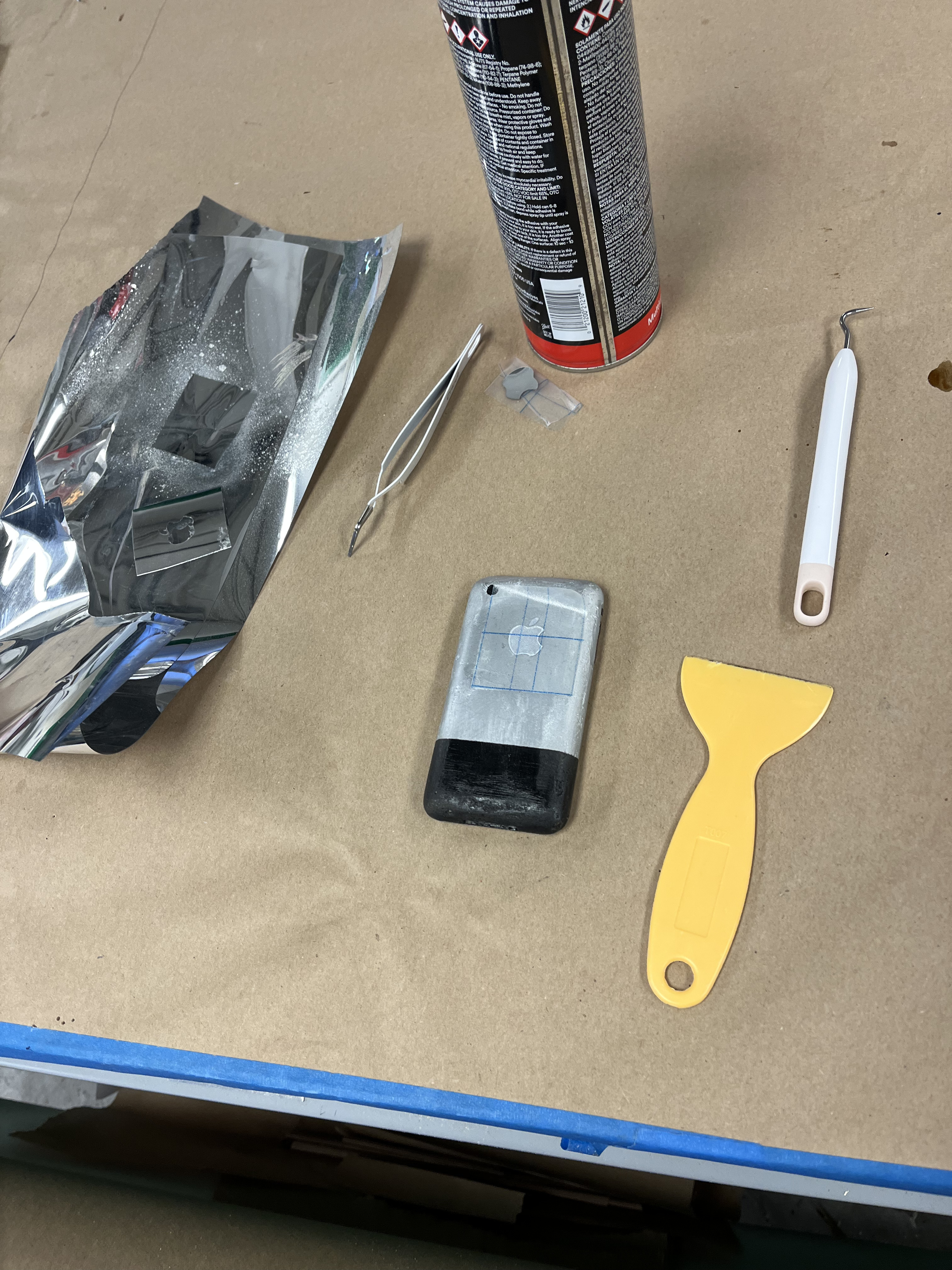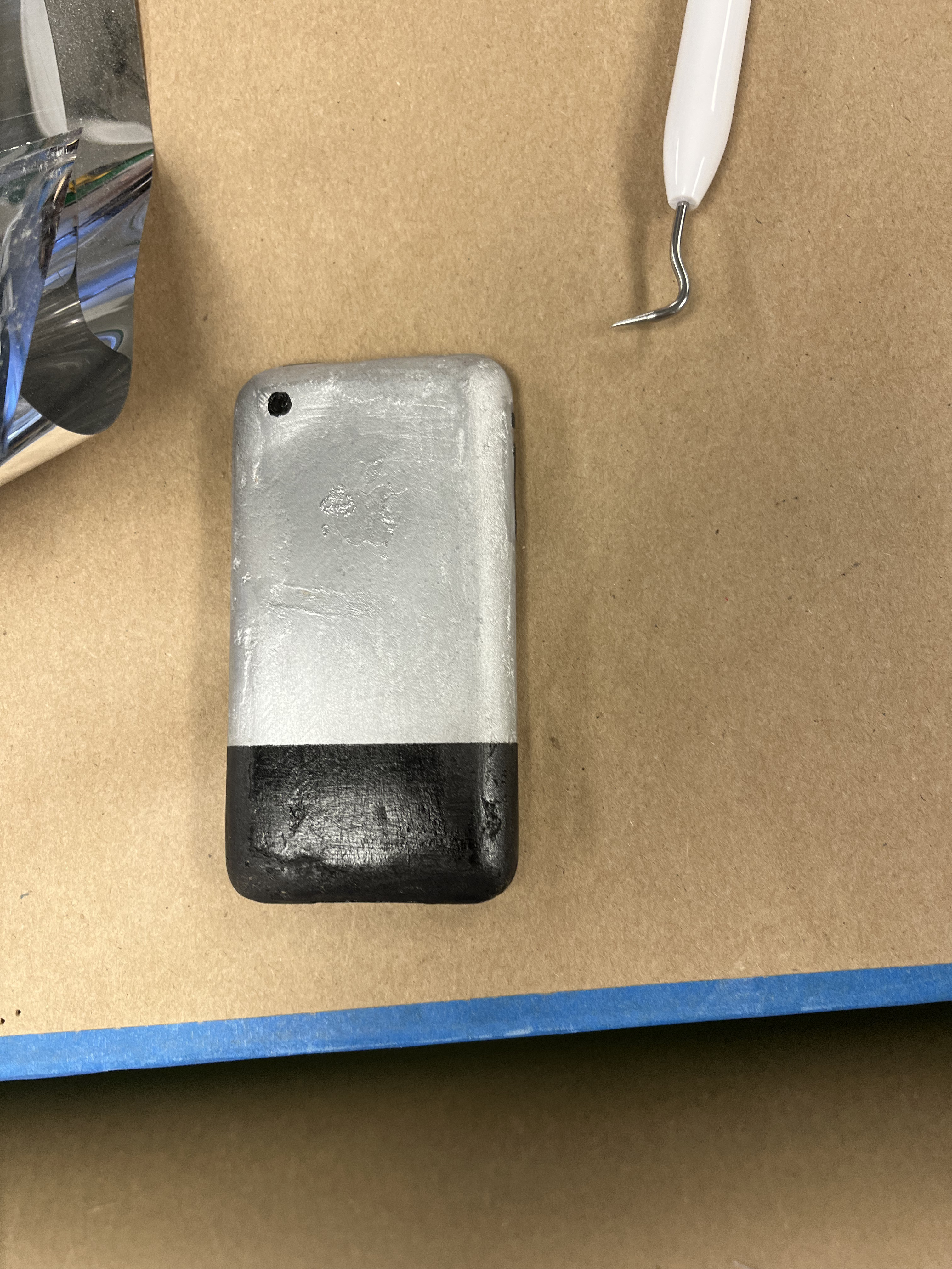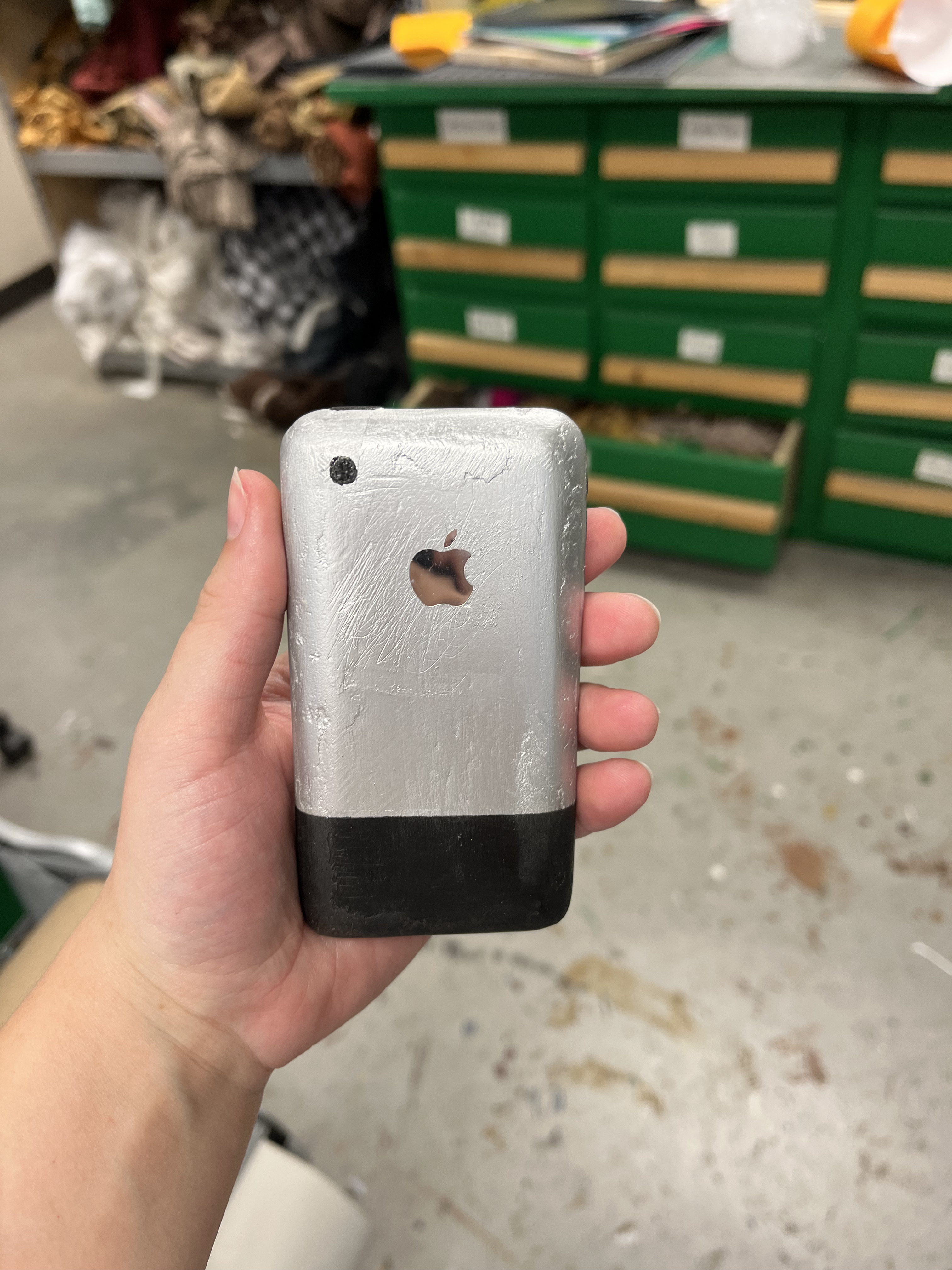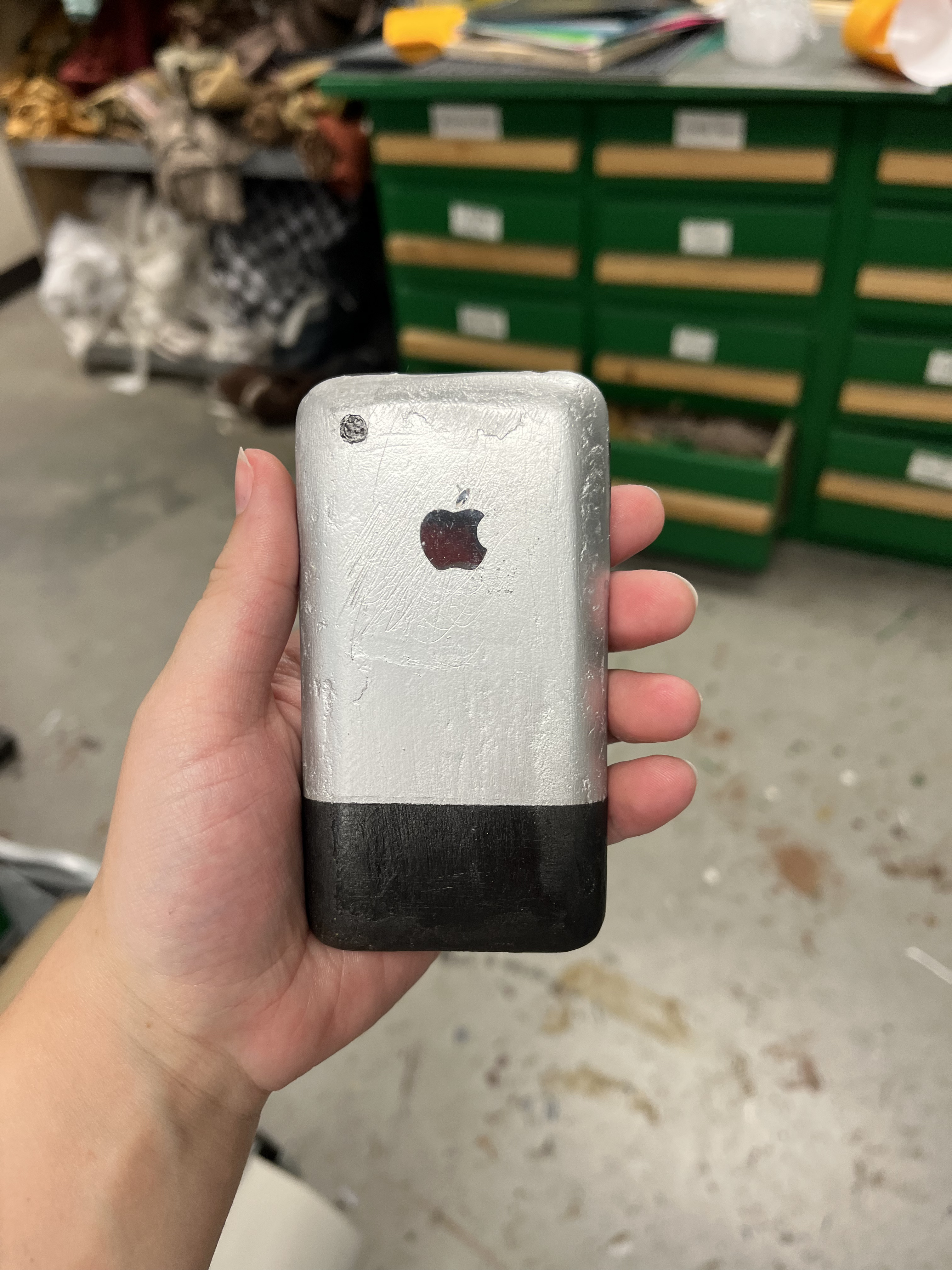 This production was set in 2008, so we wanted Logainne’s dads to have a 1st Generation iPhone. To do this, I 3D printed one, then Kaleb Chaney put wood filler on it. We sanded it down to make it smoother. I spray painted it black and silver and hand painted the button details on. Finally, we used the Cricut to print an Apple logo, and we applied that on the back of the phone with spray adhesive.