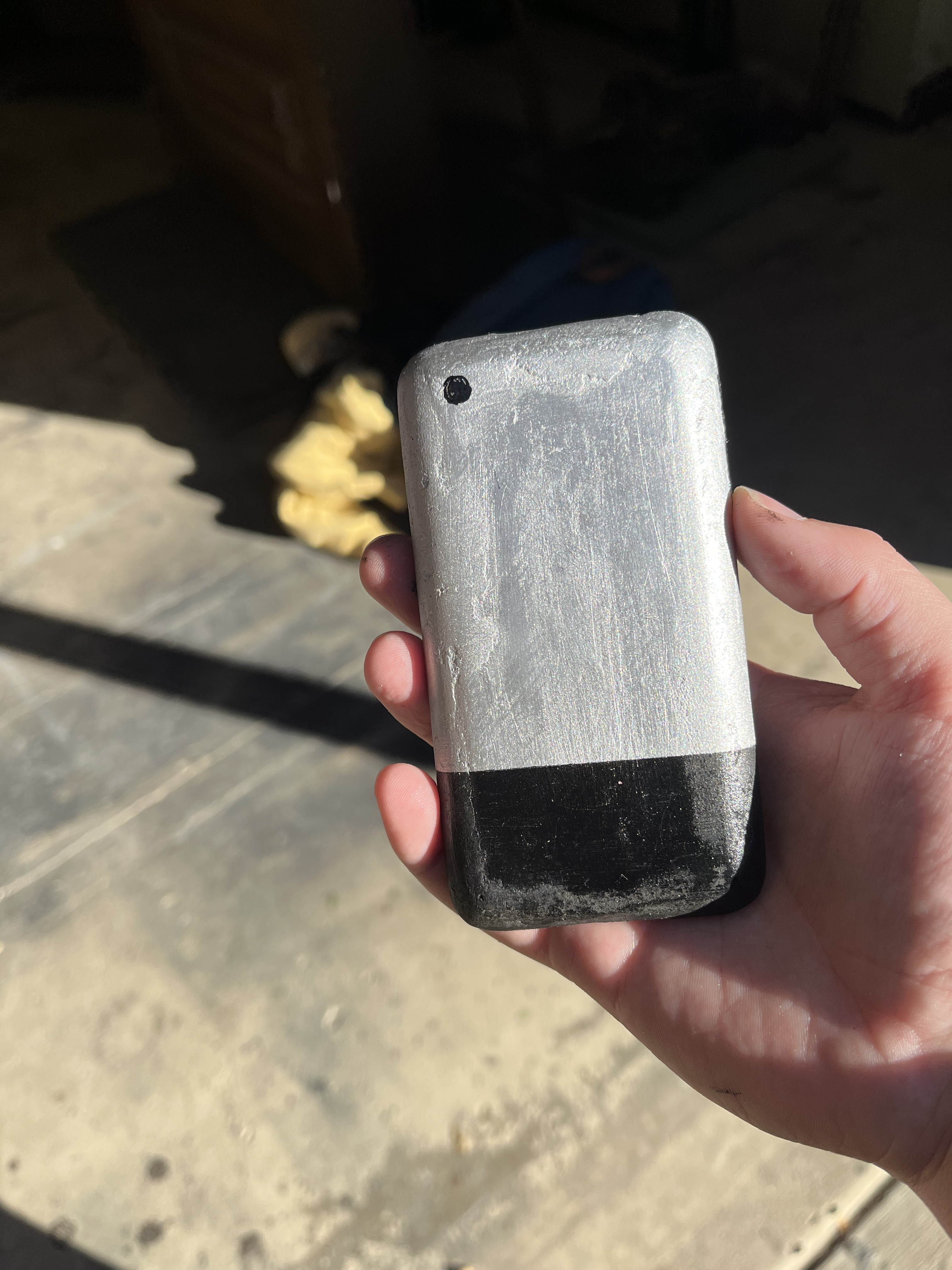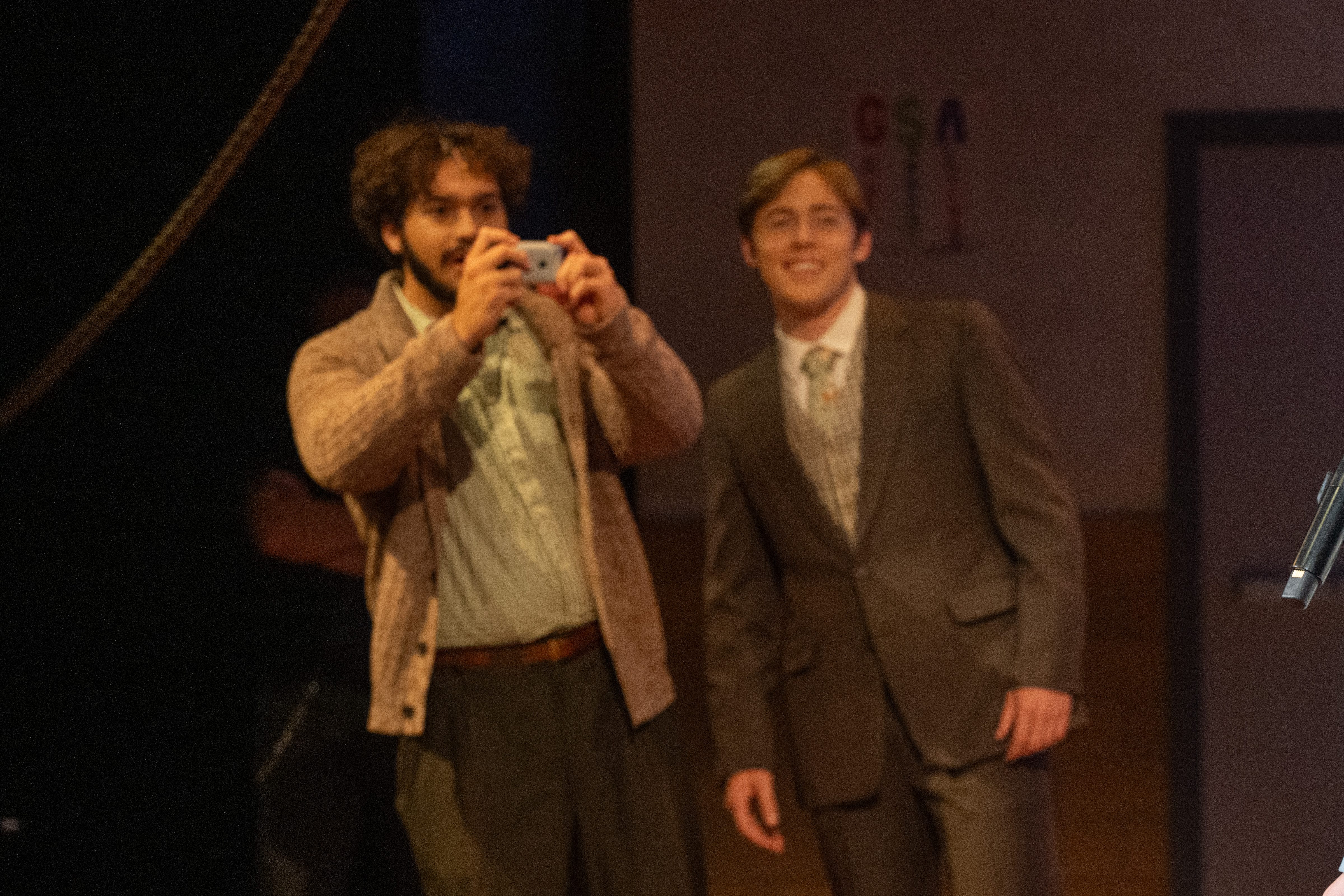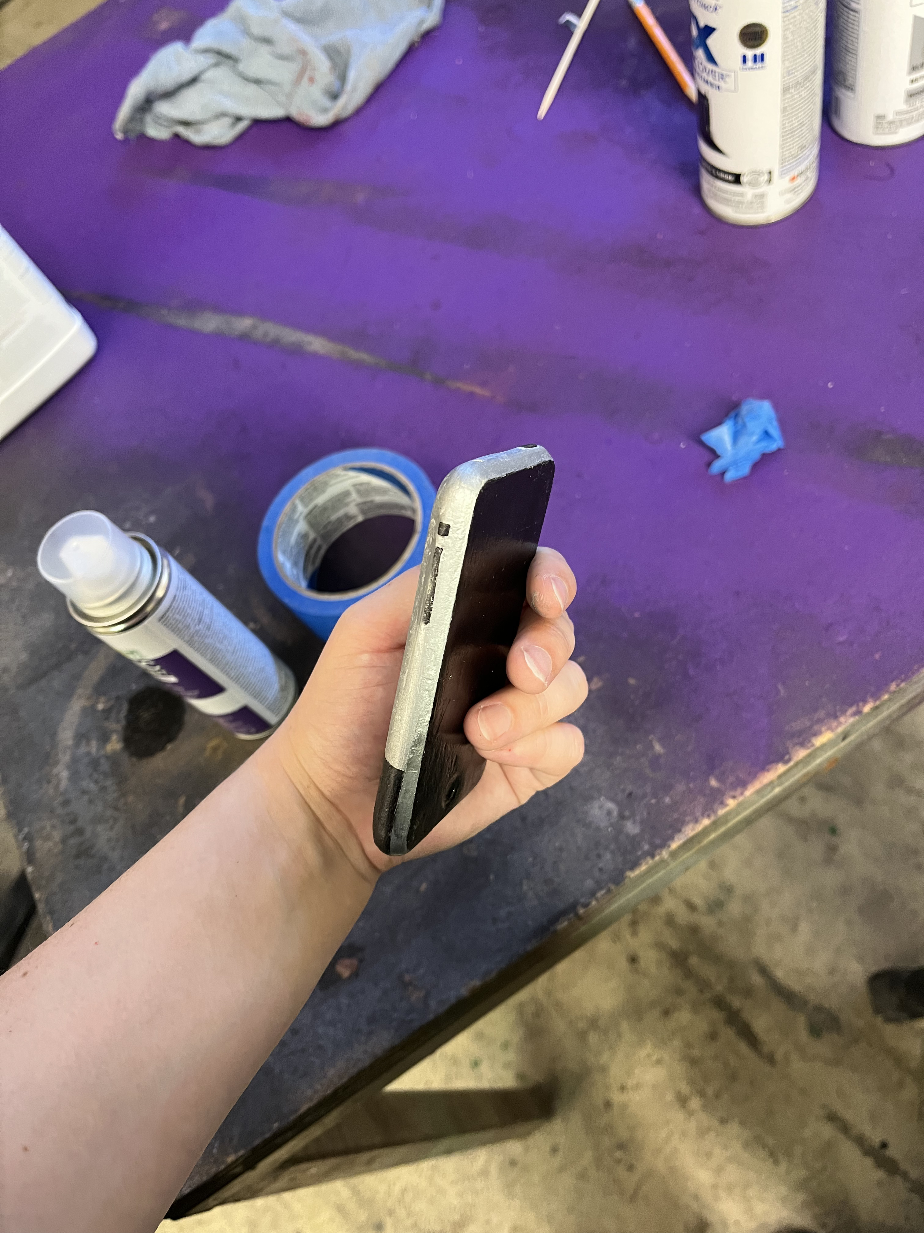 This production was set in 2008, so we wanted Logainne’s dads to have a 1st Generation iPhone. To do this, I 3D printed one, then Kaleb Chaney put wood filler on it. We sanded it down to make it smoother. I spray painted it black and silver and hand painted the button details on. Finally, we used the Cricut to print an Apple logo, and we applied that on the back of the phone with spray adhesive.