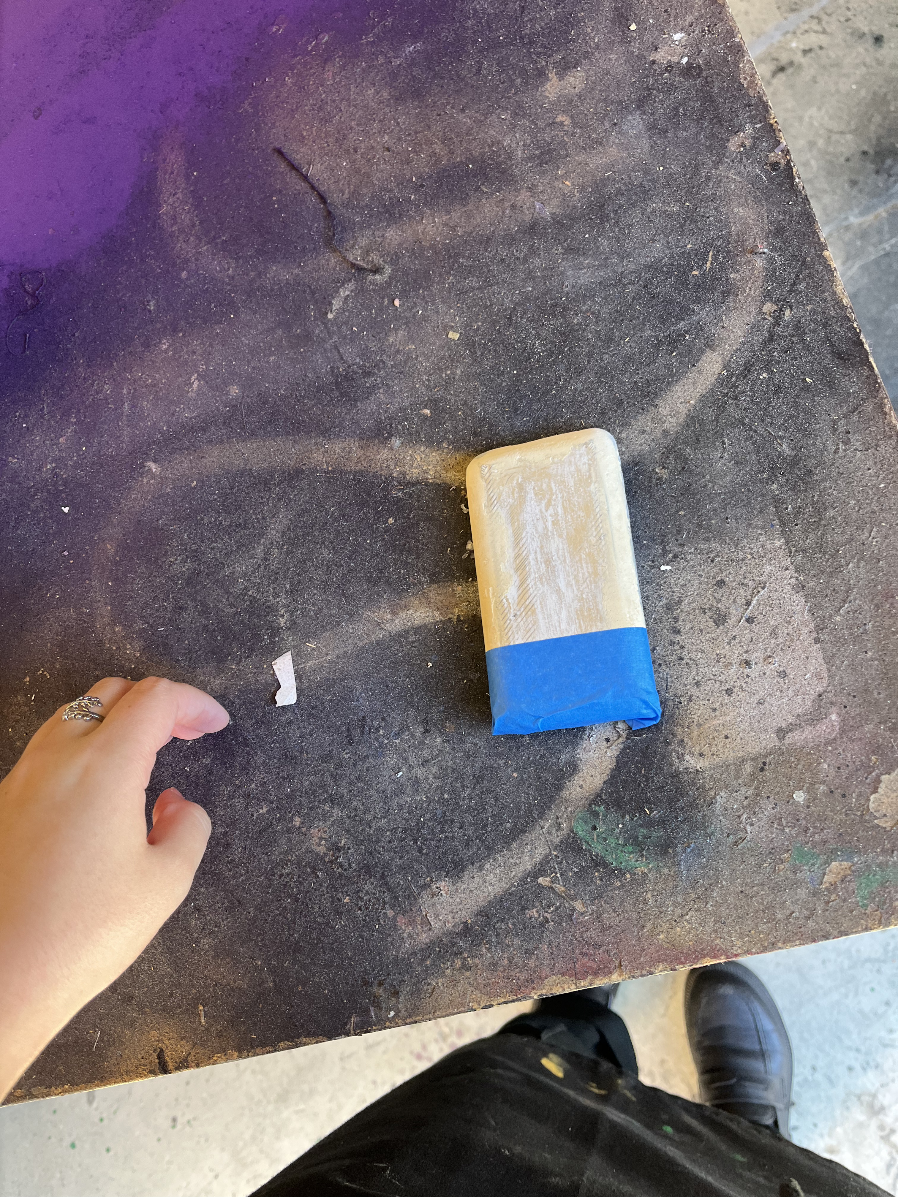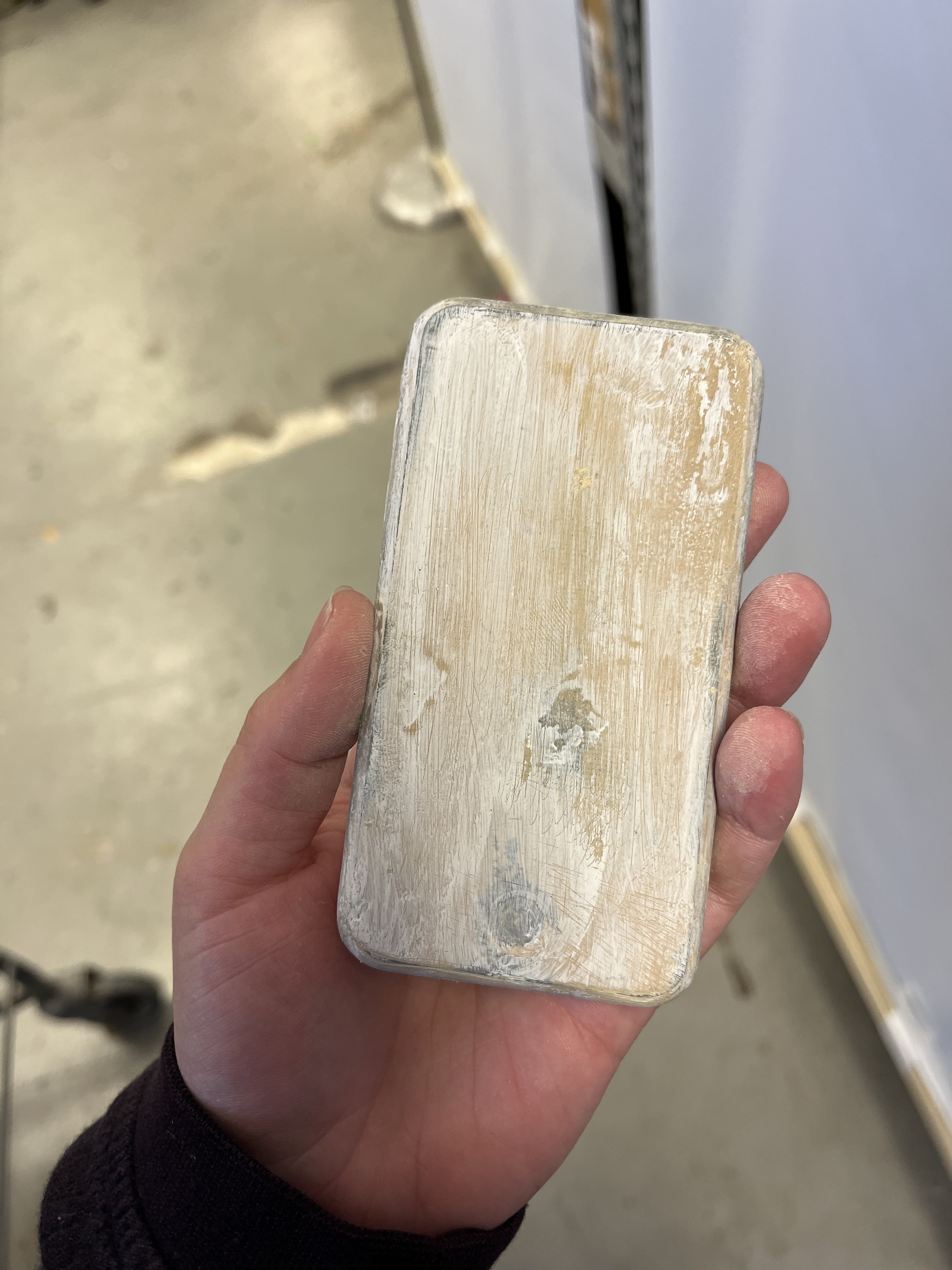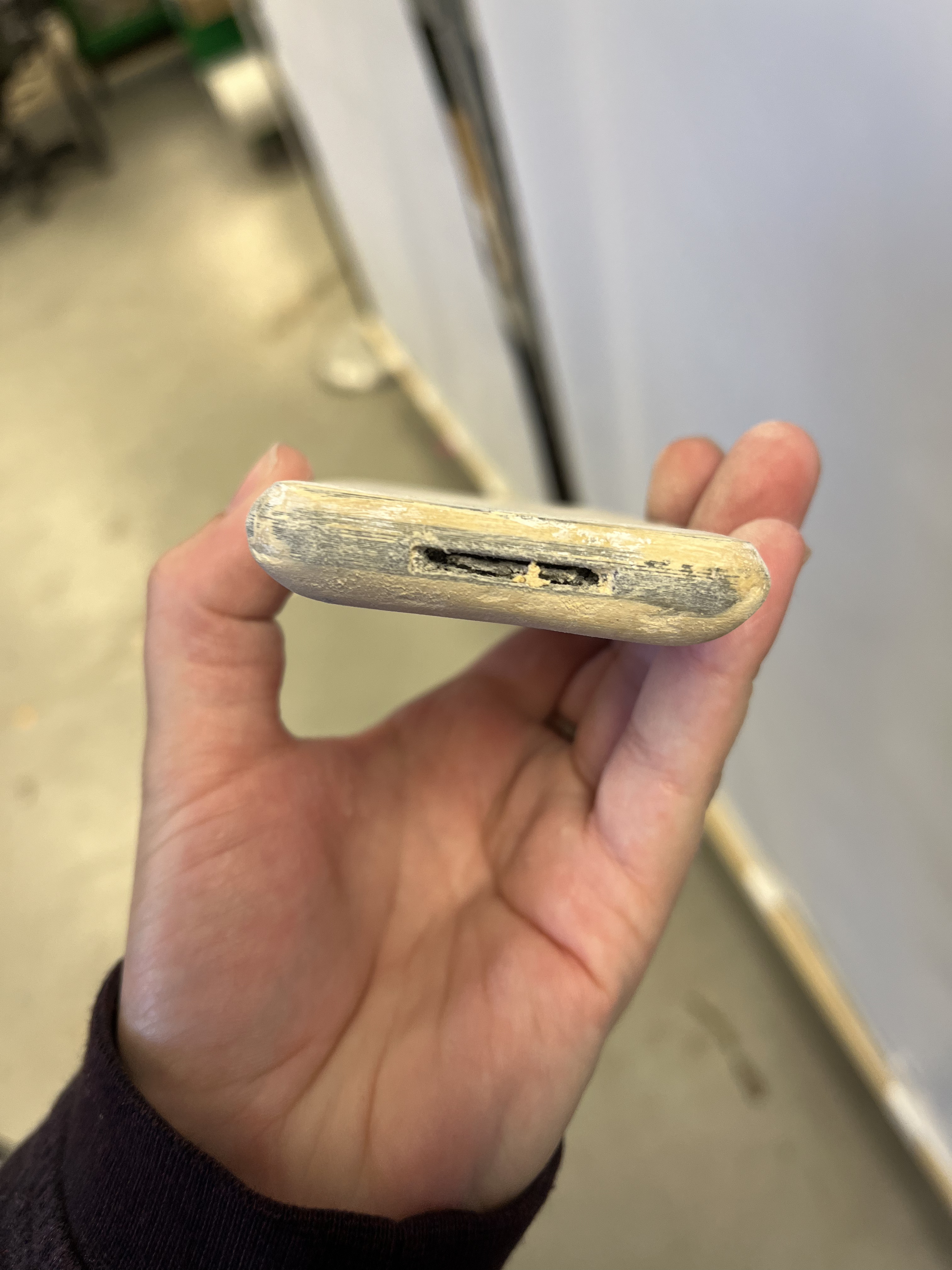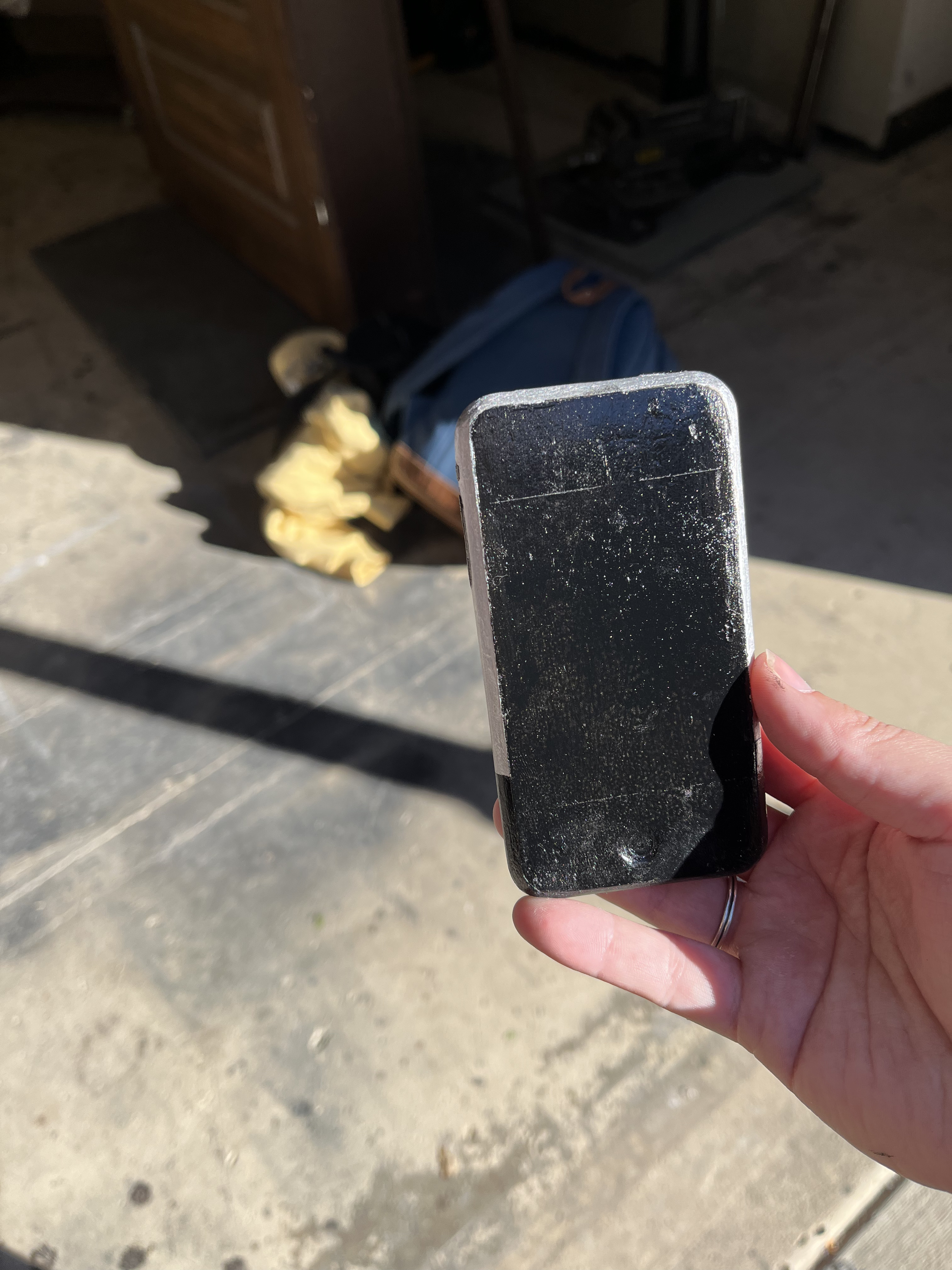This production was set in 2008, so we wanted Logainne’s dads to have a 1st Generation iPhone. To do this, I 3D printed one, then Kaleb Chaney put wood filler on it. We sanded it down to make it smoother. I spray painted it black and silver and hand painted the button details on. Finally, we used the Cricut to print an Apple logo, and we applied that on the back of the phone with spray adhesive.