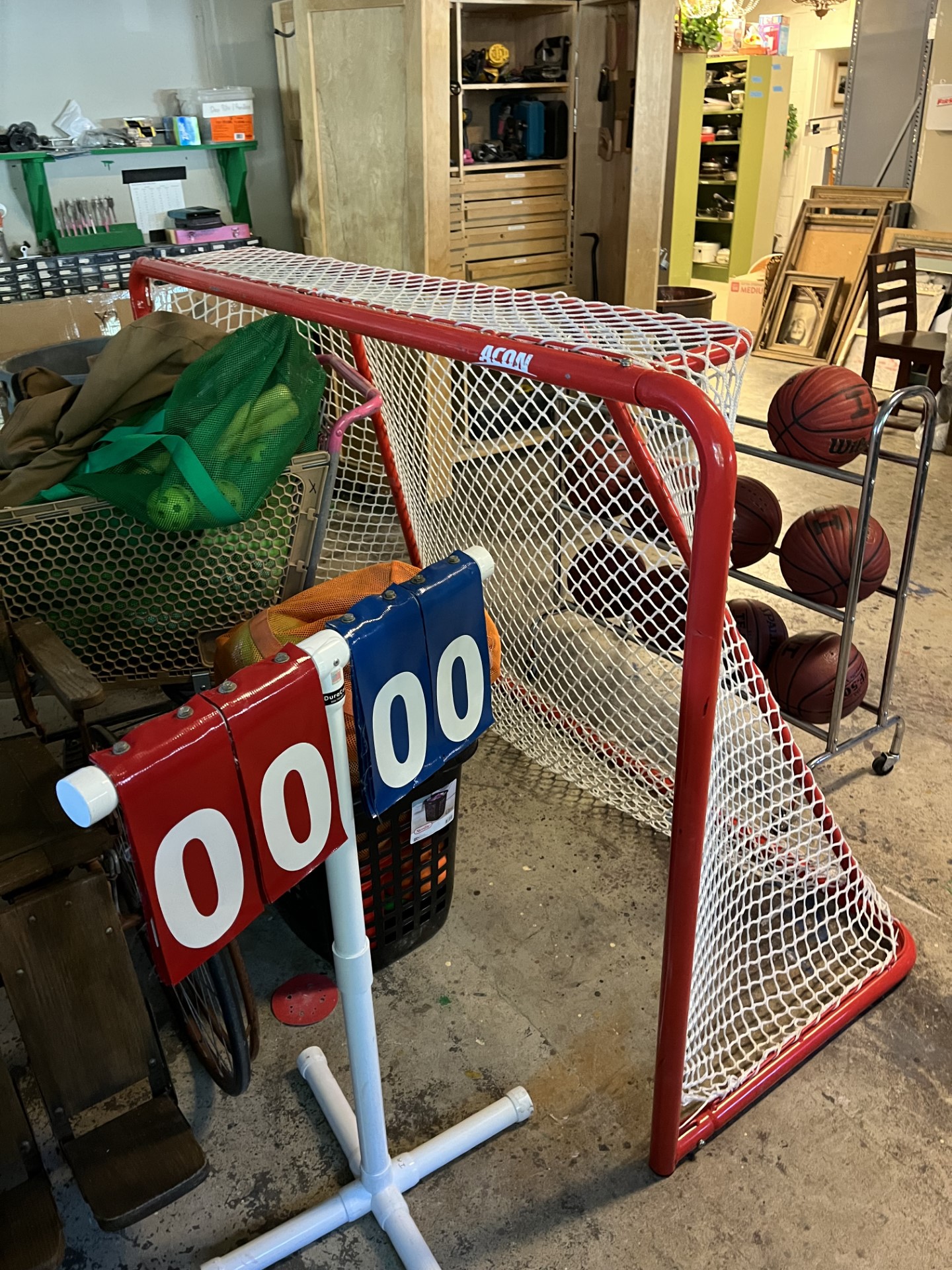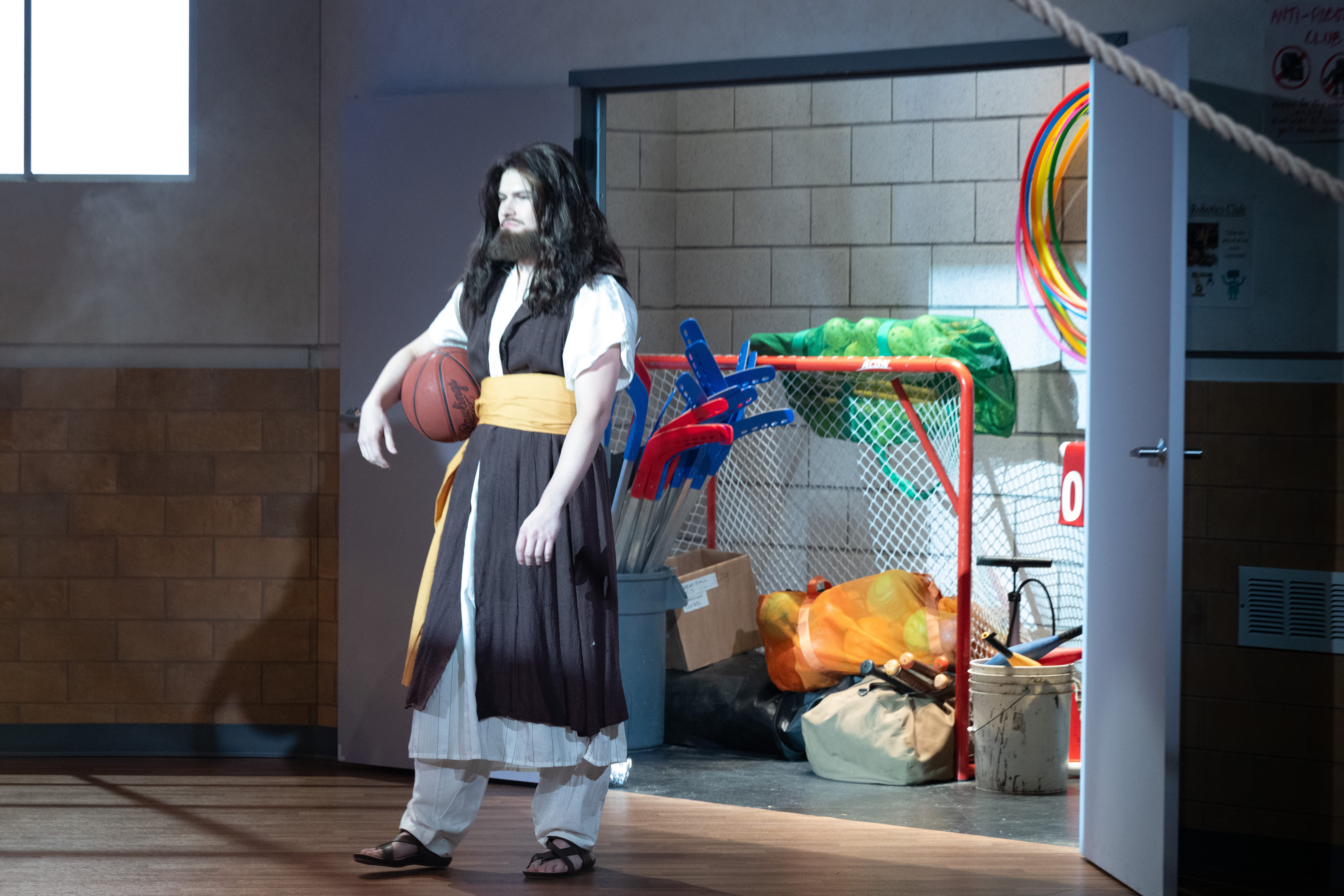 We borrowed real sports equipment from intramurals at CSU, and I dressed the storage closet with these and a few items from our stock.