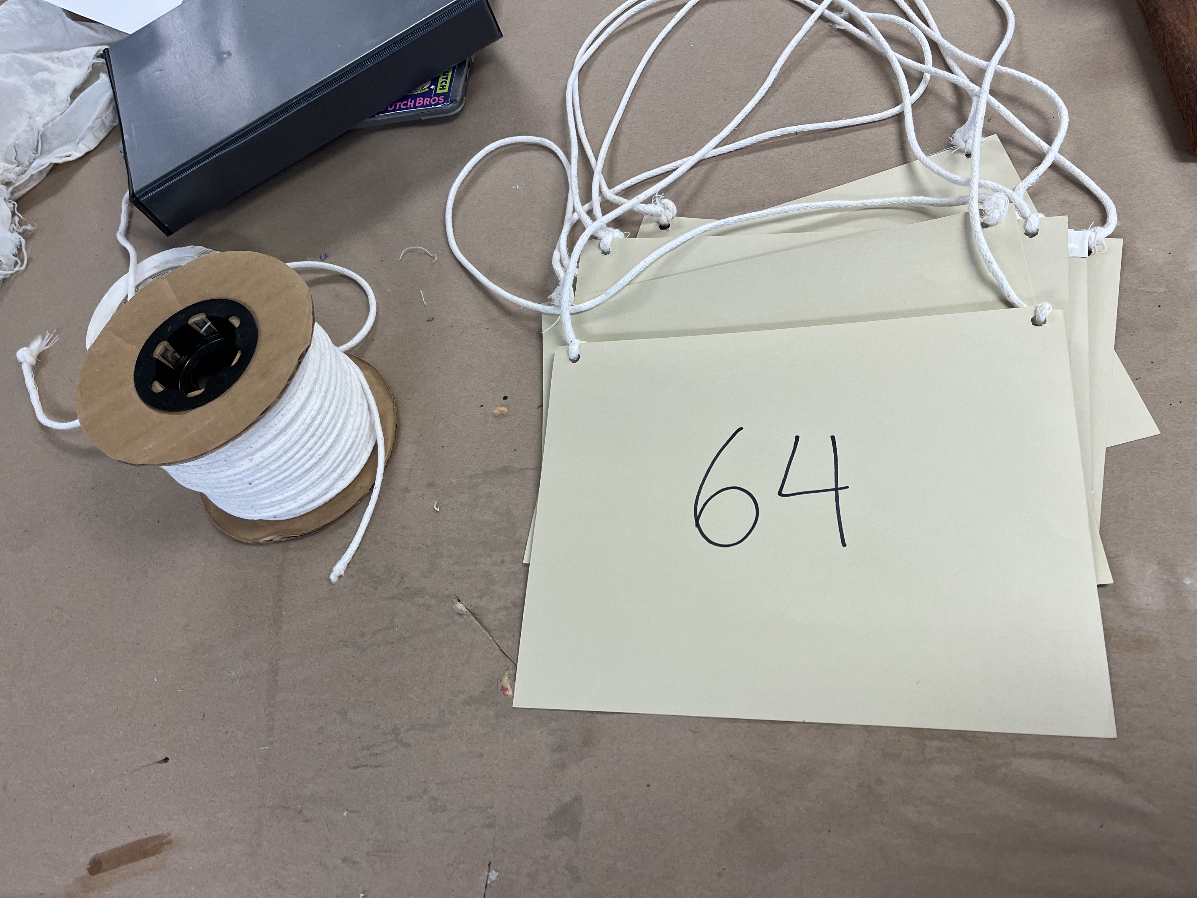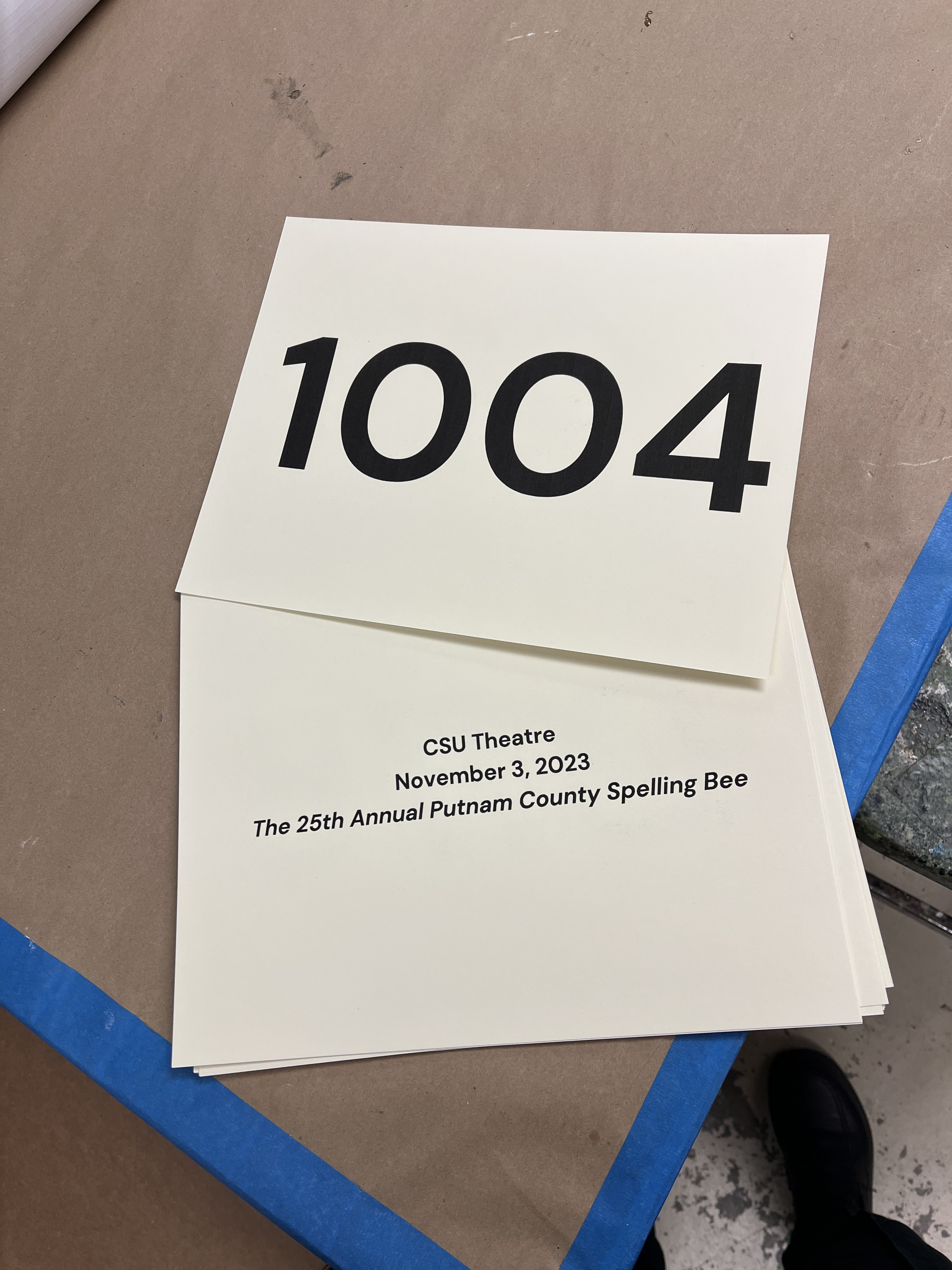 The placards for the main cast were printed one-sided and laminated before being covered with a clear matte spray to reduce glare under stage lights. The audience member placards were reprinted nightly with that performance’s date and volunteers got to take them home as souvenirs. The audience placards used strange numbers to differentiate them from the main cast.