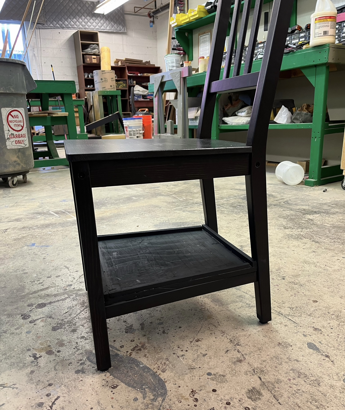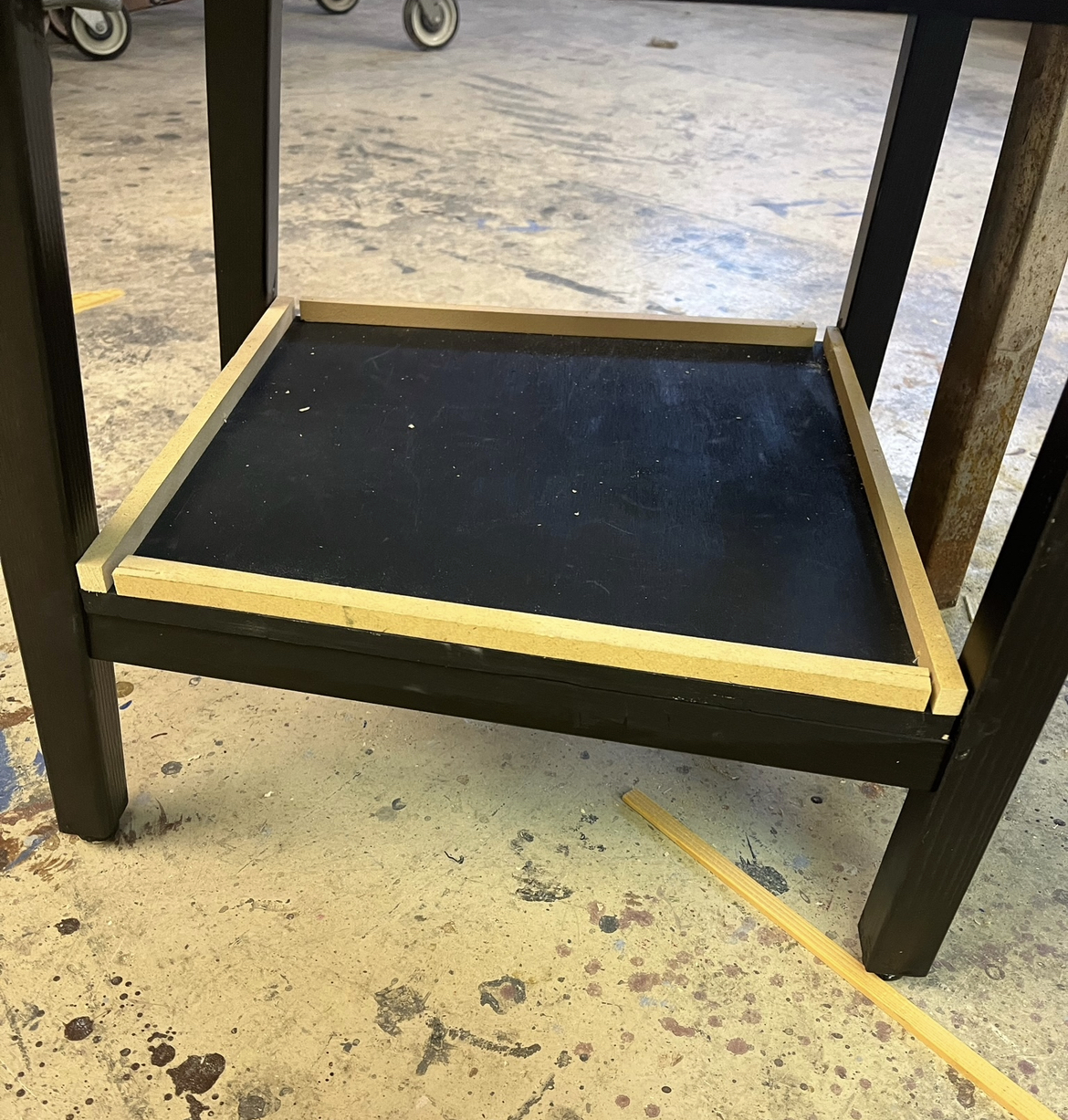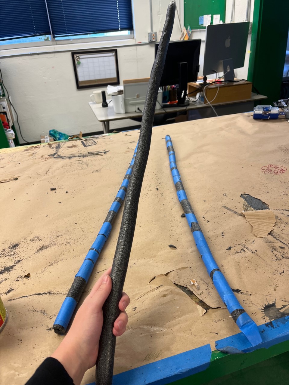 I used a jigsaw to cut out pieces for the piano bench before sanding it and assembling it with wood glue and a nail gun. I also assisted Rachel Ross in constructing the piano and adding casters. I made yardsticks for the piano teacher using the miter saw. For the students’ chairs, I cut and attached pieces of wood to the bottom for under-chair storage and painted them black. For the switches, Jay Duckworth, Rachel Ross, and I carved out the center of foam rods using a Dremel tool before adhering bamboo sticks to the inside. We did this because it made a loud noise when used, but was soft enough to not hurt anyone. We wrapped the switches with tape to allow them to dry without gaps showing the bamboo. We made twelve of these in case any of them broke.