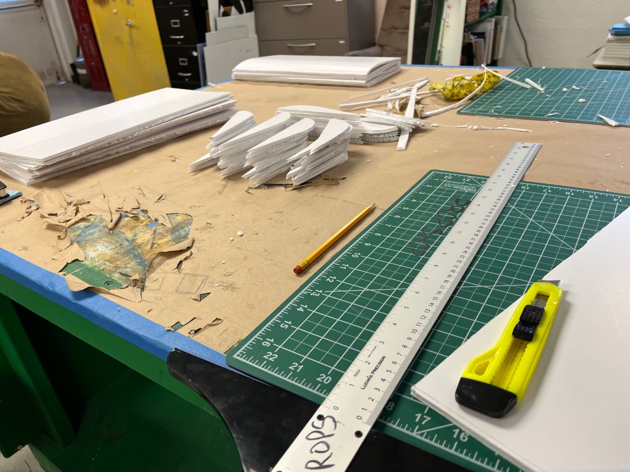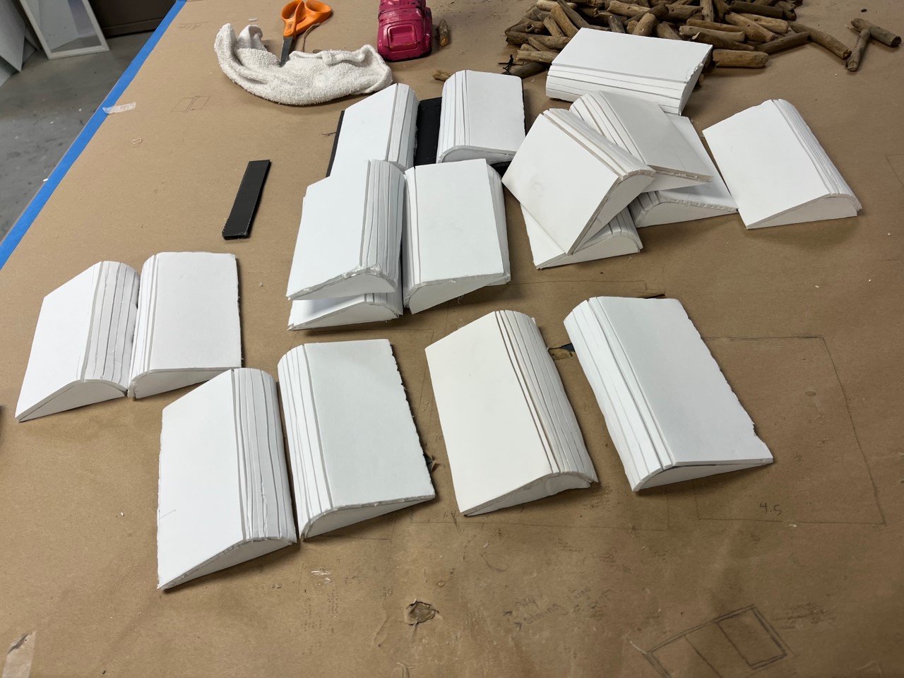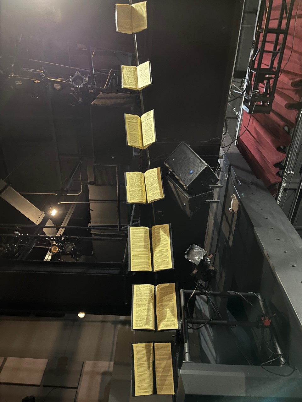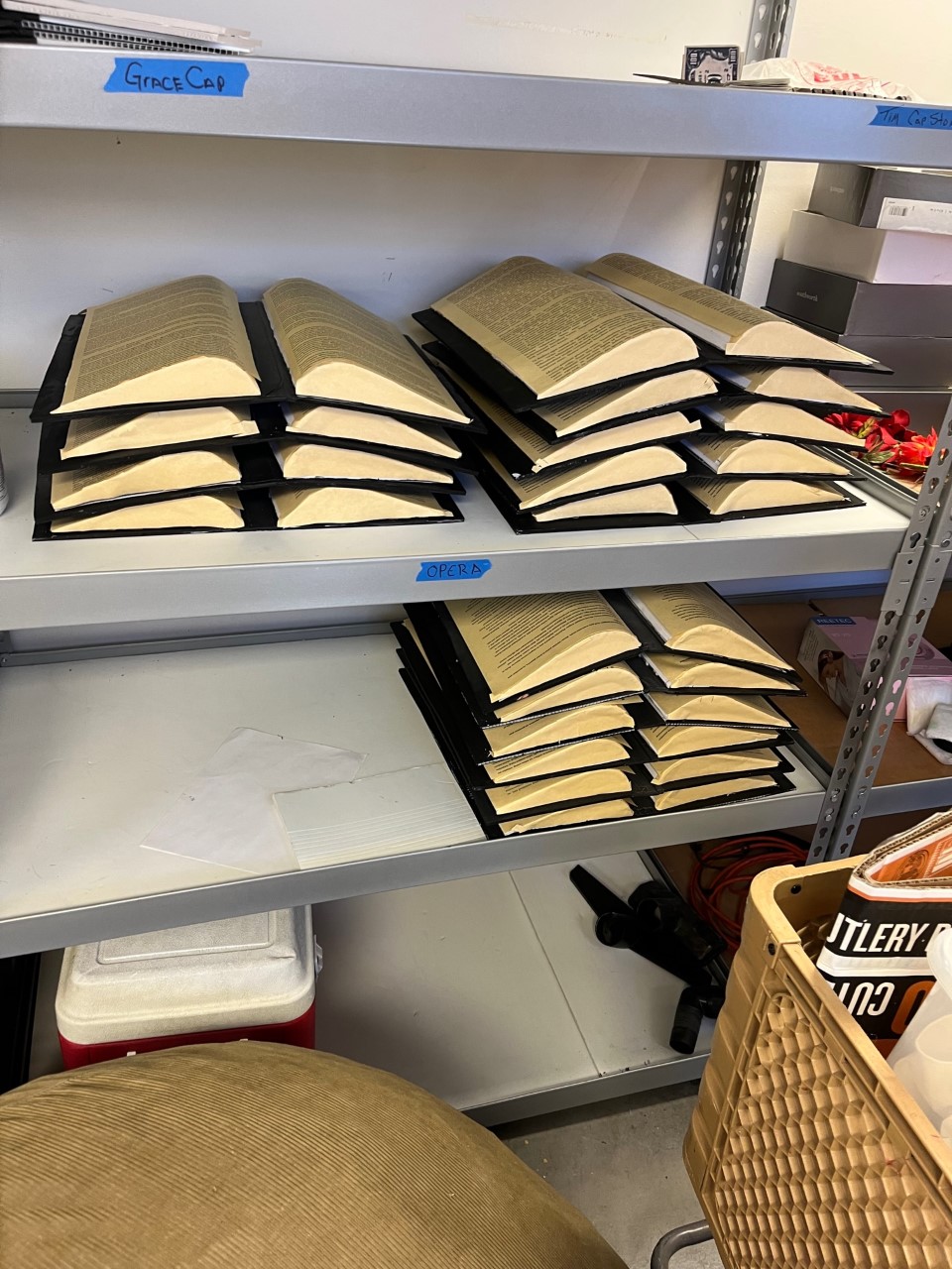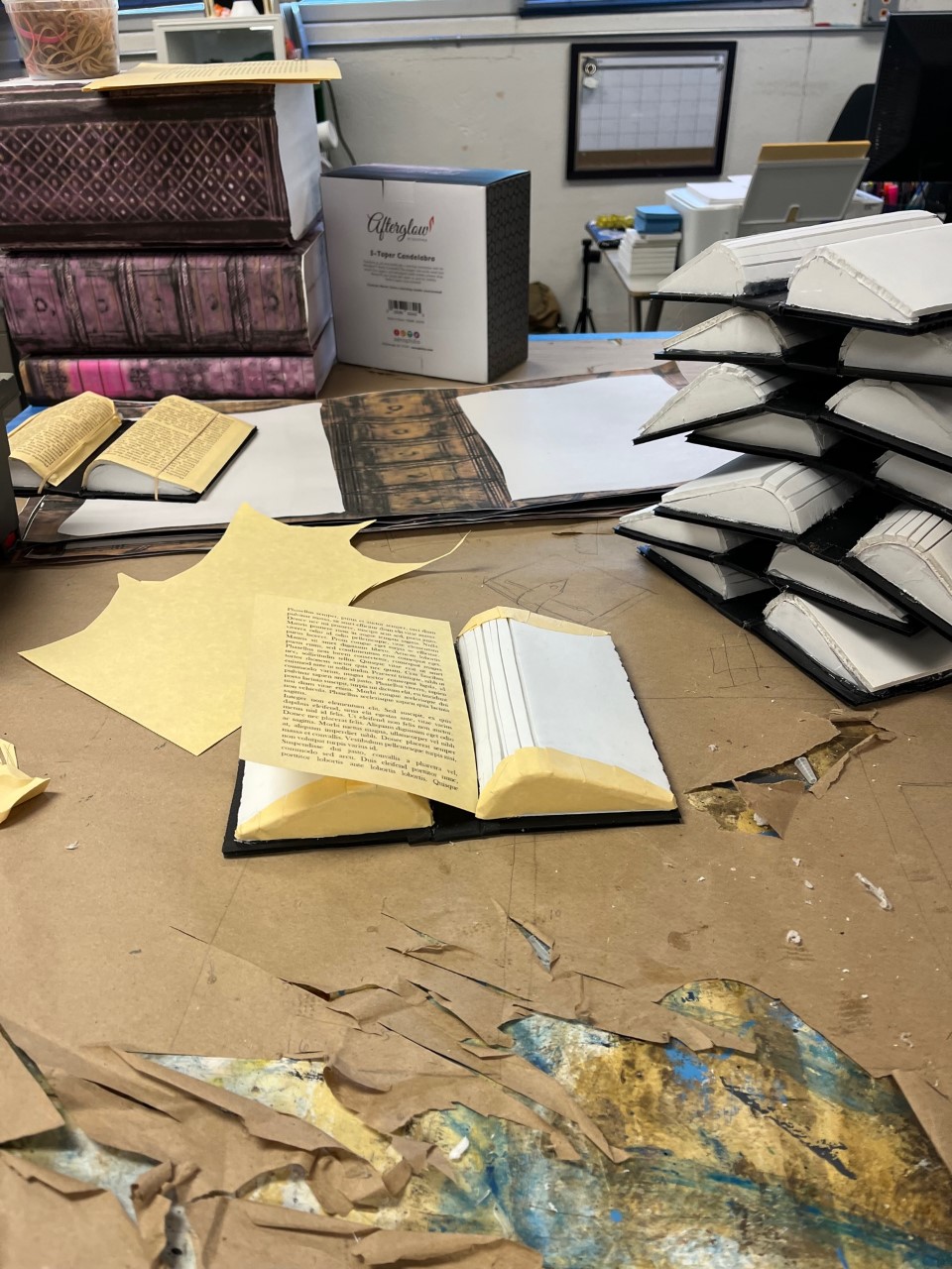 Most of the set was composed of books, and this included fifty fake books of increasing sizes to hang from the chandelier. To make these, we cut pages out of foam core and scored the foam to make the books look open. We attached black book covers onto the back, then we glued paper on top to make them look more like books.